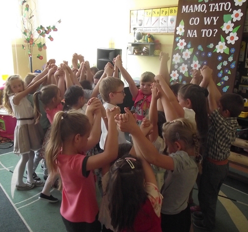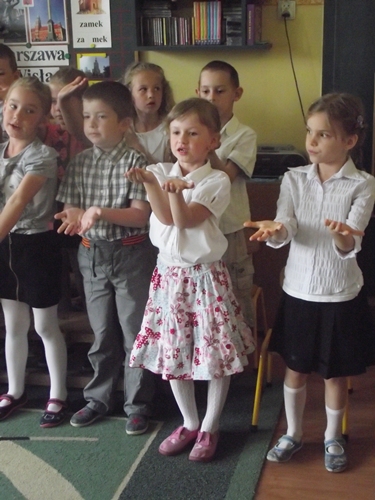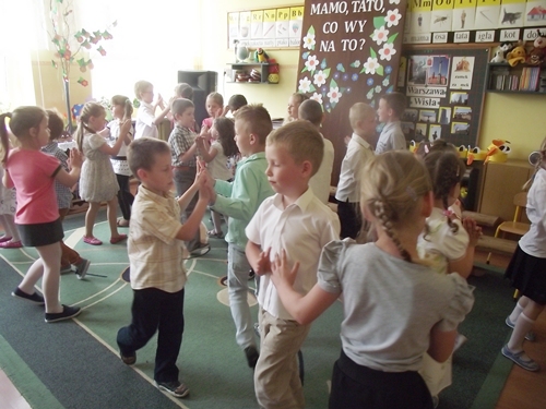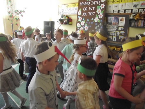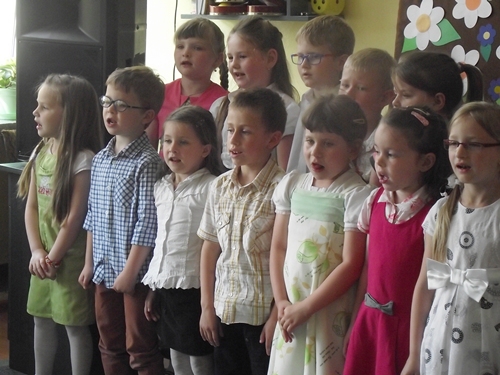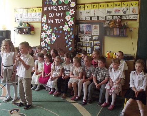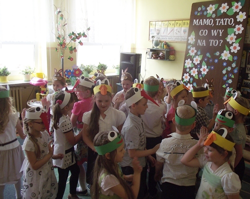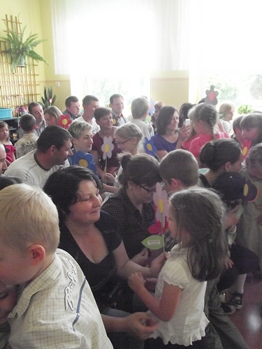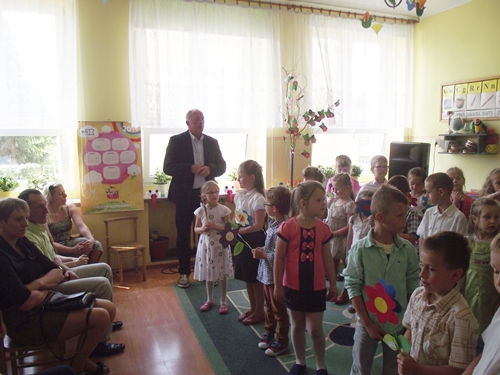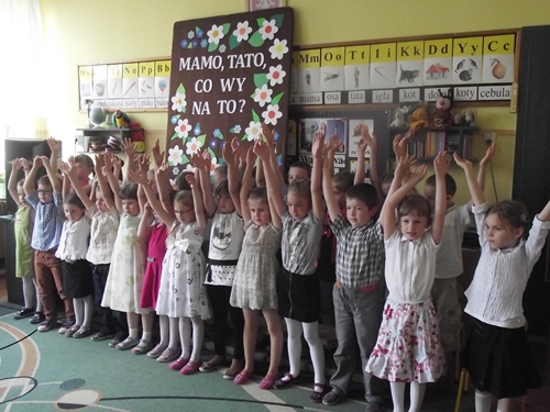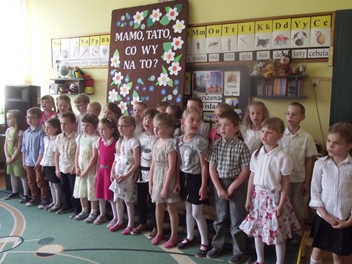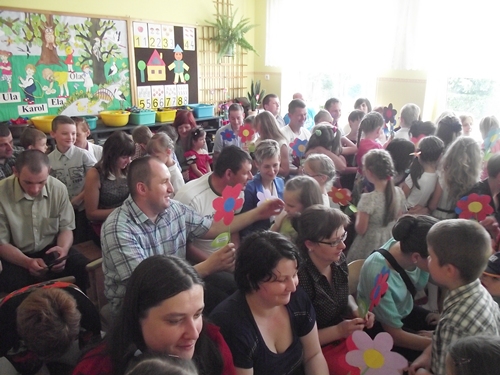 Dnia 26.05.2014r. w oddziale przedszkolnym dzieci 5-6 letnich odbyło się rodzinne spotkanie pod hasłem: "Mamo, tato, co wy na to?". Na uroczystość licznie przybyli również tatusiowie przedszkolaków. Gościem spotkania był dyrektor szkoły p. J. Baszczyński. Rodzice obejrzeli program artystyczny, na który złożyły się wiersze, piosenki oraz tańce. W ten sposób dzieci chciały wyrazić swą wdzięczność i miłość do swoich rodziców. Każdy rodzic obdarowany został własnoręcznie wykonanym przez dzieci kwiatkiem. Po części oficjalnej wszyscy spotkali się przy słodkim poczęstunku przygotowanym przez niezawodne mamy przedszkolaków. Był również czas na wspólną zabawę przy muzyce.