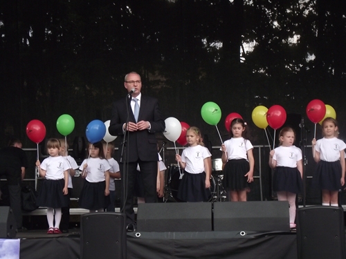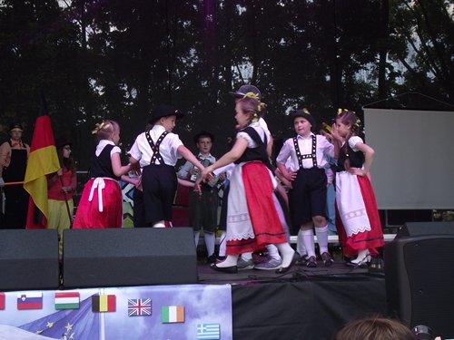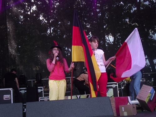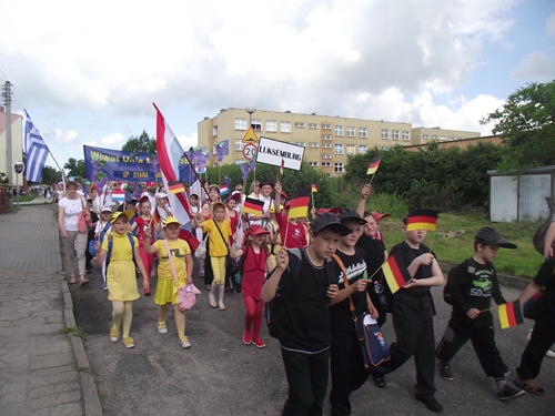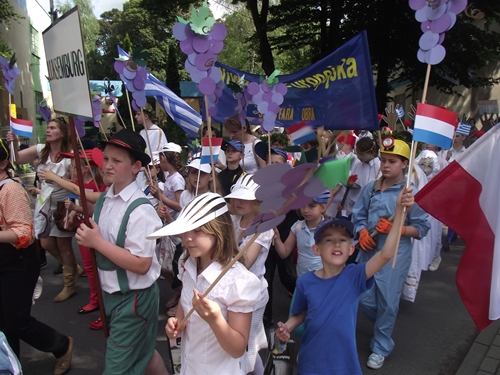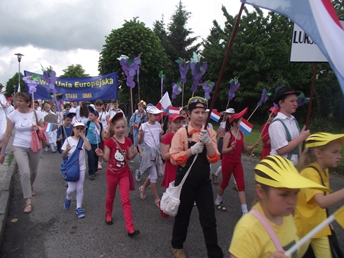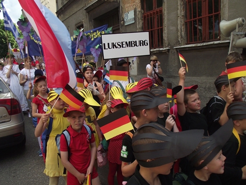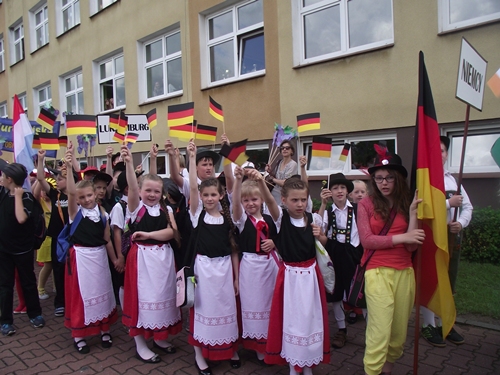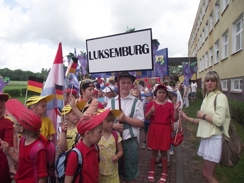 Uczniowie naszej szkoły w piątkowe przedpołudnie wzięli udział w barwnym korowodzie państw członkowskich Unii Europejskiej ulicami Koźmina Wlkp. Obchody 10 - lecia Polski w Unii Europejskiej oraz 25 - lecie przemian demokratycznych w Polsce to uroczystości, które rozpoczynały tegoroczne Dni Koźmina Wlkp. Podczas pochodu nasza szkoła reprezentowała Niemcy i Luksemburg. Uczniowie przebrali się w stroje w kolorach flag tychże państw. Podczas prezentacji "Obywatele Europy" na koźmińskiej scenie dzieci przedstawiły charakterystyczny taniec niemiecki, a Julka i Marta zaśpiewały polsko - niemiecki utwór "Keine Grenzen - Żadnych Granic".
