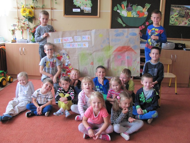 Dzieci z oddziału "O" wiedzą, że o środowisko należy dbać . Wspólnymi siłami wykonały plakat "Ziemia to nie śmietnik" promując działania ekologiczne. Brały również udział z młodszymi kolegami w akcji „Sprzątanie świata"
