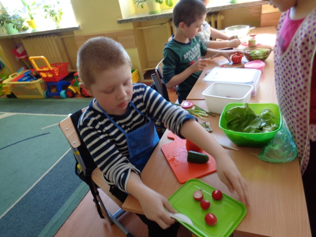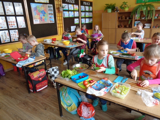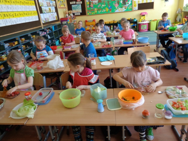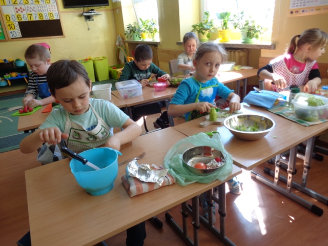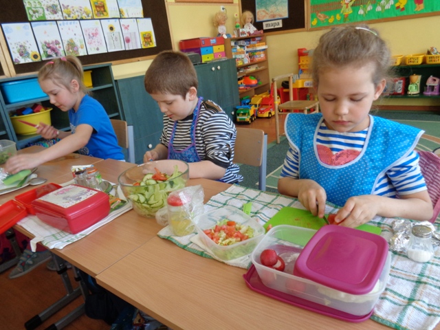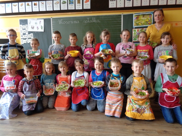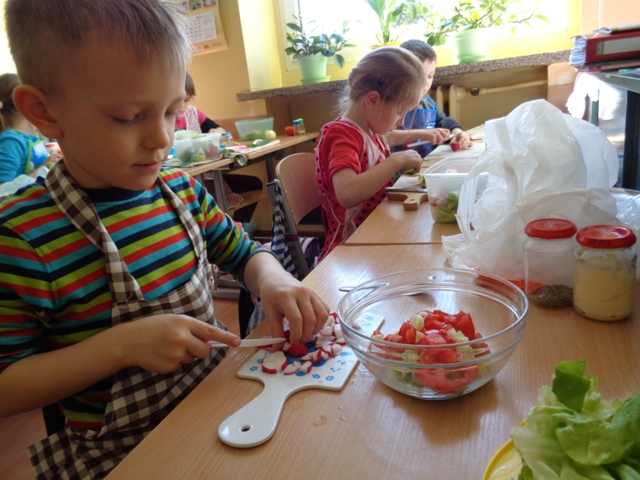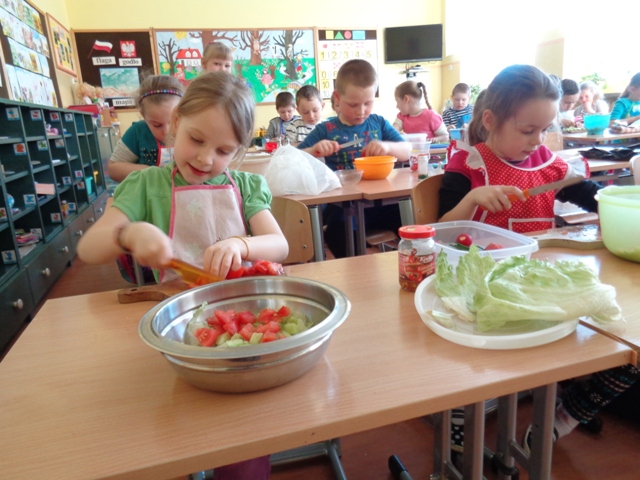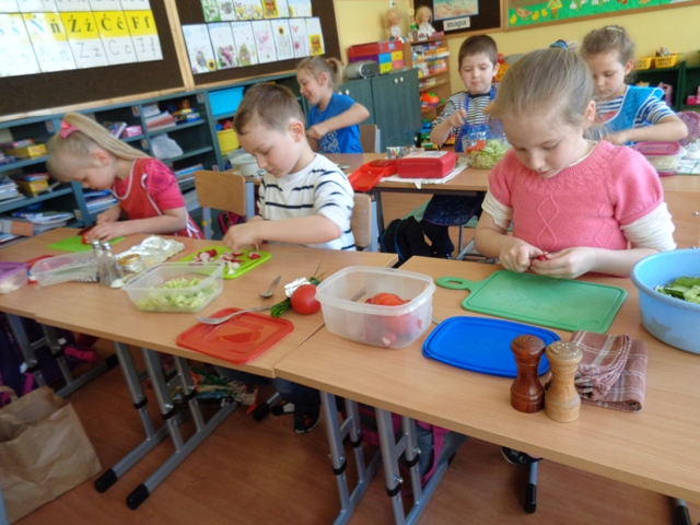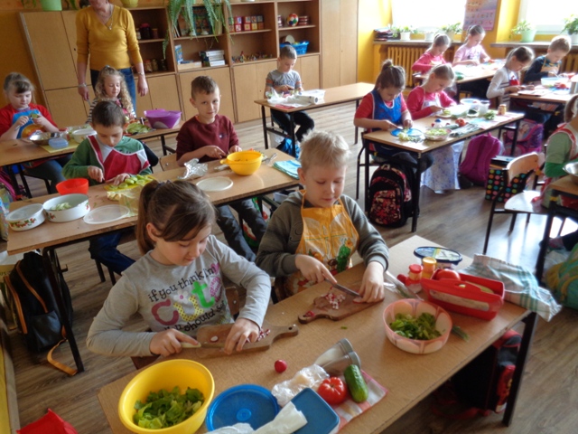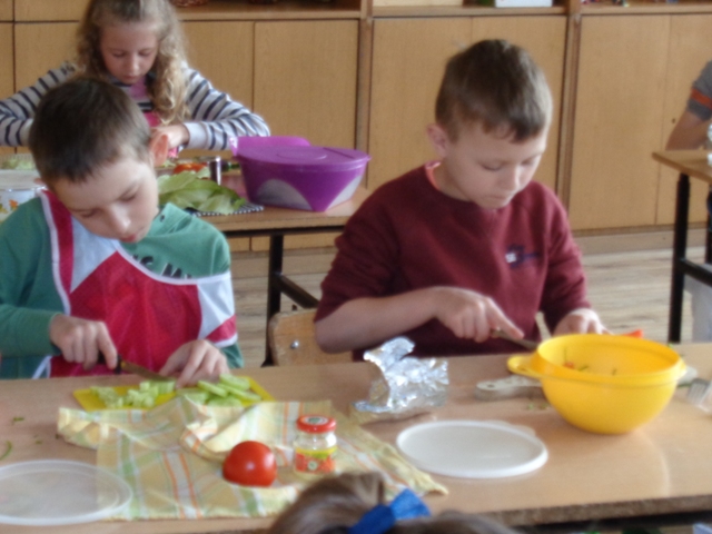 Uczniowie klasy IA i IB podczas zajęć przygotowywali sałatki warzywne. Zaopatrzeni w podstawowe akcesoria kuchenne z zapałem kroili składniki, mieszali je i doprawiali. Sałatka była wspaniałym urozmaiceniem drugiego śniadania. Każdy pierwszoklasista przypomniał sobie jak ważne w diecie są warzywa, ile zawierają cennych witamin i minerałów. Przygotowywanie sałatek warzywnych było także nawiązaniem do programów prozdrowotnych realizowanych przez naszą szkołę.