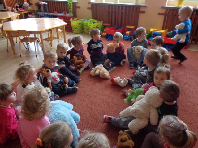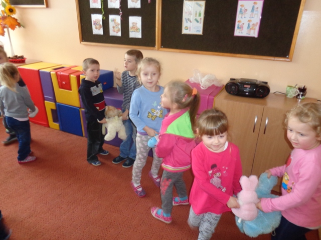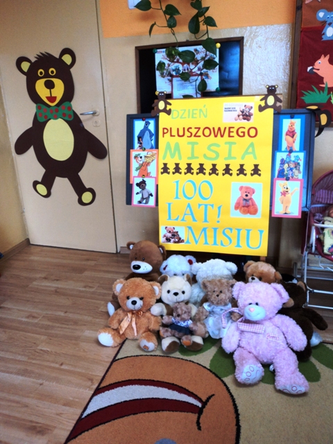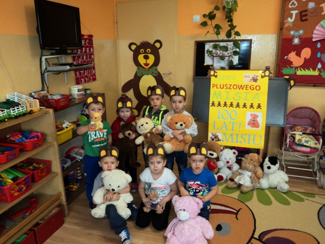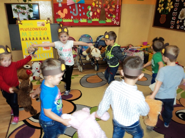 Dzieci wysłuchały historii powstania Dnia Pluszowego Misia, rozwiązywały zagadki obrazkowe sławnych, bajkowych misi. Była świetna zabawa przy „misiowych” piosenkach, tańce indywidualne i w kole. Nauczyliśmy się piosenki o niedźwiadku, połączonej z zabawą ruchową. Dzieci przedstawiały swoje misie oraz bawiły się z nimi w chowanego. W ramach przerwy w świetnej zabawie wszyscy zostali poczęstowani słodką, misiową przekąską.