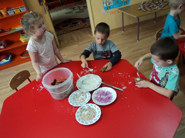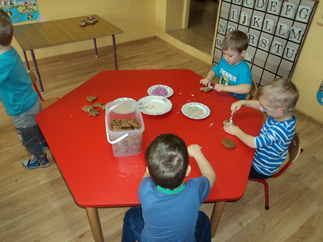 Przedszkolaki z Wrotkowa podobnie jak ich starsi koledzy, zadbali o to by na święta Bożego Narodzenia nie zabrakło tradycyjnych PIERNICZKÓW. Maluchy zajęły się dekorowaniem pierników upieczonych wcześniej przez panią Kamilę Paterek. Poszły w ruch kolorowe posypki i lukier, który był wszechobecny (nie tylko na piernikach) :) W całym przedszkolu zapachniało świętami, a dla dzieci była to super zabawa i pyszny, słodki poczęstunek.