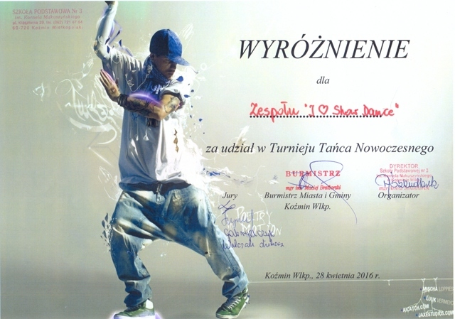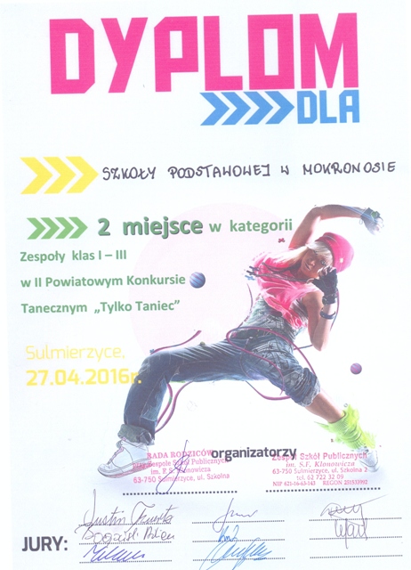 20-osobowa grupa taneczna, przygotowywana przez panią Katarzynę Wicenciak-Duda, zaprezentowała swoje umiejętności w dwóch konkursach tanecznych. Pierwszy odbył się 27.04.2016 w Sulmierzycach, gdzie nasze dziewczynki zajęły zaszczytne II miejsce. Drugi miał miejsce w SP Nr 3 w Koźminie Wlkp. w dniu 28.04.2016 r. , gdzie dziewczynki otrzymały wyróżnienie.