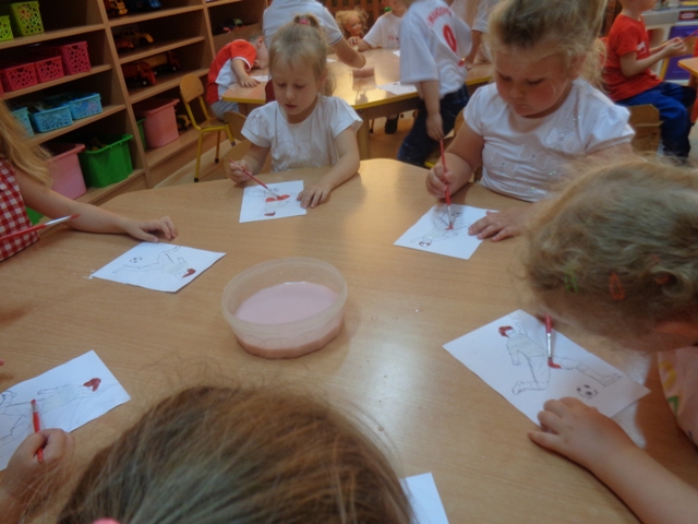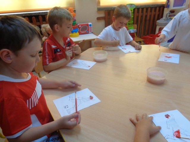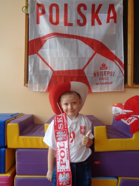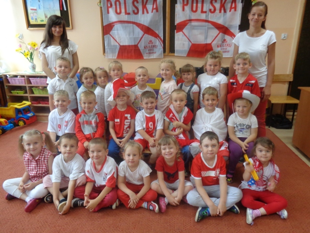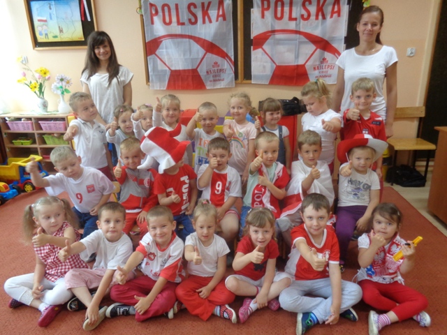 W czwartek 16 czerwca br., przedszkolaki z oddziału dzieci młodszych w Mokronosie przyłączyły się do wspólnego kibicowania polskiej reprezentacji na Euro 2016. Tego dnia dzieci miały na sobie biało-czerwone stroje i przyniosły do przedszkola gadżety kibica. Zajęcia tematycznie nawiązywały do tych piłkarskich wydarzeń, m.in. dzieci malowały farbami postać polskiego piłkarza. Wielkie kibicowanie w przedszkolu na pewno pomogło naszym piłkarzom we Francji. Otóż tego samego dnia wieczorem Polacy wygrali z Ukrainą 1:0