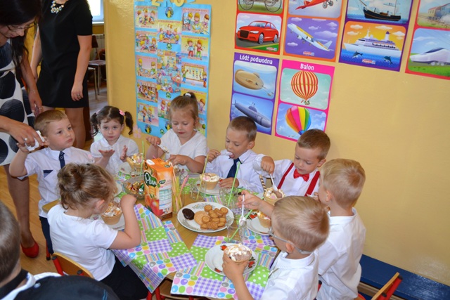 Po części artystycznej przyszedł czas na słodki poczęstunek, wszystkich ugoszczono pysznym deserem lodowym i kawą. Dziesięć miesięcy wspólnych zabaw i zajęć, podróży po porach roku szybko minęło, aż nadszedł czas wakacji i pożegnań.