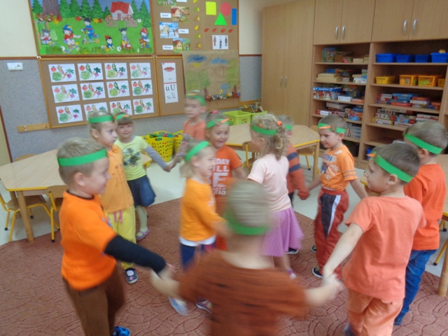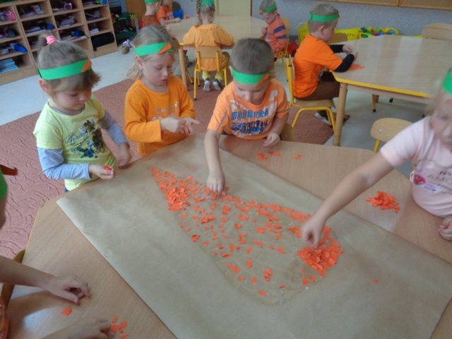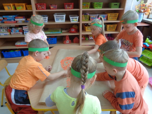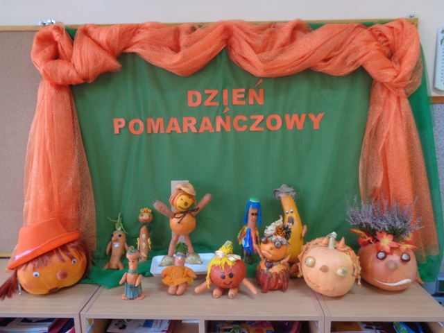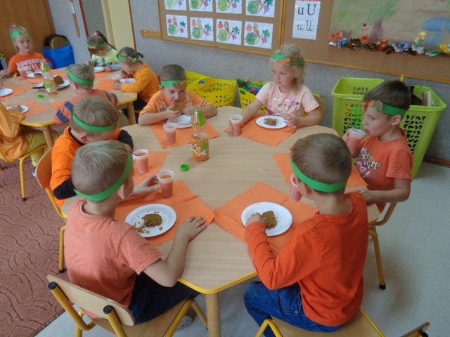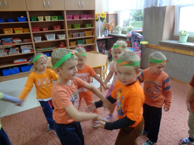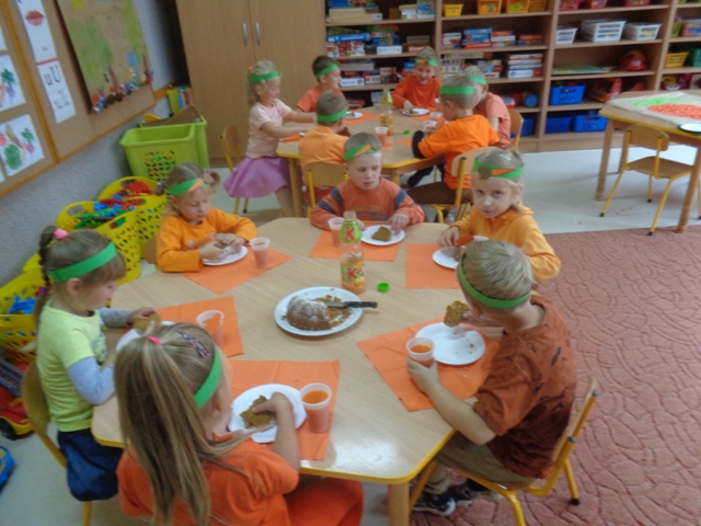 W poniedziałek 3 października br. w grupie dzieci 5 letnich od rana królował „ Dzień pomarańczowy’’. Dzieci przyszły do przedszkola ubrane na pomarańczowo, a w ręku trzymały kukiełkę wykonaną wspólnie z rodzicami z warzyw i owoców w kolorze pomarańczowym. Przedszkolaki z dumą prezentowały swoje prace. W ten sposób chciały uczcić „Święto Marchewki” w naszej grupie . Impreza dzieciom bardzo się podobała. Wszystkie nasze działania tego dnia były związane tematycznie z marchewką – zabawy ruchowe ze śpiewem piosenki „ Urodziny marchewki’’, wysłuchanie bajki pt. „Królewna Marchewka”, zagadki i tańce integracyjne przy muzyce. Nie zabrakło też rozmów o charakterze prozdrowotnym. Przedszkolaki dowiedziały się o właściwościach odżywczych i leczniczych a także ,co można wyczarować z tego warzywa .Wykonały tez wspólną pracę , wypełniając kontury warzywa kawałkami papieru. Po tak wyczerpującej pracy dzieci wraz z panią przystąpiły do degustacji babki i soku marchewkowego. Wszystkie prace zostały nagrodzone. Ten dzień był wyjątkowy : zdrowy, witaminowy i marchewkowy.