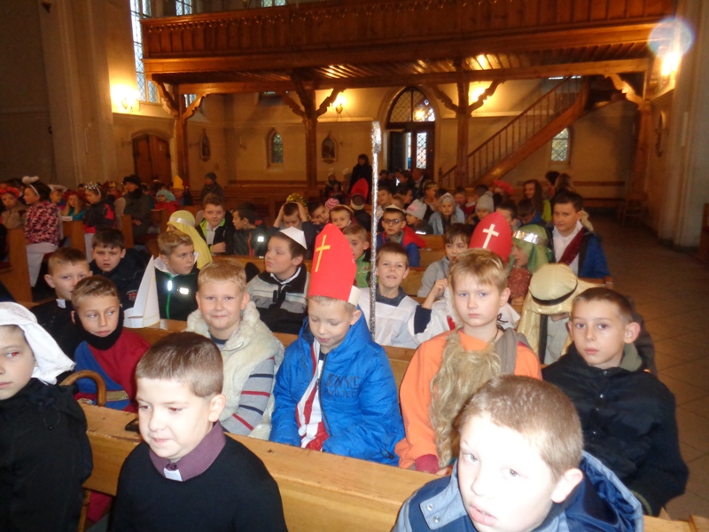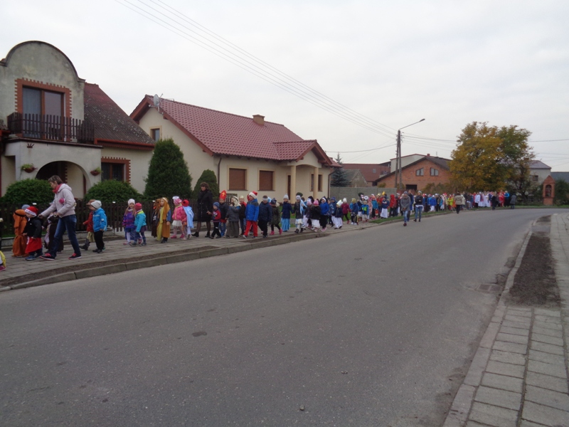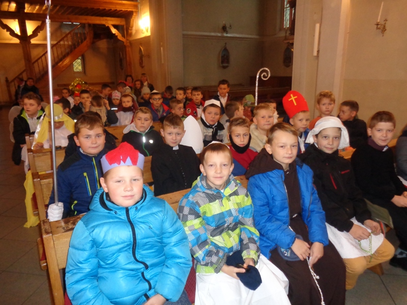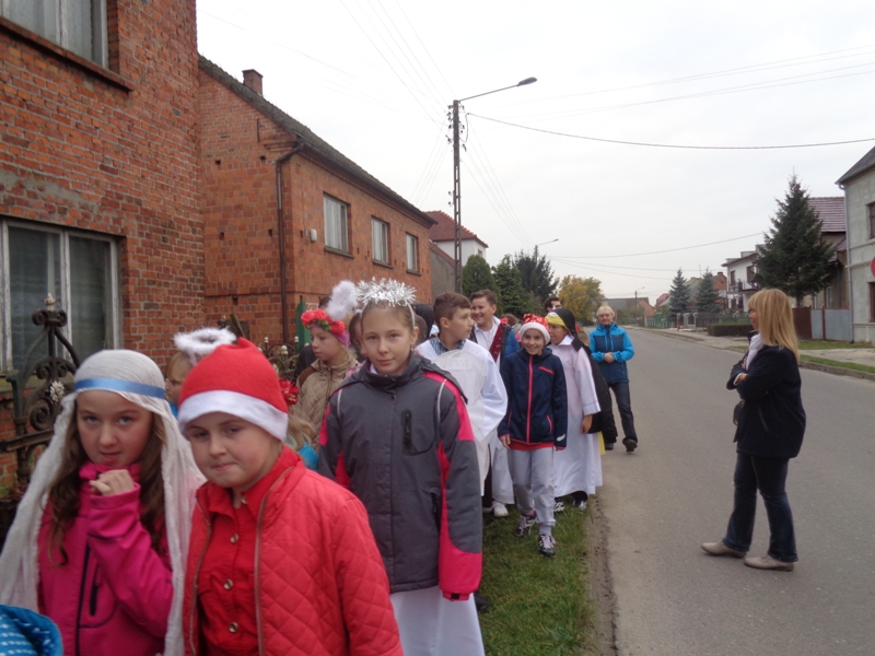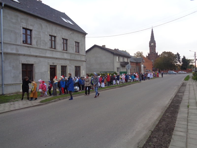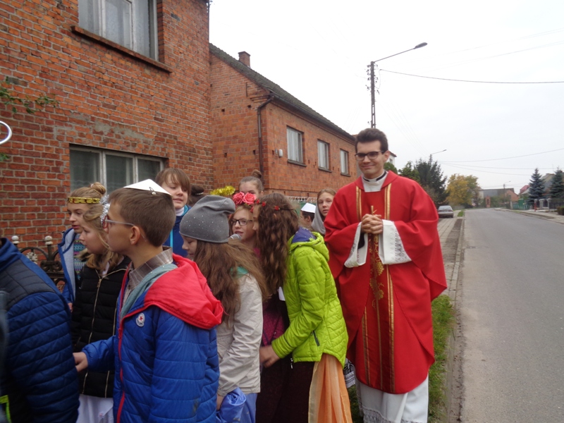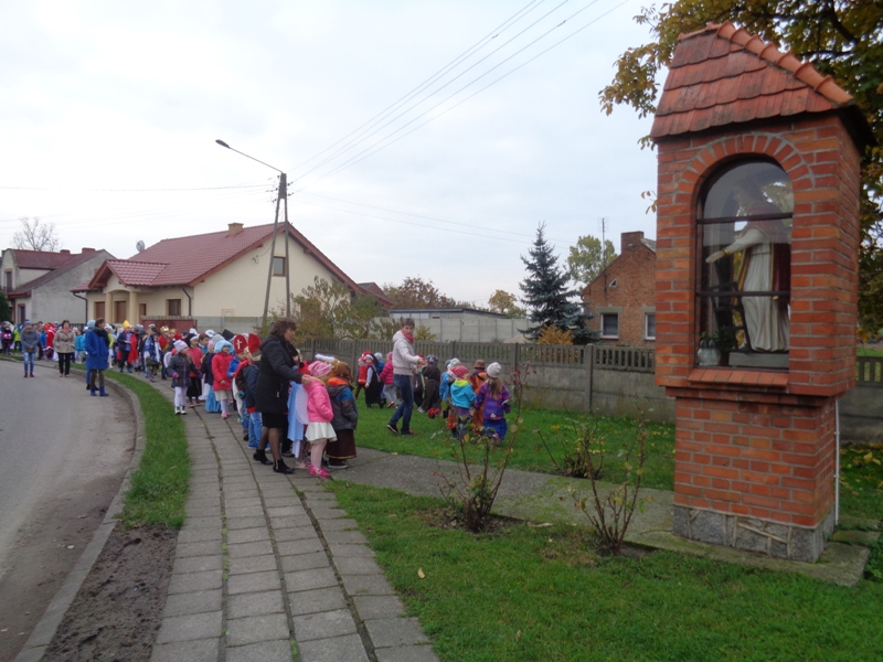 W czwartek 27 października br. w naszej szkole obchodziliśmy „Dzień Wszystkich Świętych”. Wszyscy uczniowie przebrali się za postacie świętych. Udaliśmy się na przemarsz po naszej miejscowości śpiewając radosne pieśni wychwalające Boga. Następnie udaliśmy się do Kościoła, gdzie ksiądz Krzysztof przypomniał nam w krótkim rozważaniu co to znaczy być świętym i jak w naszym codziennym życiu dążyć do świętości. Na koniec odmówiliśmy różaniec w intencji wszystkich zmarłych, zwłaszcza z naszych rodzin. Z uśmiechem na twarzy wróciliśmy do szkoły. Inicjatywa cieszyła się dużym zainteresowaniem i zaangażowaniem dzieci i rodziców, więc pewnie wpisze się na stałe w szkolny kalendarz.