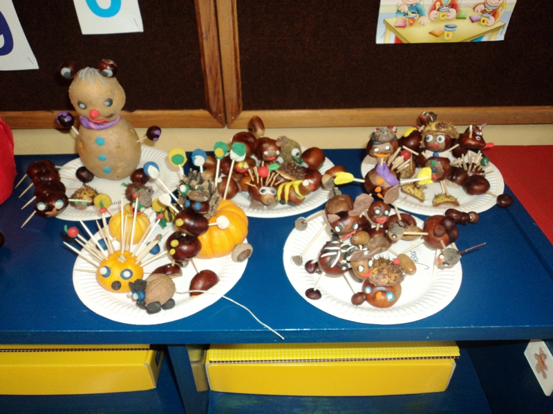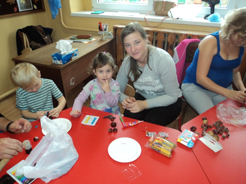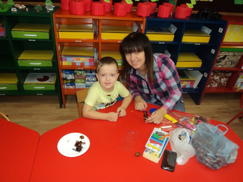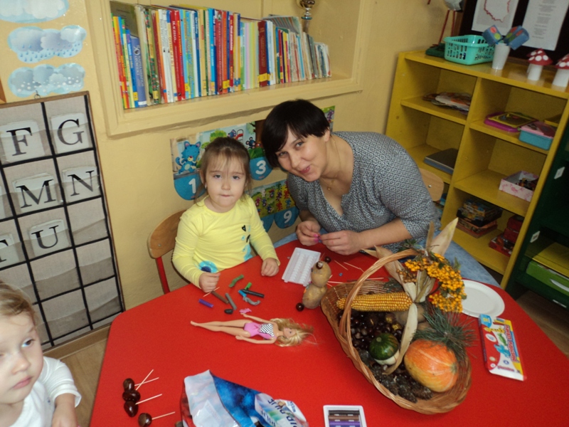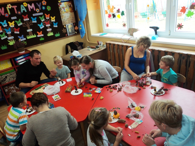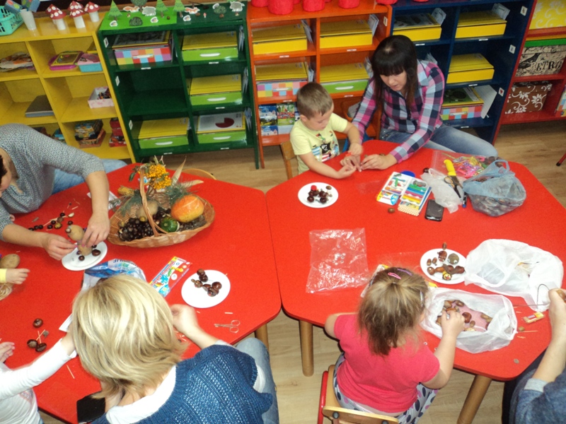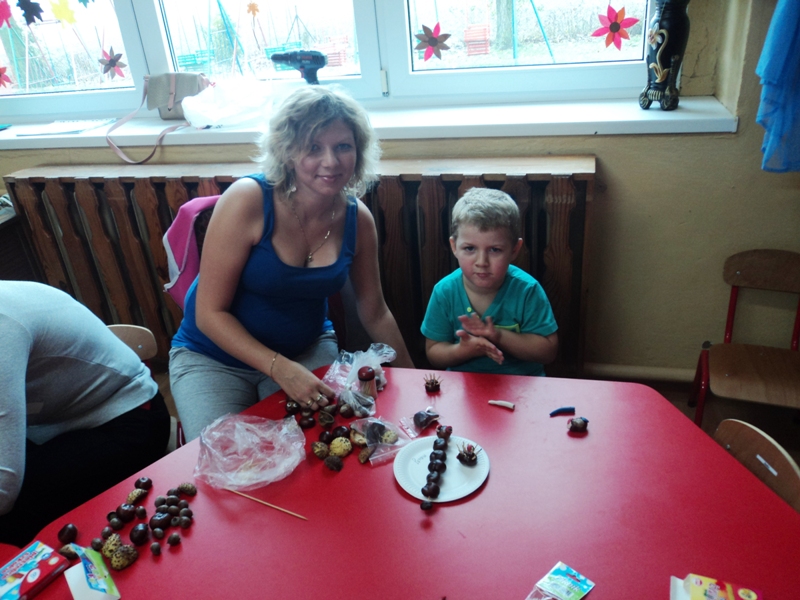 Nasi milusińscy zaangażowali rodziców do pracy i wspólnie z nimi wykonali kasztanowe ludziki. Wszyscy wykazali się niezwykłą inwencją twórczą, dlatego powstało mnóstwo pięknych zwierzątek, były jeże, żyrafy, ślimaki, gąsienice, myszki, niedźwiadki i wiele innych, powstały również wesołe ludziki. Praca sprawiła wszystkim mnóstwo frajdy.