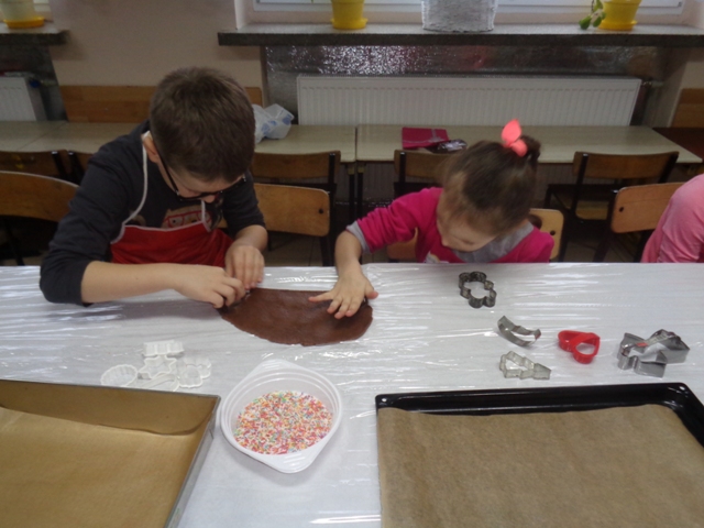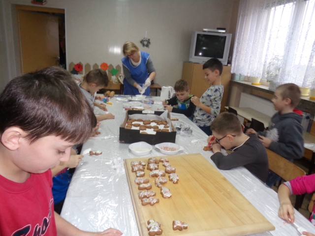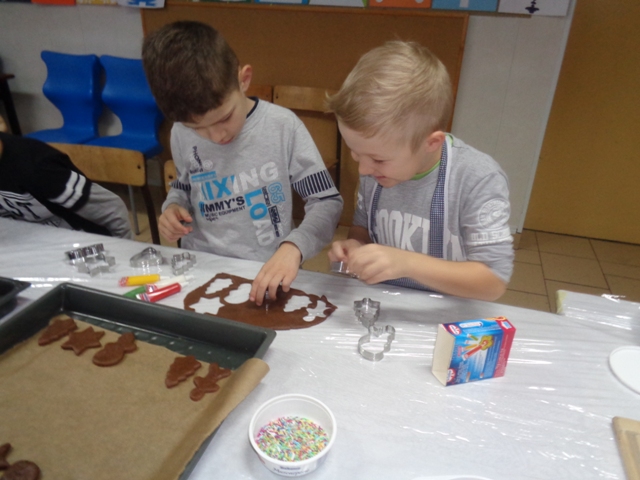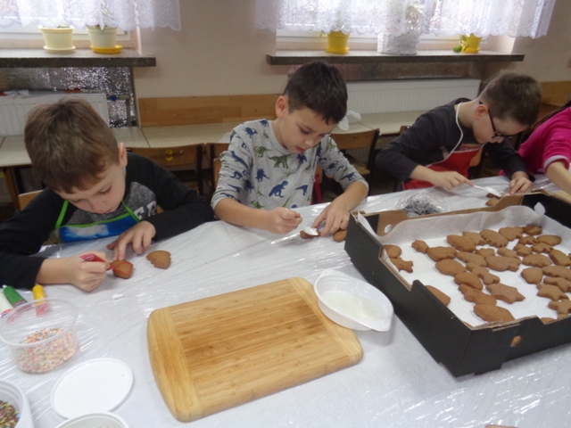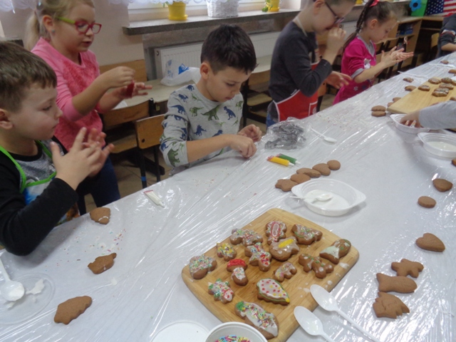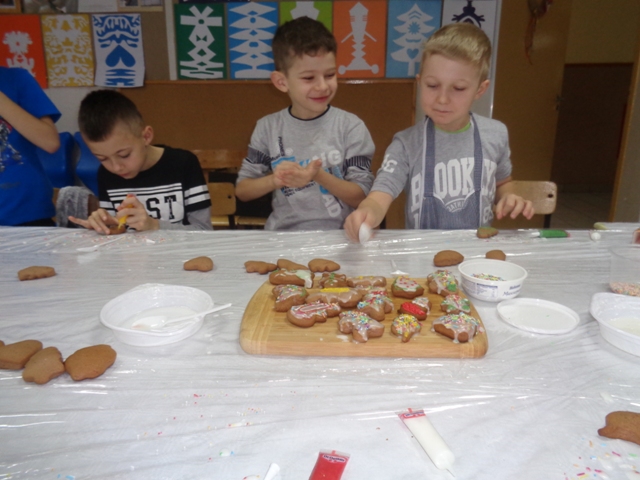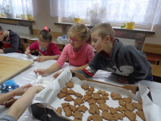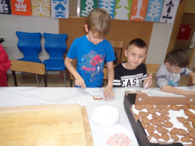 W dniu 20 grudnia br. uczniowie klasy II zgodnie z przedświąteczną tradycją upiekli pyszne świąteczne pierniczki z ciasta przygotowanego przez panią Monikę Marciniak. Z pomocą pań, praca z przygotowaniem wypieków szła sprawnie i bez trudu. Uczniowie poznawali składniki, potrzebne do wykonania ciasta. Wszystkim podobało się wykrawanie świątecznych kształtów – choinek, gwiazdek, bałwanków, aniołków, przy pomocy foremek. Następnie słodkie ciasteczka piekły się w szkolnej kuchni. Po korytarzach zaczął unosić się wspaniały zapach pieczonych pierniczków, który wprawił wszystkich w świąteczny nastrój. Gdy wypieki były już gotowe dzieci przystąpiły do ich dekorowania lukrowymi pisakami i barwnymi posypkami. Podczas pieczenia dzieci wysłuchały opowiadania o tradycjach bożonarodzeniowych, którą przygotowała pani Małgorzata Baranowska. Zabawa była doskonała, a pierniczki wyszły przepiękne.