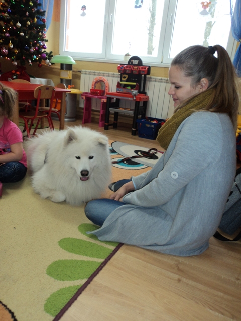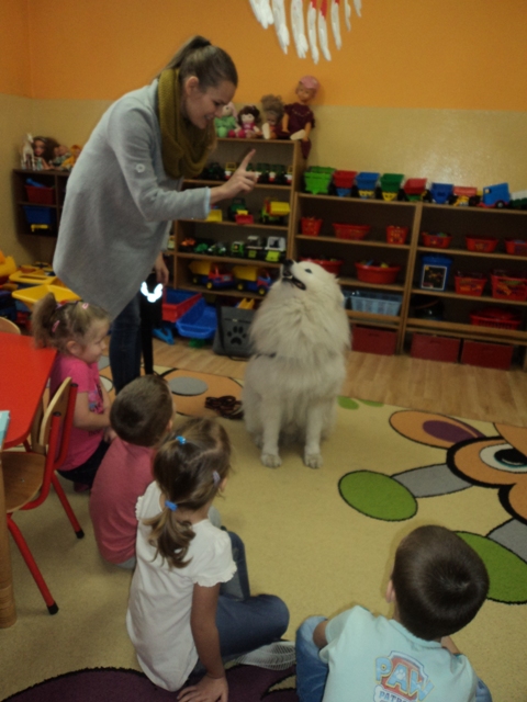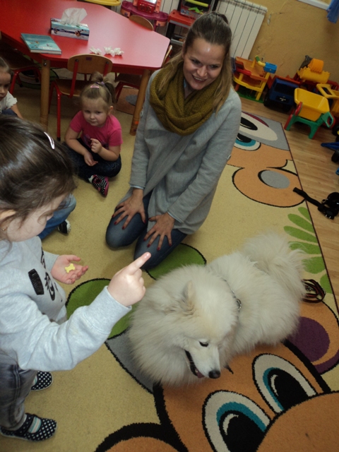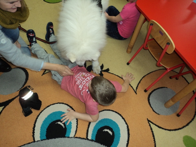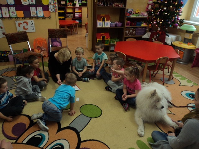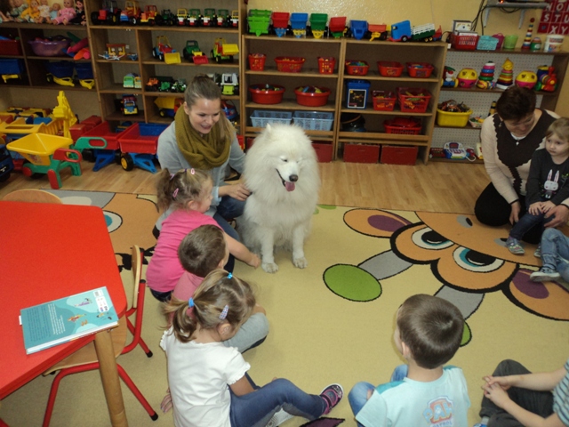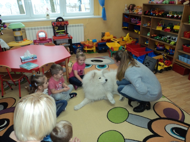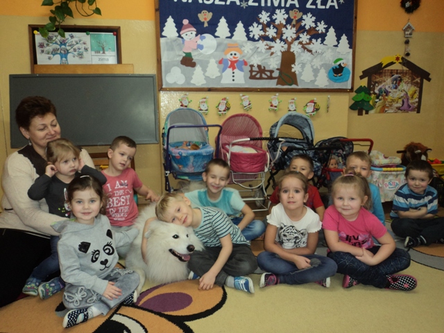 W ramach akcji „Poczytaj mi Mamo-Tato …!”, dnia 02.01.2017r. dzieci z Oddziału Przedszkolnego we Wrotkowie odwiedził wyjątkowy gość – czworonożny przyjaciel, pies Leon wraz ze swoją opiekunką panią Martą Nowak. Goście Ci przybyli do Nas na specjalne zaproszenie jednej z mam, pani Eweliny Kaniewskiej, za co jesteśmy jej bardzo wdzięczni. Podczas spotkania, przedszkolaki oprócz tego że wysłuchały bajki o wyjątkowym piesku czytanej przez mamę, poznały również zasady bezpiecznego kontaktu z psami, a także oswajały się z obecnością Leona. Dzieci przełamywały swój lęk przed czworonogiem, głaskały, przytulały, sprawdzały jaką pies ma sierść. Podczas zajęć były instruowane, co robić i jak postępować z psami. Dowiedziały się, jaką rolę w życiu człowieka pełni pies. Poznały również pozycję bezpieczną, która ochroni ich przed atakiem ze strony agresywnego zwierzęcia. Leon - najważniejszy gość tego dnia - wykazał się dużą cierpliwością do naszych maluchów, a także posłusznie wykonywał polecenia swojej Pani. Wizyta psa w naszym przedszkolu wniosła wiele nowych doświadczeń w życie nas wszystkich. Wspólna zabawa wywołała mnóstwo pozytywnych emocji.
