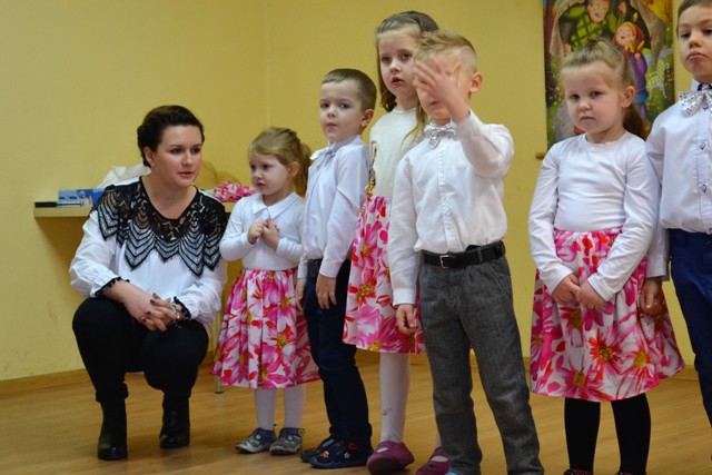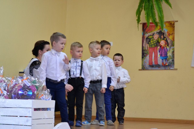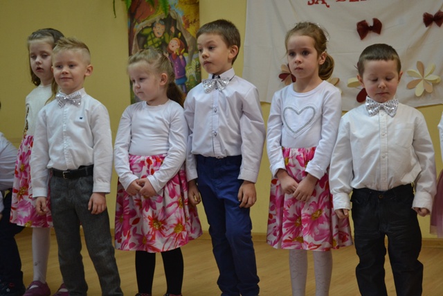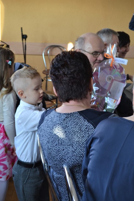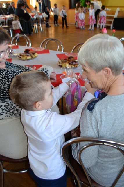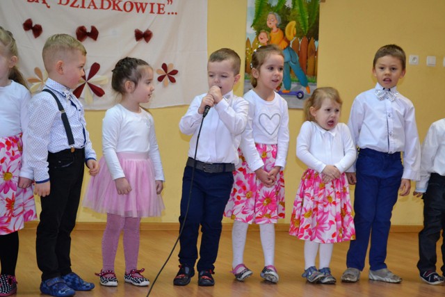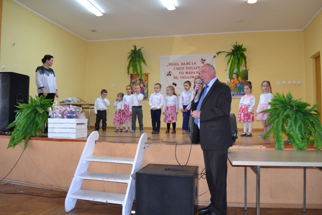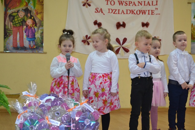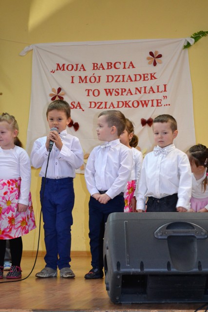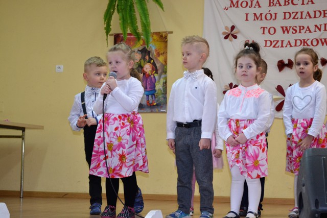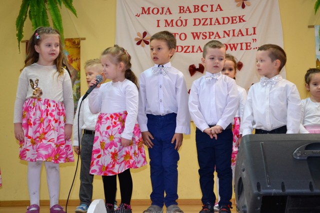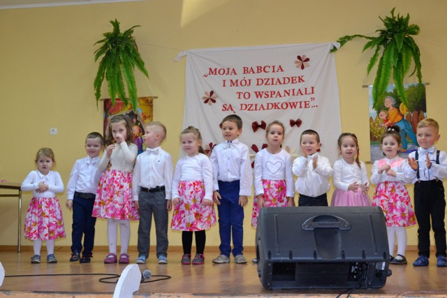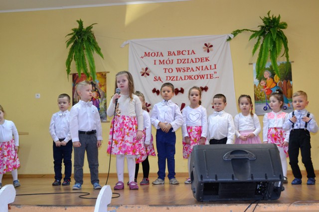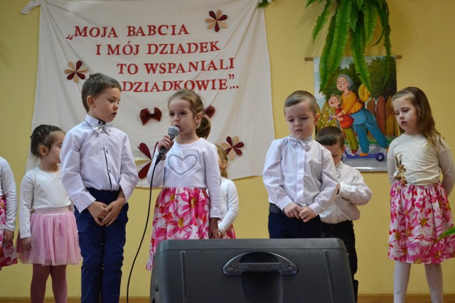 Dzieci wraz ze swoją wychowawczynią witały ciepłymi słowami szanownych gości, składając im serdeczne życzenia. Seniorzy mogli podziwiać umiejętności swych wnuków prezentujących wiersze, piosenki oraz tańce. Mali artyści z dużym przejęciem i zaangażowaniem występowali na dużej scenie. W ten sposób mogli podziękować swoim Dziadkom za trud włożony w ich wychowanie. Na zakończenie występu do życzeń dołączył się również pan Dyrektor Janusz Baszczyński. Wszystkie wnuczęta obdarowały swoich bliskich własnoręcznie przygotowanymi upominkami. Goście wielkimi brawami dziękowali za występy. Dopełnieniem uroczystego spotkania był słodki poczęstunek przygotowany przez niezawodnych rodziców. Święto Babci i Dziadka to dzień pełen uśmiechu, wzruszeń i radości.