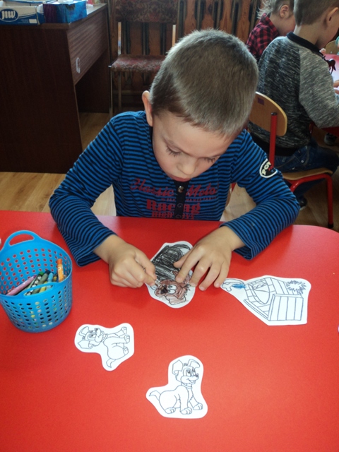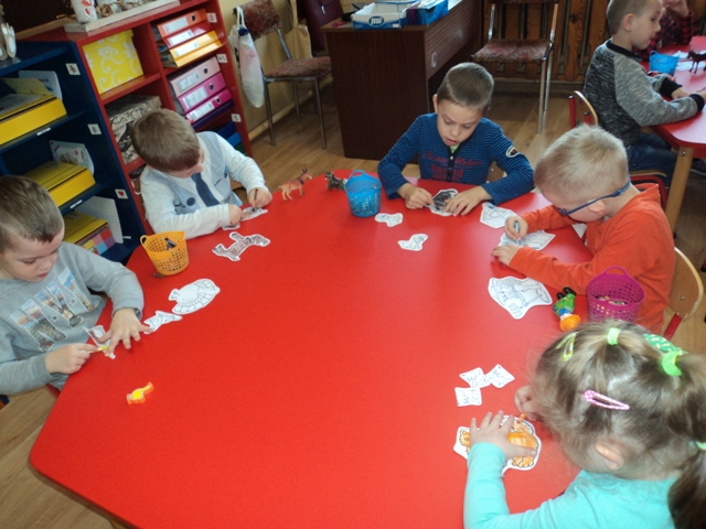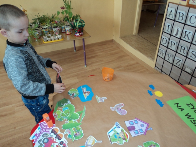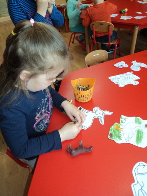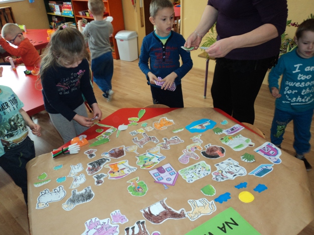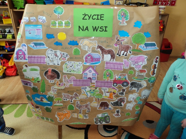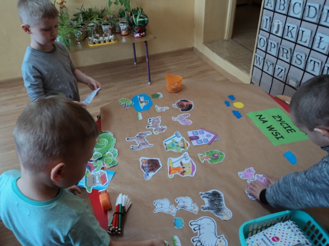 W przedszkolu we Wrotkowie w ostatnim tygodniu marca poruszana była tematyka „Życia na wsi”. Dzieci zapoznały się z tematem związanym z gospodarstwem wiejskim, mieszkającymi w nim zwierzętami oraz zwyczajami panującymi na wsi. Maluchy przeglądały ilustracje zwierząt, słuchały odgłosów z gospodarstwa. Niektórzy dopiero dowiedzieli się jakie odgłosy wydają poszczególne zwierzęta, co jedzą i gdzie mieszkają, a niektórzy tylko potwierdzili swoją wiedzę. Wspólnie wykonaliśmy plakat przedstawiający życie na wsi, zadaniem przedszkolaków było pokolorowanie wcześniej wylosowanych zwierząt gospodarskich, a następnie umieszczenie ich na arkuszu szarego papieru.