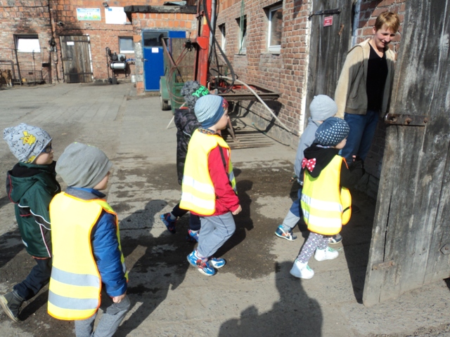 Dzięki gościnności Państwa Szklannych mogliśmy również odwiedzić ich gospodarstwo, gdzie dzieci miały okazję obejrzeć bydło, trzodę, kury, psy, mogły również pogłaskać malutkiego cielaczka. Przedszkolaki z bliska obejrzały maszyny rolnicze oraz inne sprzęty gospodarskie. Dla maluchów wycieczka ta stanowiła nie lada atrakcję, tym bardziej że jej głównym przewodnikiem była ich koleżanka z grupy, Nikola. Dzieci w ramach podziękowania za gościnę wręczyły pracę plastyczną, wyklejankę krowy, która powstała wcześniej podczas pracy zespołowej.