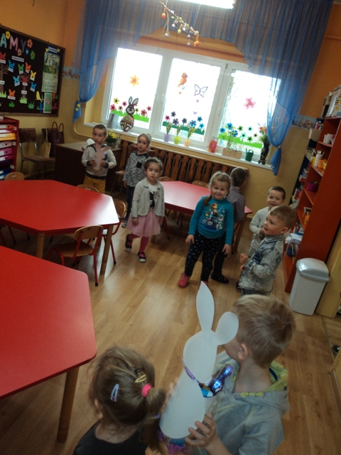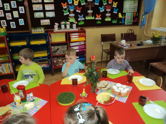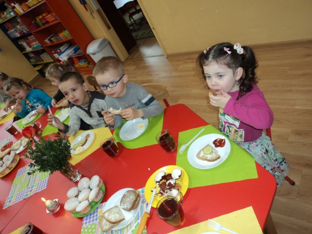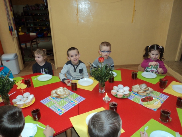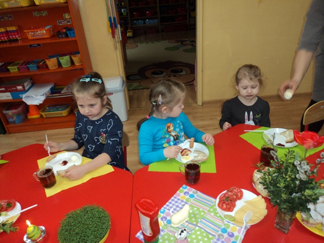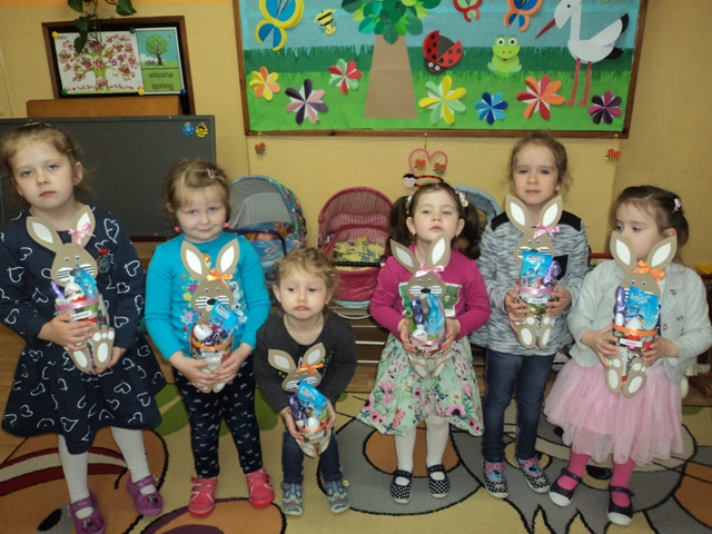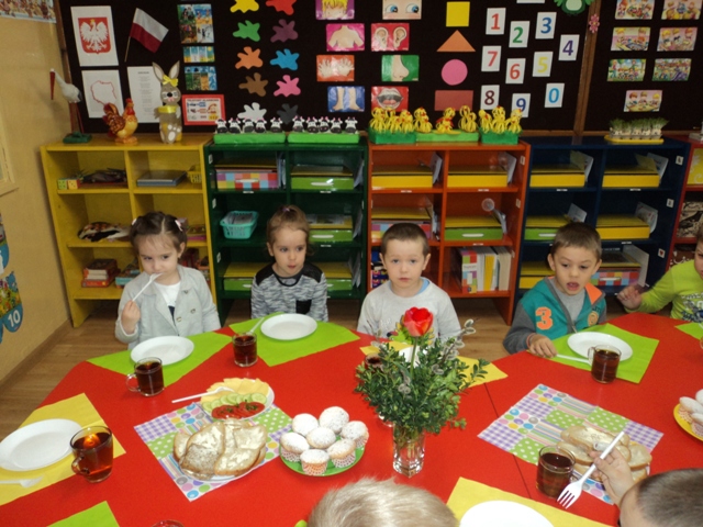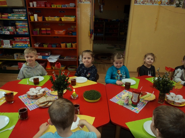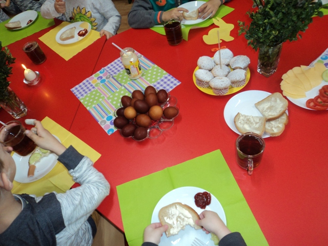 Tradycyjnie już przedszkolaki z Wrotkowa tuż przed świętami wspólnie zasiedli do „wielkanocnego śniadania”. Na świątecznym stole królowały wiosenne kolory oraz rośliny kojarzące się z Wielkanocą, czyli bukszpan, bazie, tulipany oraz forsycja pochodząca z przedszkolnego ogrodu. Na stole nie mogło również zabraknąć tradycyjnych świątecznych potraw, były jajka, kiełbaski, baranek z masła oraz wielkanocne babeczki. O znaczeniu tych pokarmów, jako symbolach świątecznych dzieci dowiedziały się wcześniej na zajęciach. Maluchy z apetytem zajadły wszystko co dla nich przygotowano. Po śniadanku nadszedł czas na poszukiwanie Zajączka Wielkanocnego, a konkretnie upominków przez niego pozostawionych. Oczywiście wszyscy zostali obdarowani i zakończyli dzień w świątecznych, doskonałych humorach.