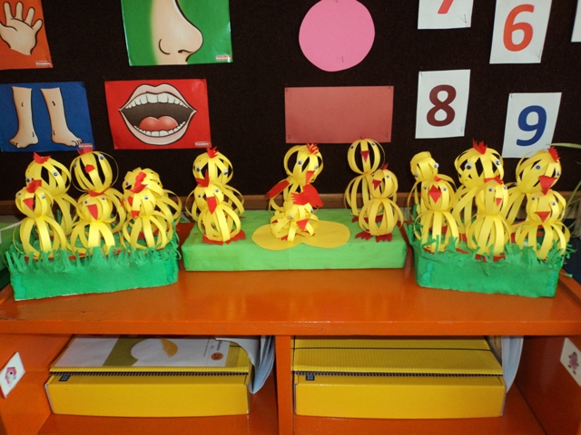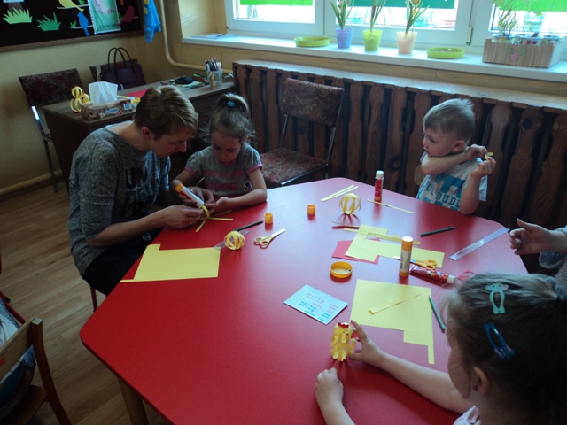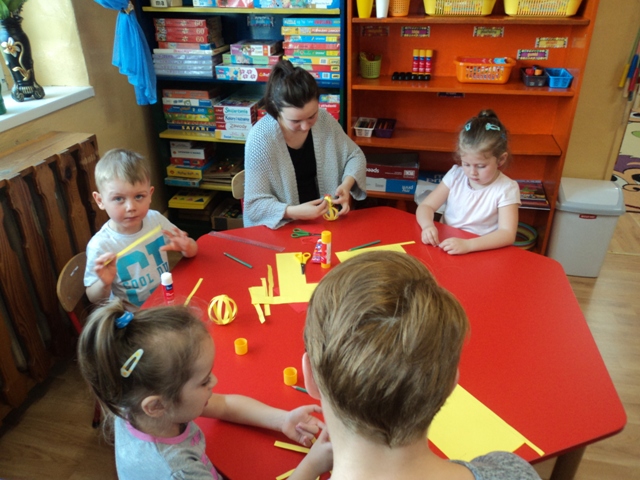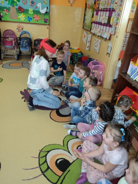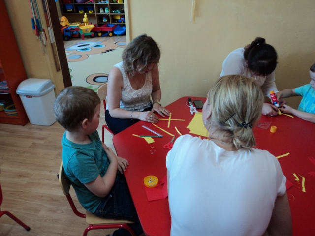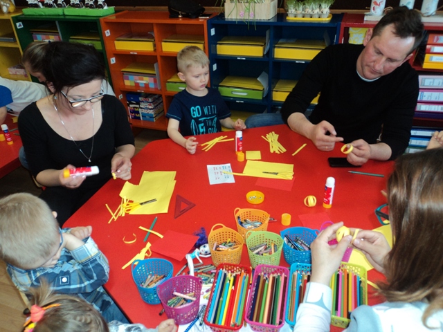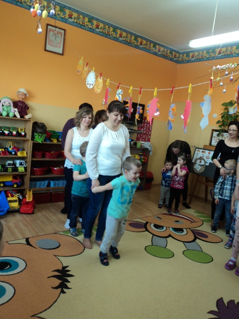 Tematem zajęć były gry i zabawy ruchowe oraz tańce i wspólny śpiew. Podczas spotkania rodzice mogli pobawić się z dziećmi tak jak my bawimy się w czasie zajęć dydaktycznych. Najwięcej śmiechu i radości sprawiła wszystkim zabawa w pociągi oraz: „Gdzie siedzi twoje dziecko?”. Dorośli doskonale za pomocą dotyku rozpoznawali swoje pociechy. Po wesołych zabawach nasi goście i przedszkolaki wykonali wspólne prace plastyczne przedstawiające sylwetki kurczaków. Bardzo dziękujemy wszystkim za zaangażowanie i udział w zajęciach.