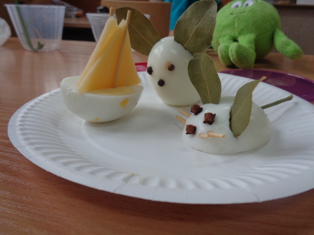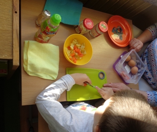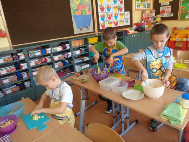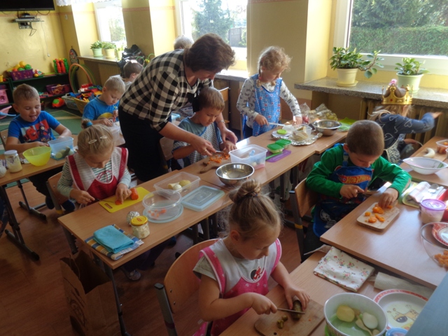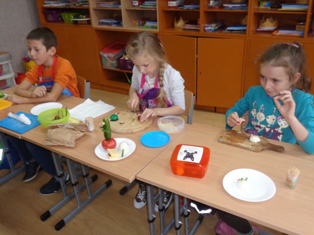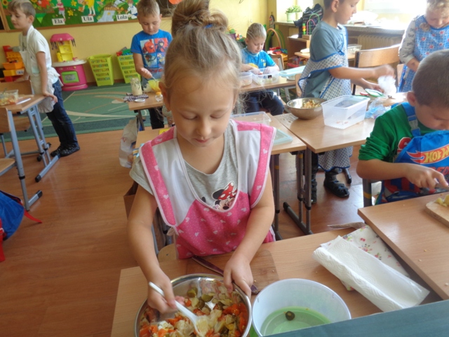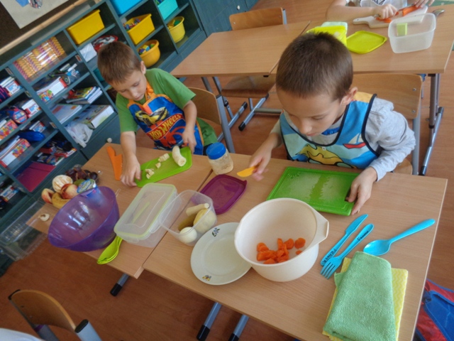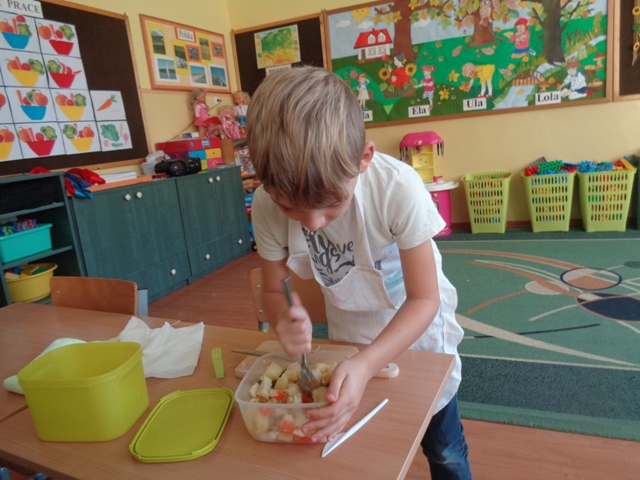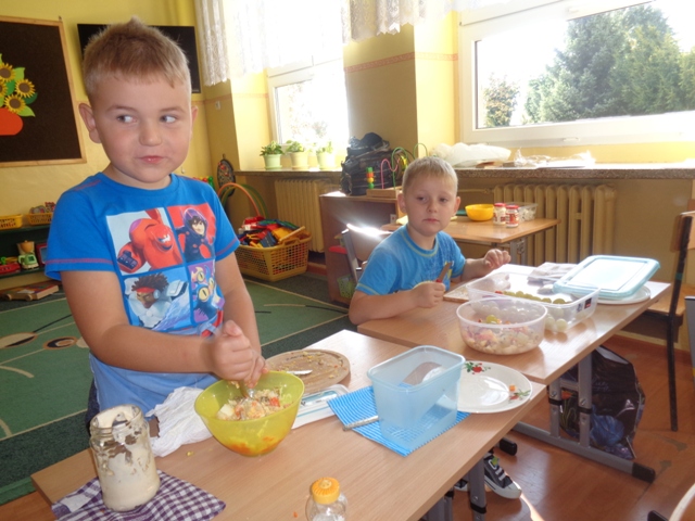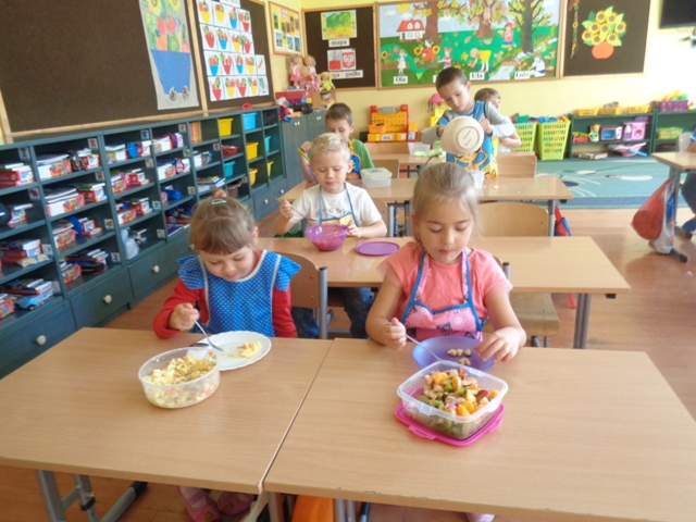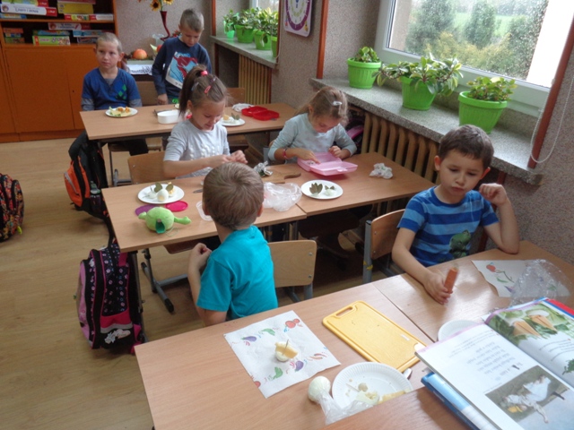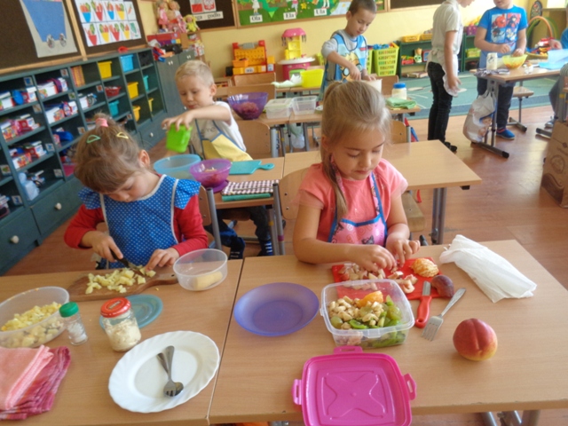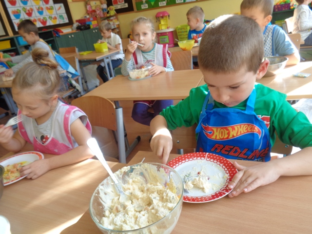 Sześciolatki oraz Pierwszaki podczas zajęć w szkole przygotowywali pyszne i zdrowe smakołyki. Młodsi zajmowali się przyrządzaniem sałatek warzywnych i owocowych, a w klasie I dzieci konstrułowały warzywne cudaki. Zabawy było co nie miara, a na koniec pracy nastąpiła degustacja. Zajęcia odbyły się w ramach programów profilaktycznych prowadzonych w naszej szkole oraz w ramach działań towarzyszących programu "Owoce i warzywa w szkole". Była to doskonała okazja do przypomnienia sobie zasad zdrowego odżywiania.