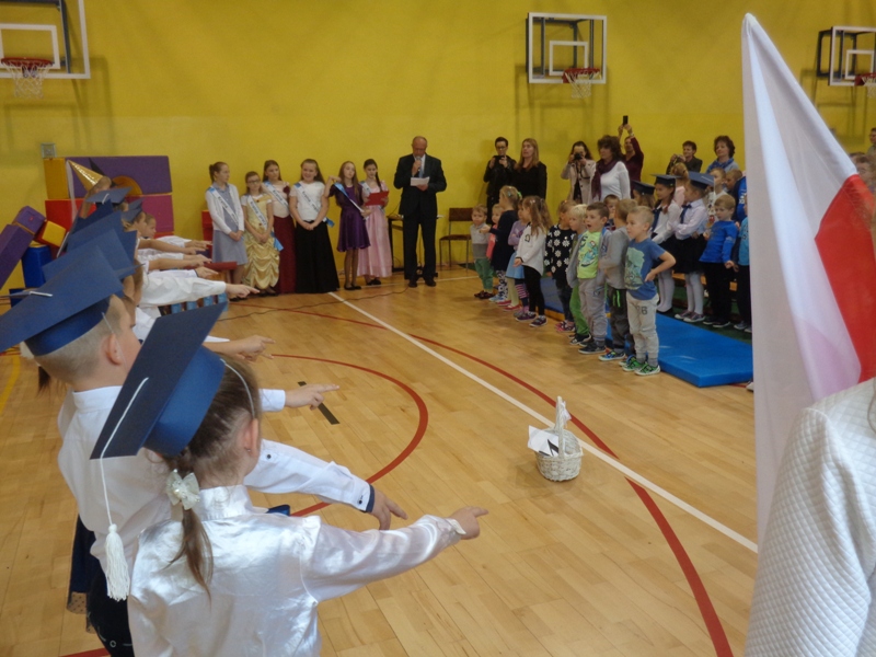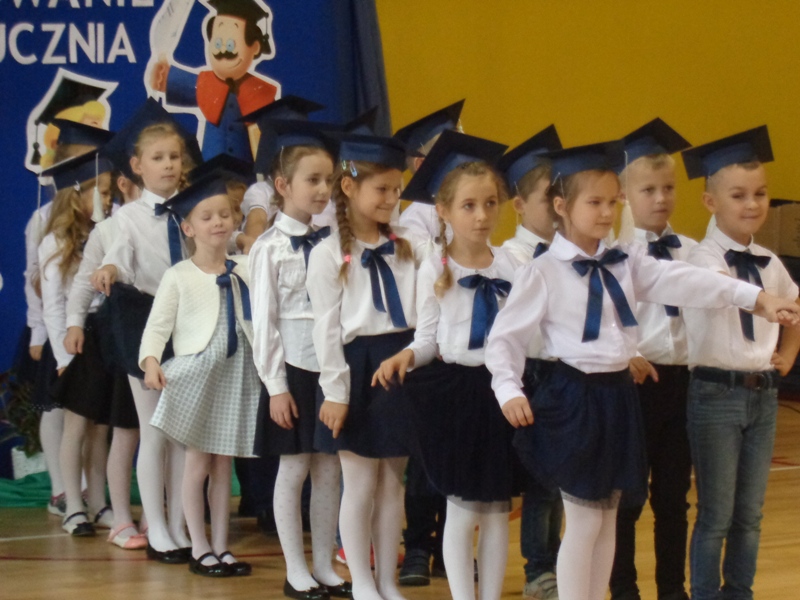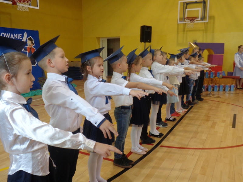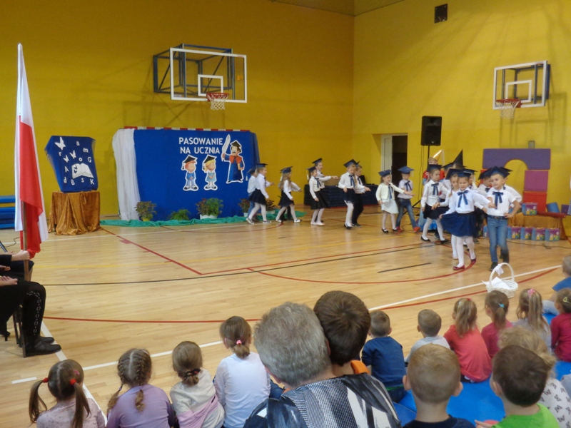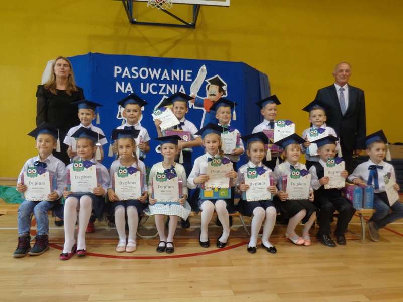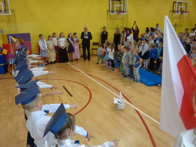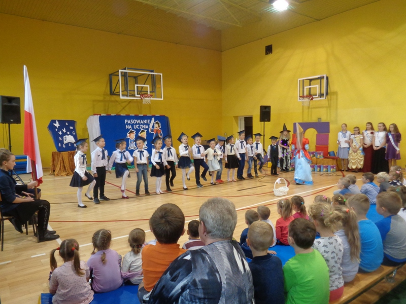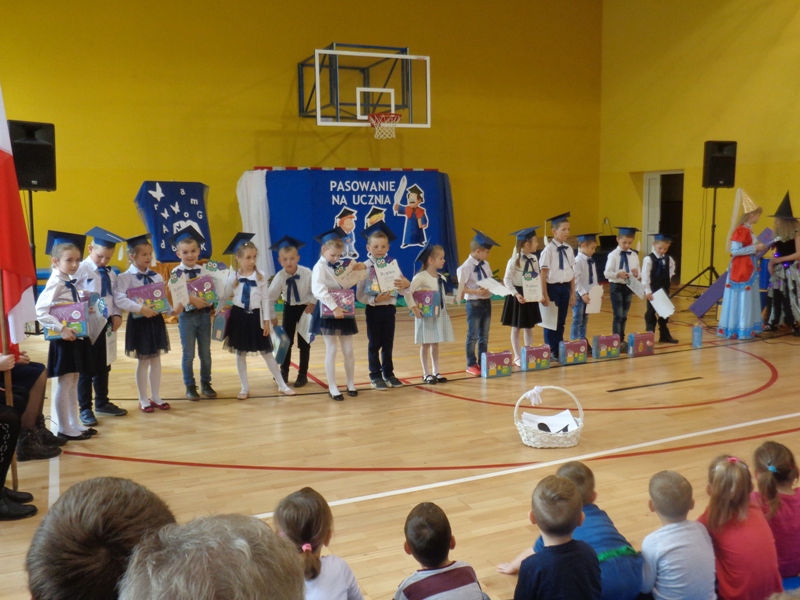 Pierwszoklasiści ze Szkoły Podstawowej w Mokronosie są już pełnoprawnymi uczniami. 26 października br. odbyło się uroczyste "Pasowanie na ucznia". To był wyjątkowy dzień. Pasowanie to bardzo ważna uroczystość w naszym szkolnym kalendarzu. Zanim dzieci zostały przyjęte do grona społeczności szkolnej przedstawiły to, czego do tej pory nauczyły się w szkole. Gotowi, odświętnie ubrani i bardzo przejęci przystąpili do zaprezentowania swoich umiejętności. Zadaniami uczniów było m.in. zaśpiewanie piosenek, recytacja i taniec poloneza. Następnie w niezwykle podniosłej atmosferze, przed pocztem sztandarowym pierwszoklasiści ślubowali być dobrymi uczniami i Polakami, swym zachowaniem i nauką sprawiać radość rodzicom i nauczycielom. Po złożeniu ślubowania pan Dyrektor Janusz Baszczyński dokonał symbolicznego pasowania wypowiadając zdanie "Pasuję Cię na ucznia/uczennicę Szkoły Podstawowej w Mokronosie" i dotknął ołówkiem jak czarodziejską różczką ramiona pierwszaka, a wychowawczyni pani Mariola Górak wręczyła im dypolomy pasowania na ucznia. Pan dyrektor pogratulował dzieciom wspaniałych umięjętności i wręczył niespodzianki "Kuferki", ufundowane przez rodziców. Po uroczystości dzieci wraz zaproszonymi goścmi udały się na słodki poczęstunek. Rodzicom gratulujemy tak wspaniałych pociech, a Pierwszoklasistom życzymy wielu sukcesów w nauce w naszej szkole.