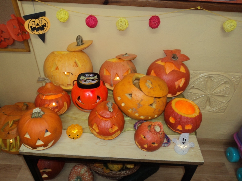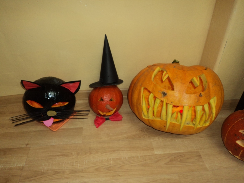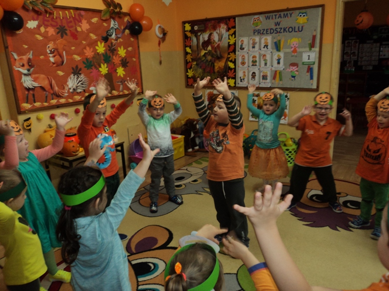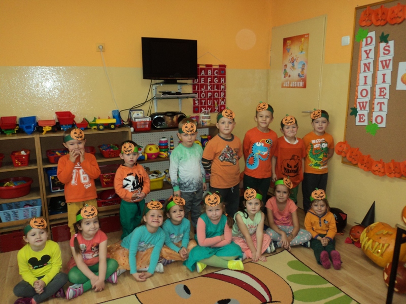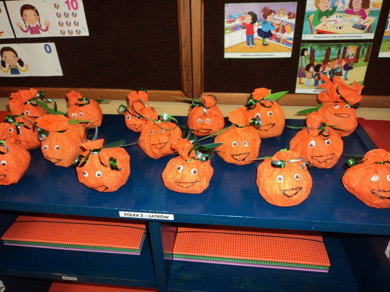 27 października. Chcieliśmy udowodnić, że Święto Dyni może być naszym, polskim świętem i nie tylko Halloween musi kojarzy się z dynią. Dzieci przyszły w tym dniu ubrane w kolory jesienno-dyniowe z przewagą pomarańczowego i zielonego, a na naszej dyniowej wystawce od rana pojawiały się lampiony i różne stworkowate dyniaczki-cudaczki, które dzieci wykonywały z pomocą swoich rodziców. Było na co popatrzeć – wiele różnych stworów i postaci stworzonych na bazie dyni nie tylko zachwycały efektem końcowym, ale również i pomysłowością!