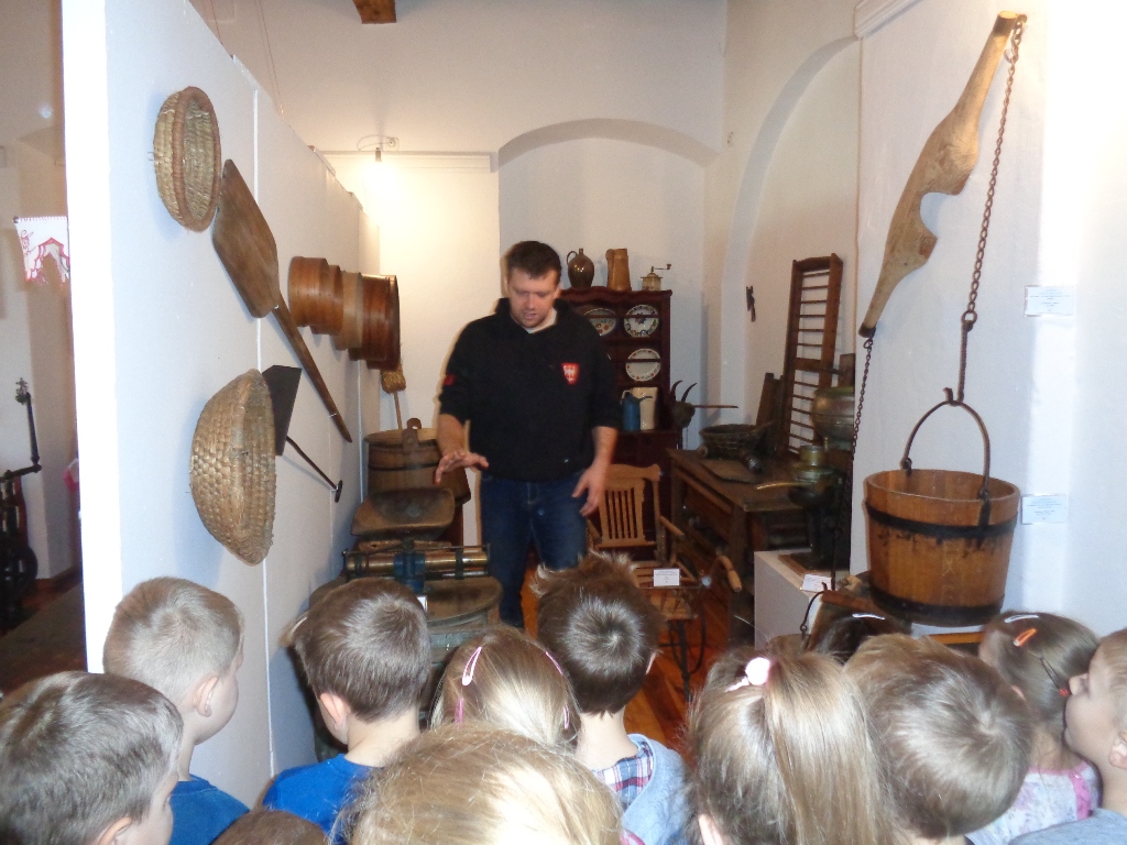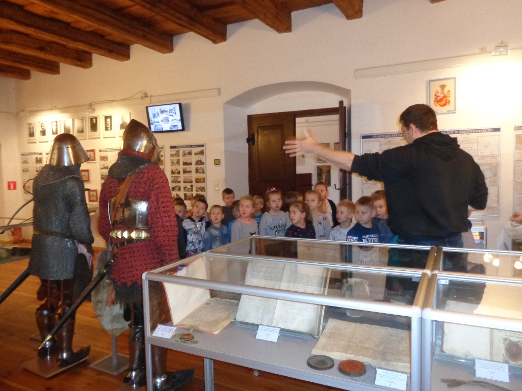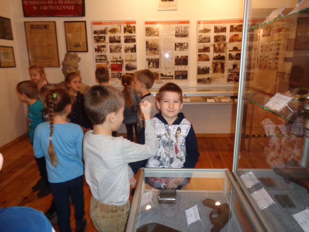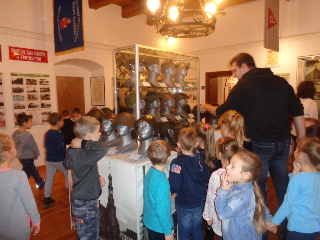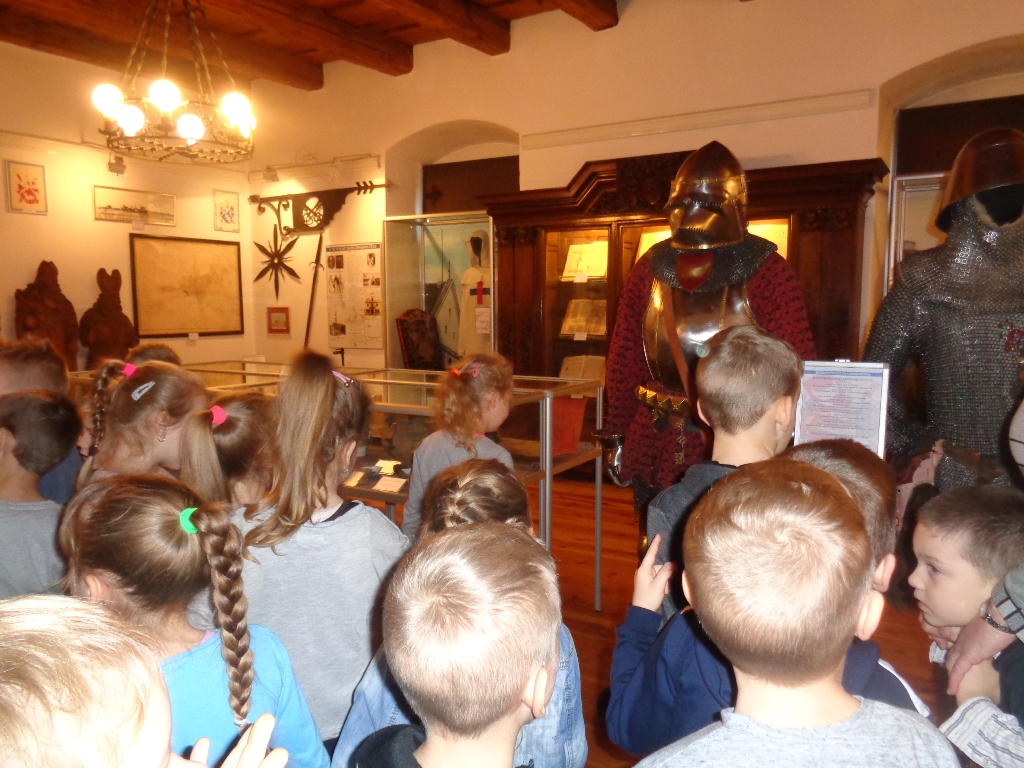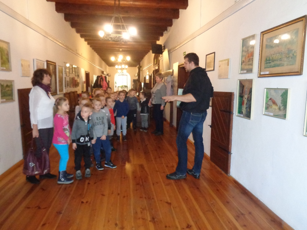 23 listopada br. dzieci 5-6 letnie udały się na wycieczkę do Muzeum Regionalnego im. H. Ławniczaka w Krotoszynie w ramach realizacji tematu "W muzeum". Naszą wycieczkę poprzedziło ustalenie zasad kulturalnego zachowania w miejscu publicznym. W muzeum oczekiwał na nas dyrektor Pan P. Mikołajczyk. Nasza przygoda rozpoczęła się od pytania "Co to jest muzeum?". Następnie znając już odpowiedź wysłuchaliśmy opowieści o eksponatach zgromadzonych w poszczególnych salach. Z dużym zainteresowaniem dzieci oglądały zabytki dotyczące naszego regionu. Wycieczka ta stanowiła pierwszą, niezwykłą lekcję historii dla 5 i 6 latków.