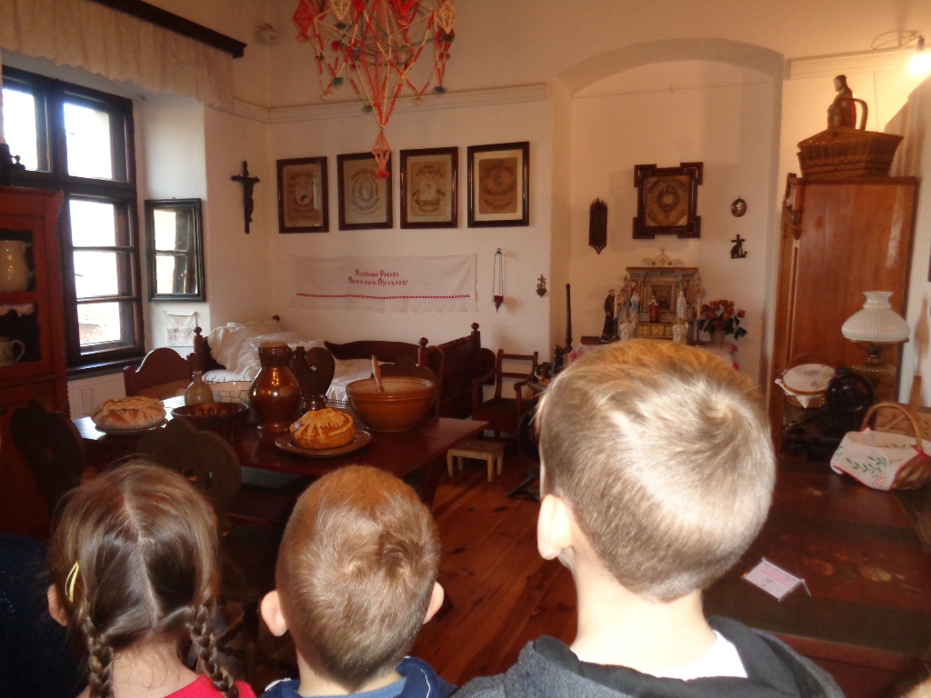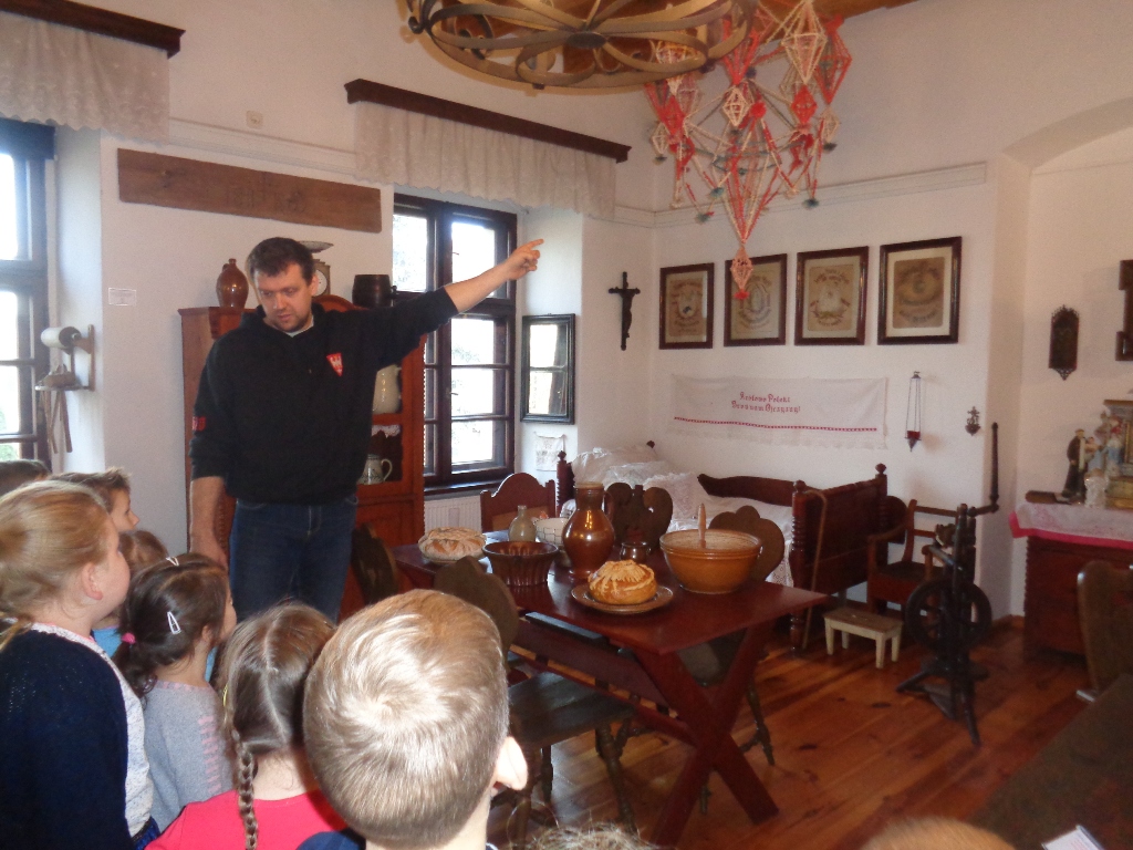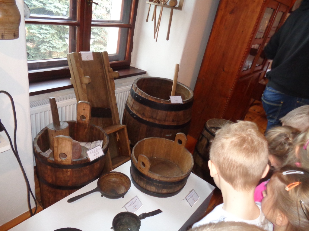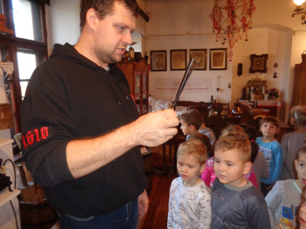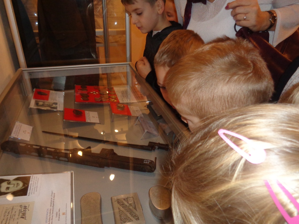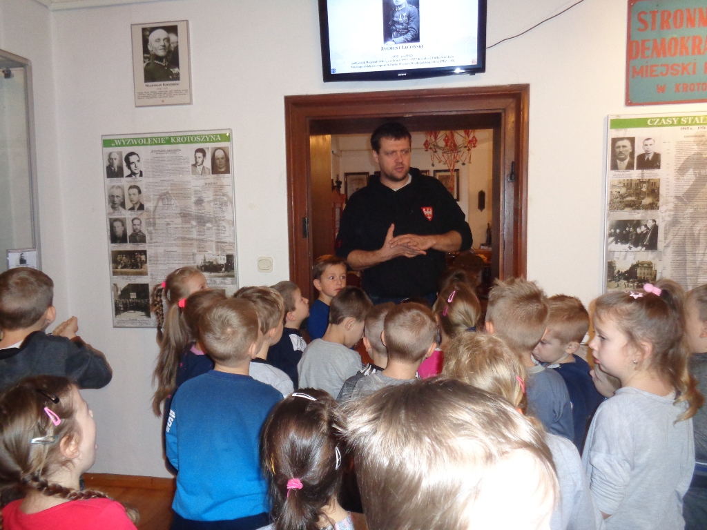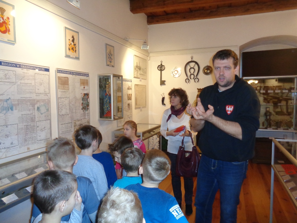 23 listopada br. dzieci 5-6 letnie udały się na wycieczkę do Muzeum Regionalnego im. H. Ławniczaka w Krotoszynie w ramach realizacji tematu "W muzeum". Naszą wycieczkę poprzedziło ustalenie zasad kulturalnego zachowania w miejscu publicznym. W muzeum oczekiwał na nas dyrektor Pan P. Mikołajczyk. Nasza przygoda rozpoczęła się od pytania "Co to jest muzeum?". Następnie znając już odpowiedź wysłuchaliśmy opowieści o eksponatach zgromadzonych w poszczególnych salach. Z dużym zainteresowaniem dzieci oglądały zabytki dotyczące naszego regionu. Wycieczka ta stanowiła pierwszą, niezwykłą lekcję historii dla 5 i 6 latków.