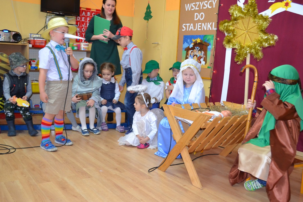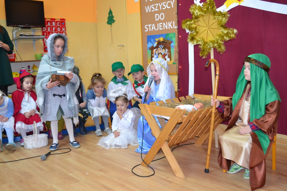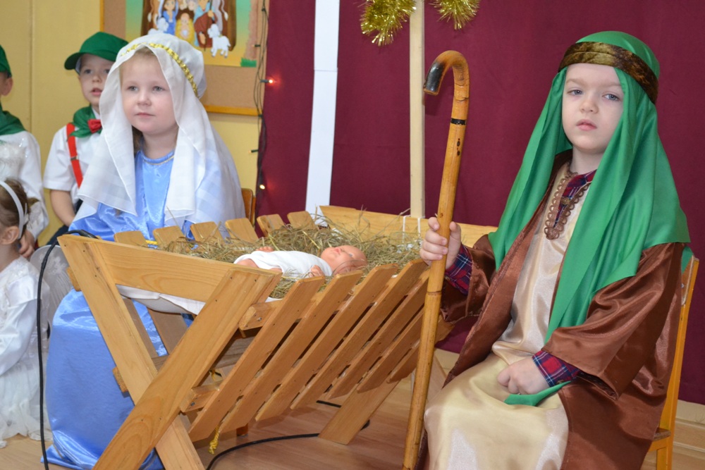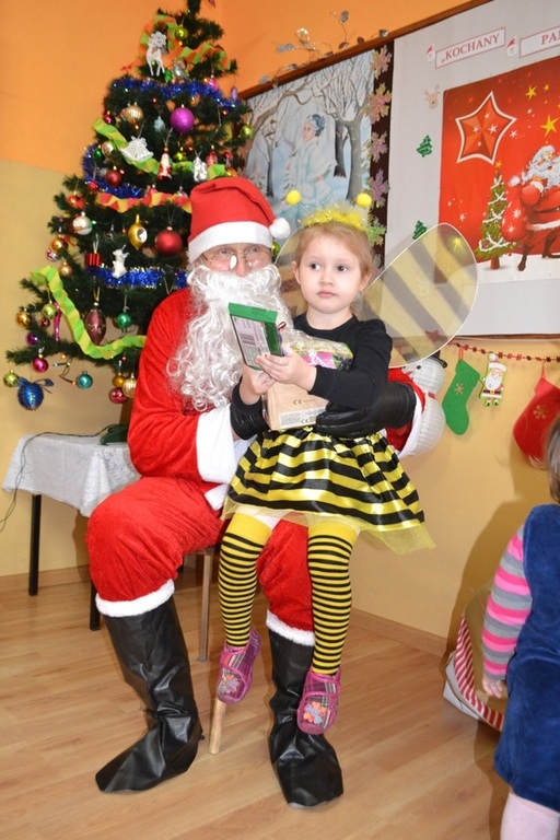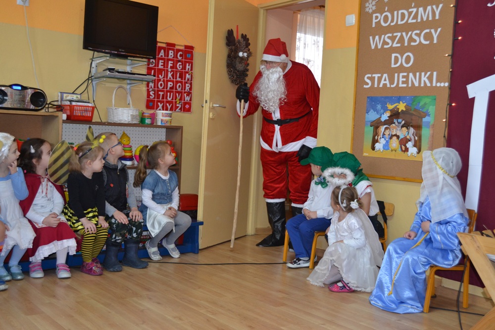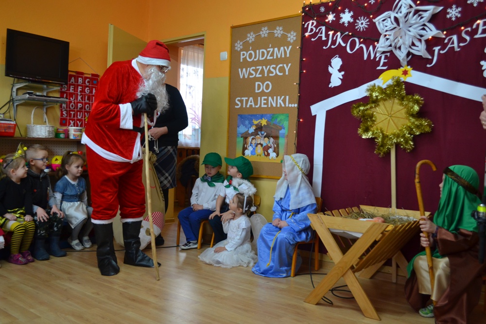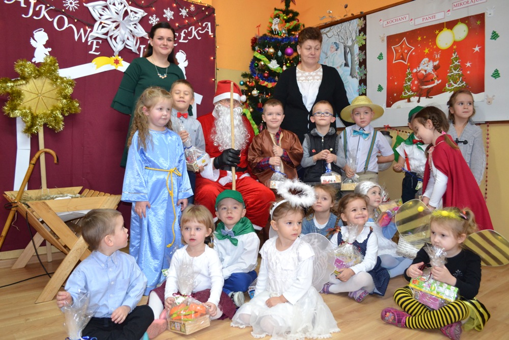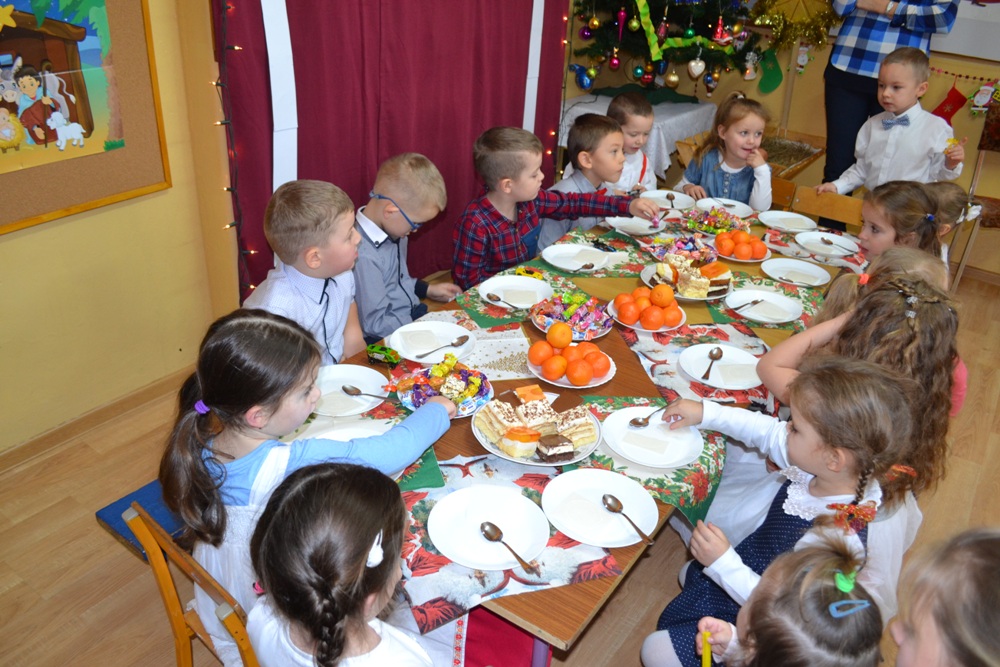 Ogromne zaangażowanie młodych aktorów opłaciło się, gdyż przedstawienie wywarło duże wrażenie. Stało się tak również za sprawą pięknych strojów przygotowanych przez rodziców, w których wystąpiły dzieci. Po części artystycznej i mocy złożonych życzeń przyszedł czas na wizytę Św. Mikołaja, który zawitał w nasze progi i wszystkim dzieciom przyniósł prezenty. Tego dnia wszyscy podzielili się opłatkiem i zasiedli do świątecznych stołów, o zastawienie których zadbali rodzice.