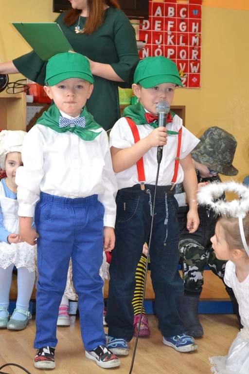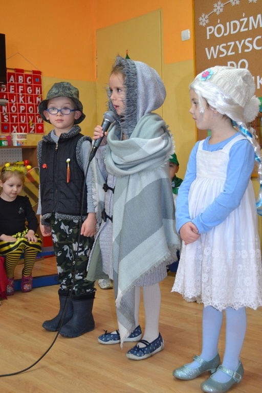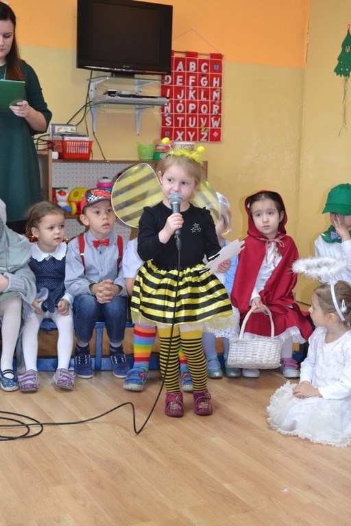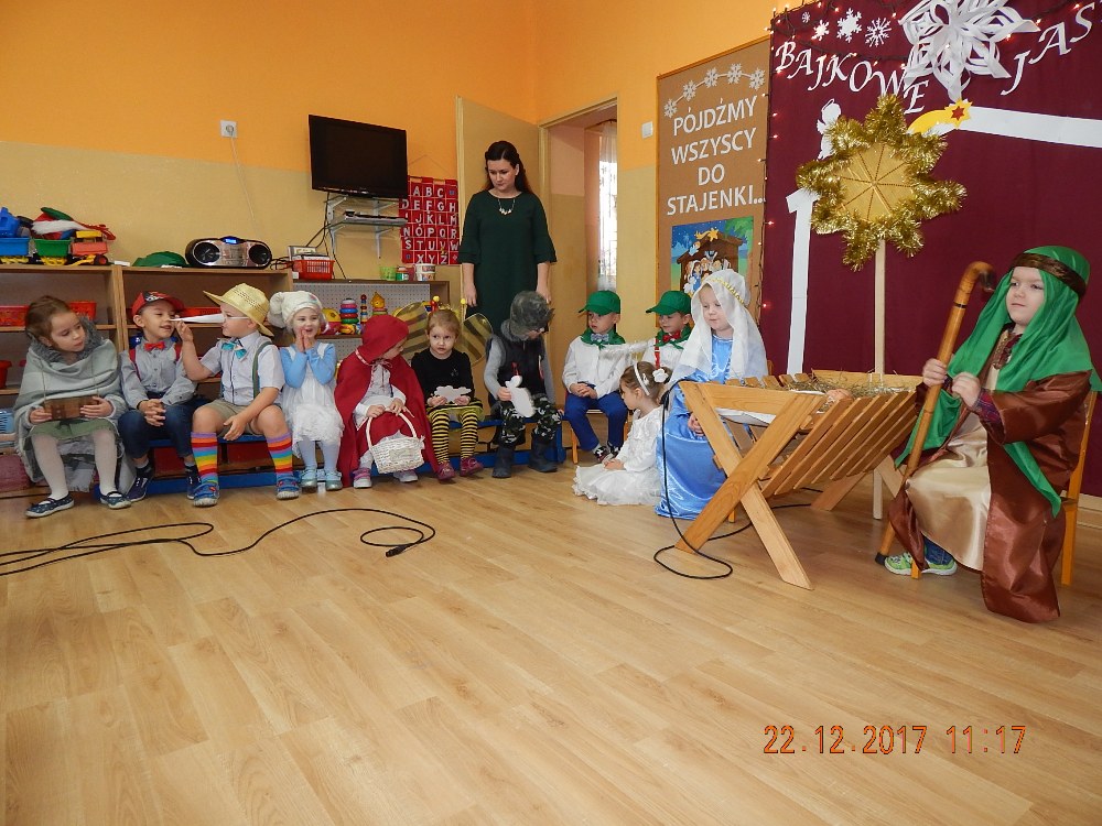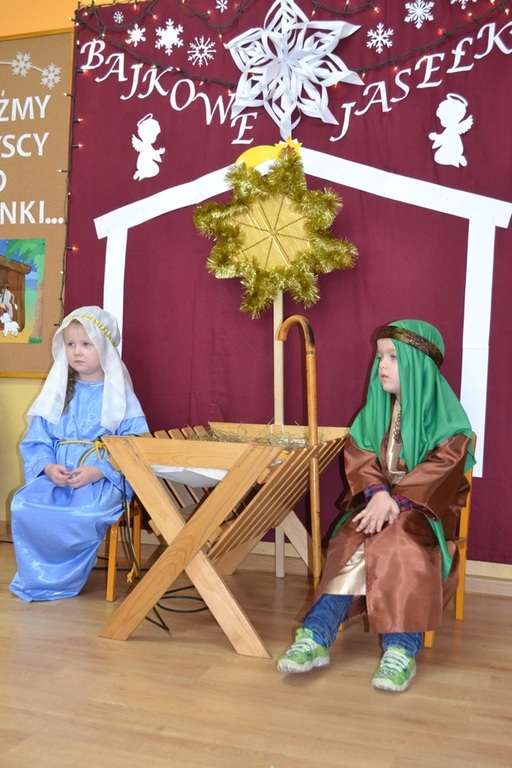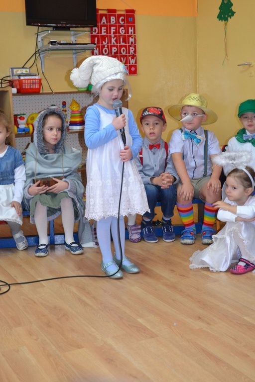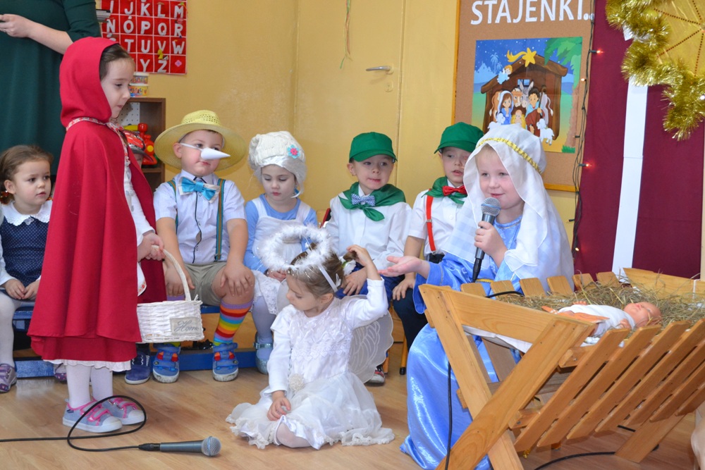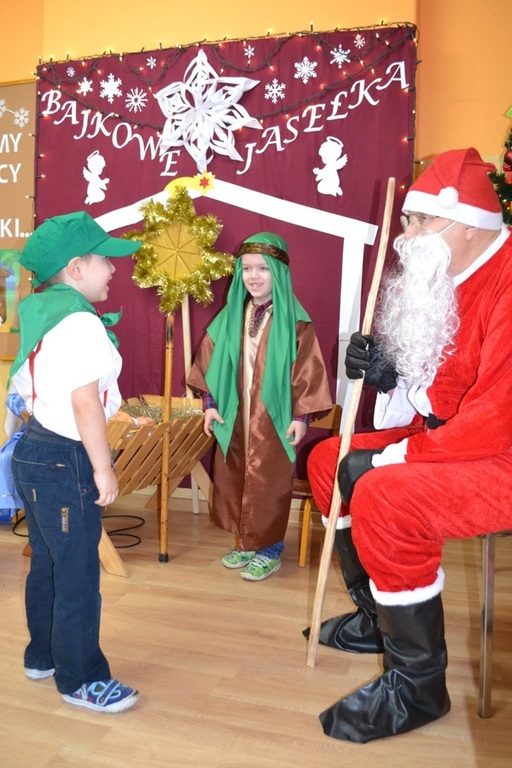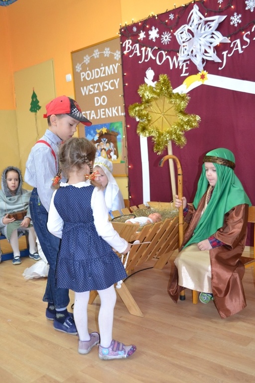 i recytowali wiersze. Dziewczynka z zapałkami zostawiła przy żłóbku zapałki, Pinokio obiecał już więcej nie kłamać, Jaś i Małgosia przynieśli Jezuskowi pierniki z chaty Baby Jagi, Czerwony Kapturek koszyczek pełen smakołyków, Pszczółka Maja plaster miodu a rybak złotą rybkę, Kopciuszek chciał posprzątać w stajence, a Smerfetka przyniosła gorące pozdrowienia dla Bożej Dzieciny od całej smerfowej rodziny. Przy żłóbku pojawiły się również dzieci z przedszkola, a nad stajenką czuwał Aniołek.