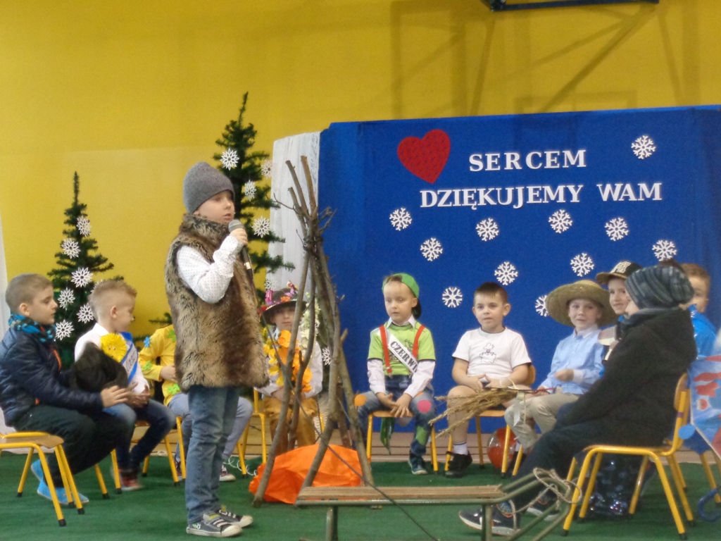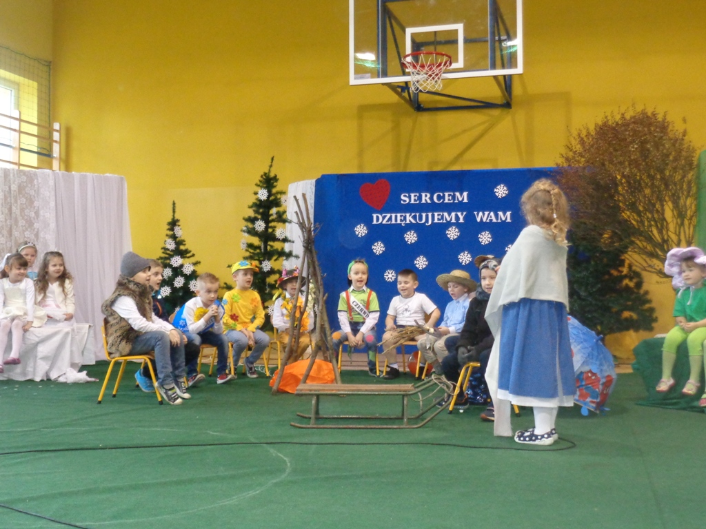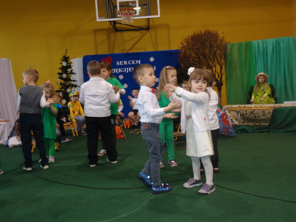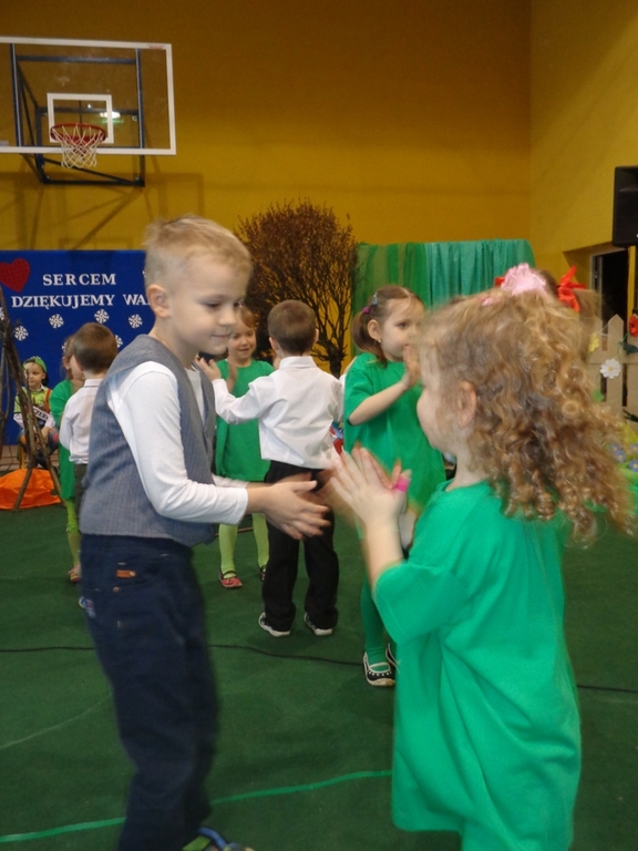 W trakcie uroczystości Babcie i Dziadkowie mogli podziwiać swe pociechy w różnych formach artystycznych: wierszu, tańcu i piosence, teatrzyku „O dwunastu miesiącach”, grze na skrzypcach i układzie choreograficznym do utworu „Hallelujah”. Mali artyści z przejęciem odtwarzali swoje role, a czcigodni goście ze wzruszeniem odbierali czułe słowa, kierowane pod ich adresem. Jak co roku, dopisała frekwencja. Licznie przybyła grupa starszego pokolenia nagradzała gromkimi brawami małych artystów. Każdy przedszkolak obdarował swą Babcię naszyjnikiem z serduszkiem, a Dziadkom przyda się zapewne funkcjonalny breloczek do kluczy.