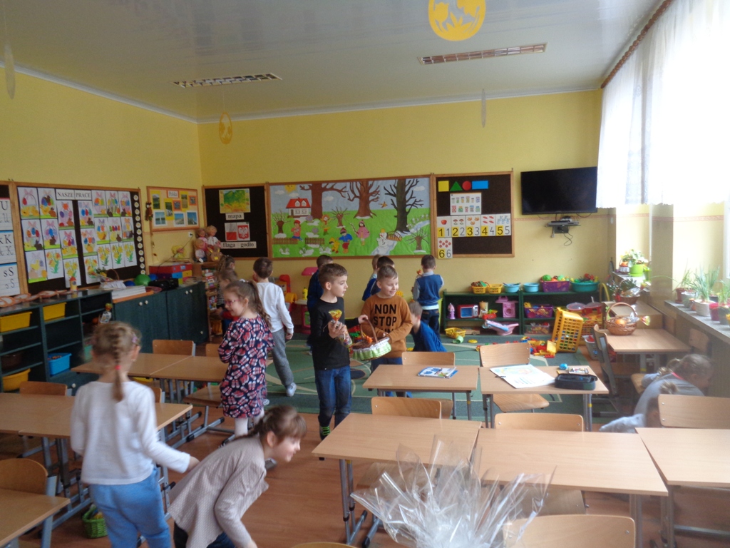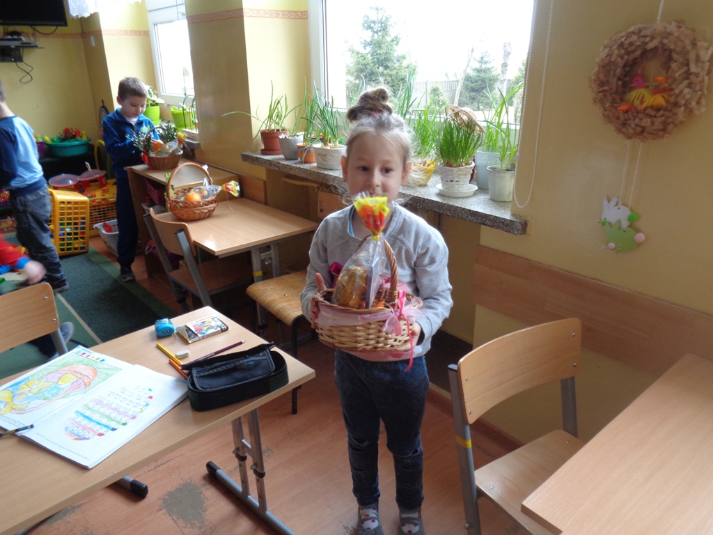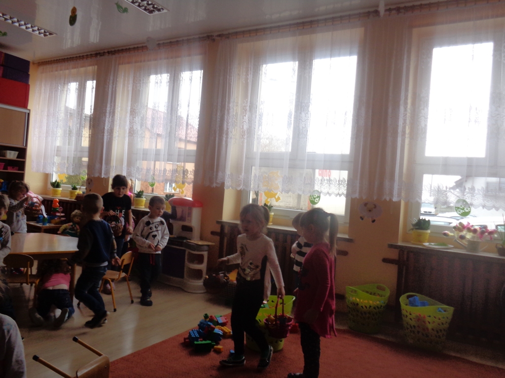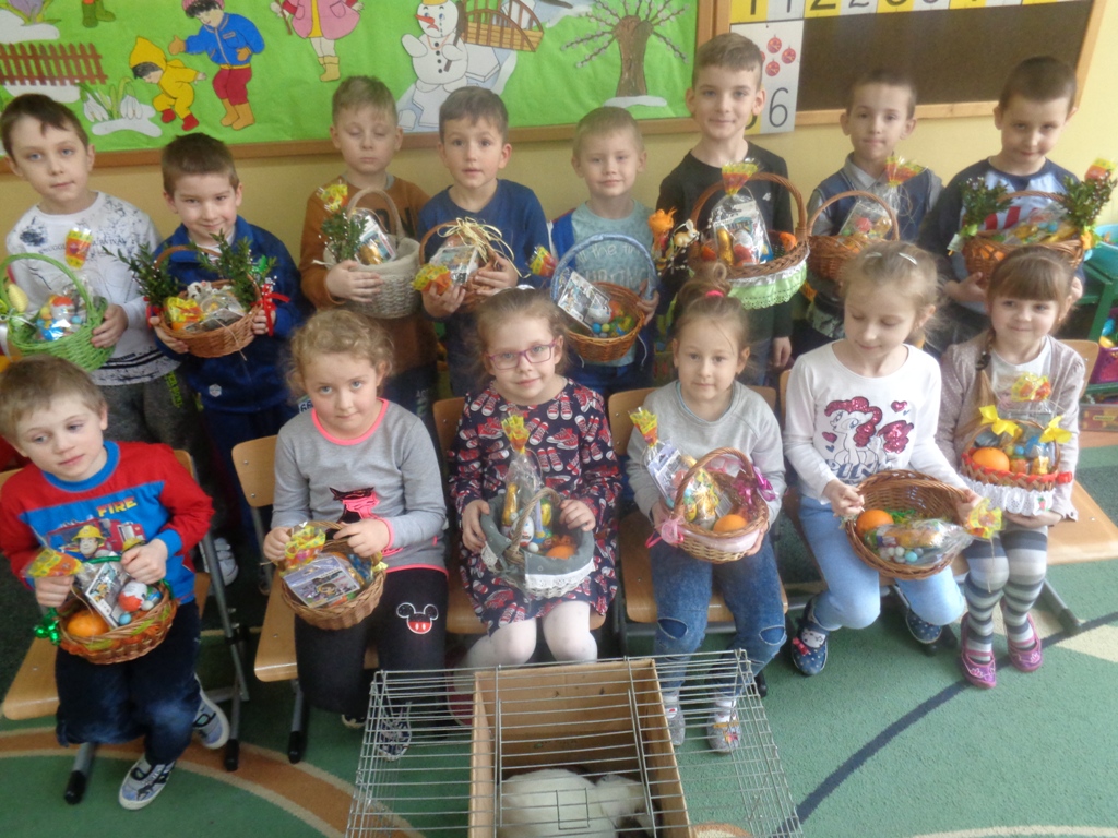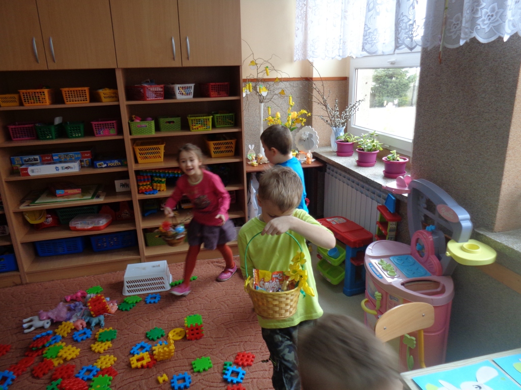 Tak było i w bieżącym roku. Najpierw dzieci ozdabiały swe koszyczki, aby „przyciągnąć” do nich wzrok czworonoga. Koszyczki zostały wystawione w centralnym miejscy sali. A potem było już tylko wielkie oczekiwanie i nuta niepewności, czy na pewno do nas zawita... Na szczęście wszystko odbyło się zgodnie z planem: zajączek po śladach dotarł do wszystkich oddziałów, napełnił koszyczki słodkościami, a potem bardzo zmęczony zatrzymał się w sali starszaków, by nieco odpocząć i schrupać marchewkę przed dalszą podróżą. Wszak pracy w okresie przedświątecznym mu nie brakuje...