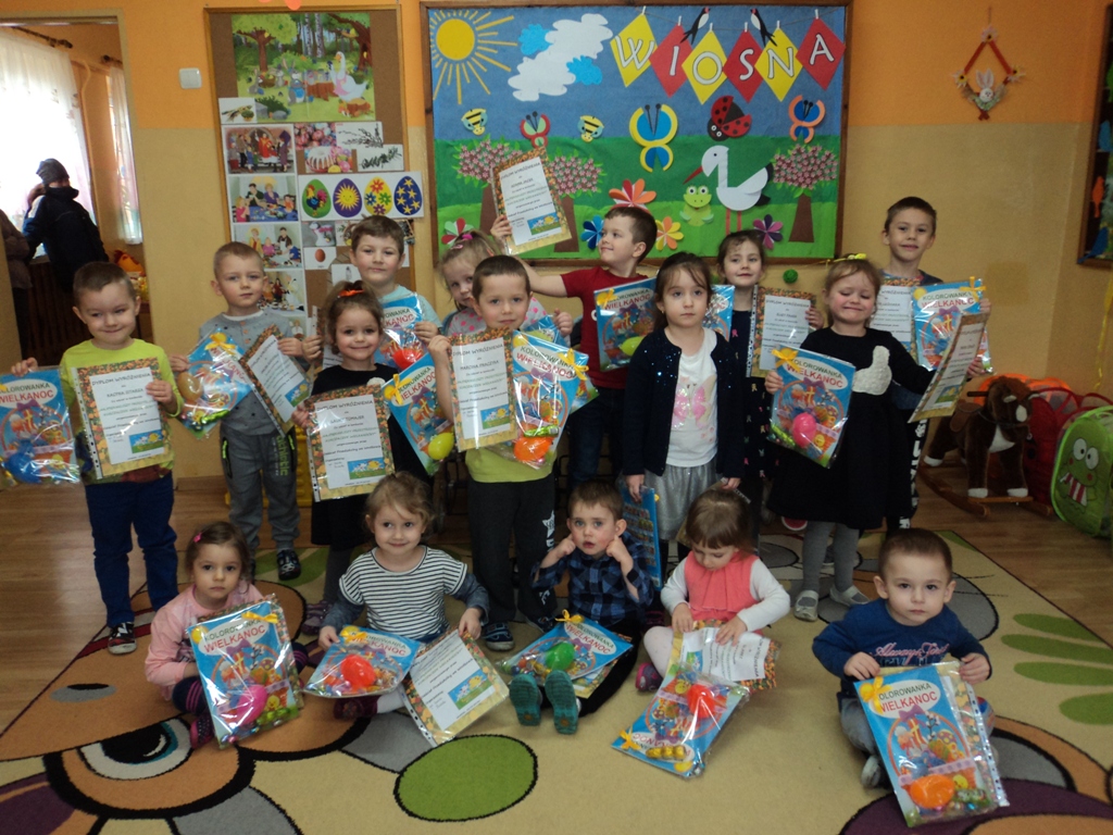 Dnia 28 marca w Przedszkolu we Wrotkowie odbyło się wręczenie nagród i oficjalne ogłoszenie wyników konkursu na „NAJPIĘKNIEJSZEGO PRZESTRZENNEGO KURCZACZKA WIELKANOCNEGO”, organizowanego przez przedszkole. Wybór był niezwykle trudny, gdyż wszystkie prace wykonane przez dzieci były przepiękne i bardzo pomysłowe. Spośród dostarczonych prac wyłonienie zwycięzców było niemożliwe dlatego wszystkie kurczaczki zostały wyróżnione i z tego względu wszyscy uczestnicy otrzymali nagrody wyróżnienia oraz pamiątkowe dyplomy. Przedszkolakom serdecznie gratulujemy i życzymy dalszych artystycznych sukcesów.