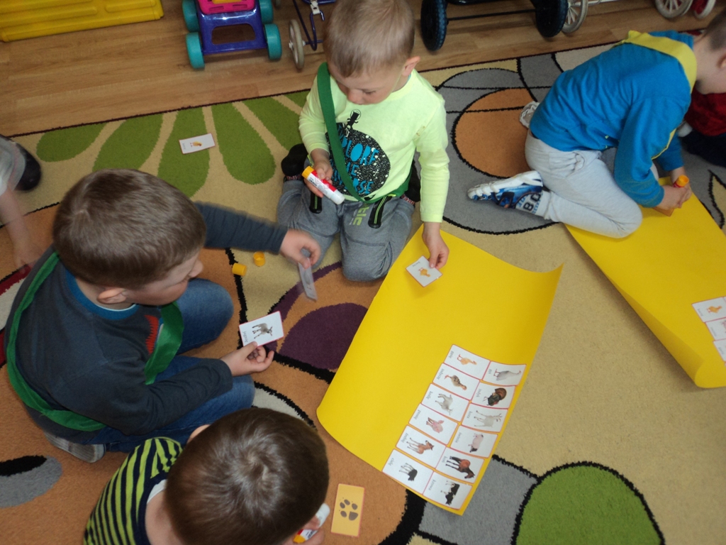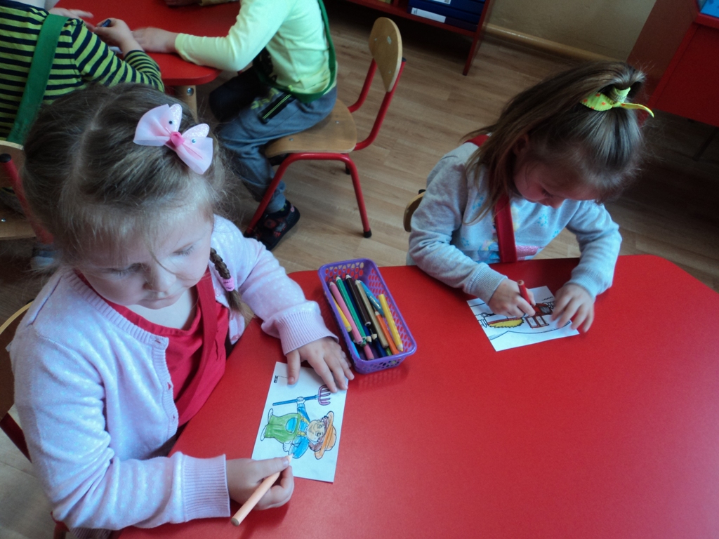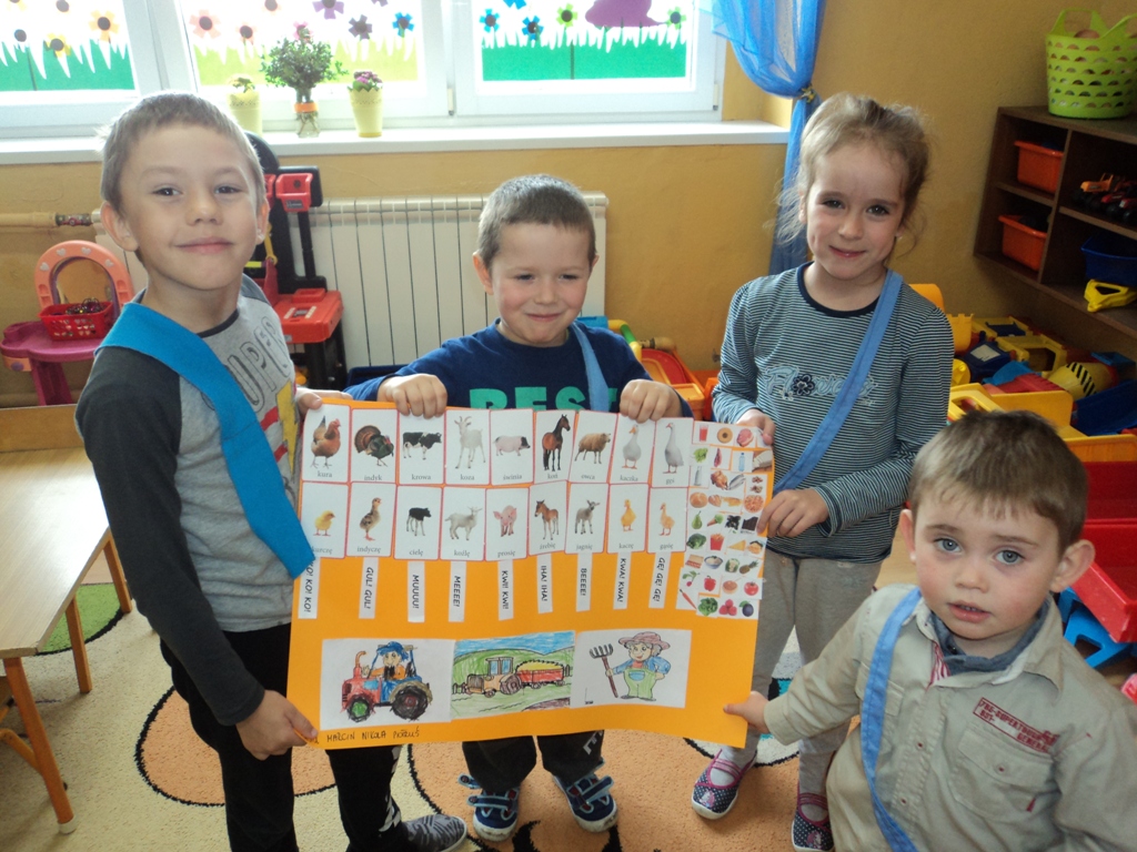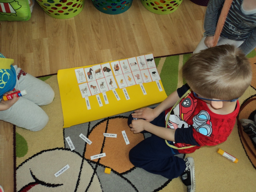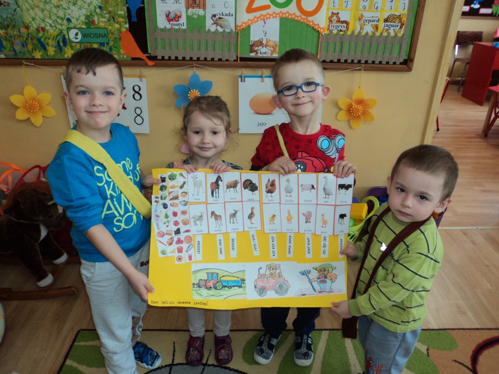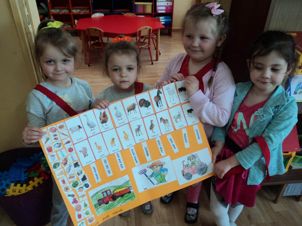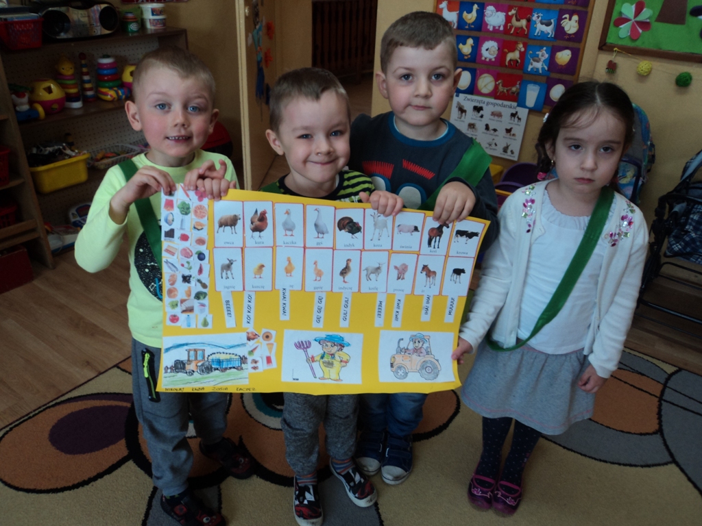 Przypomnieliśmy sobie jakie zwierzęta hodowane są na wsi, po co ludzie je hodują, gdzie one mieszkają, jakich dostarczają produktów. Przeanalizowaliśmy dzień z życia rolnika. Maluchy przeglądały ilustracje związane z tematem, słuchały odgłosów z gospodarstwa. Dzieci podzielone na grupy wykonały plakaty związane z życiem na wsi, zadaniem przedszkolaków było m. in. posegregowanie zwierząt wiejskich, pokolorowanie ilustracji związanych z pracą rolnika czy wybranie produktów spożywczych, które pochodzą właśnie ze wsi. Grupy bardzo solidnie wykonały powierzone im zadania.