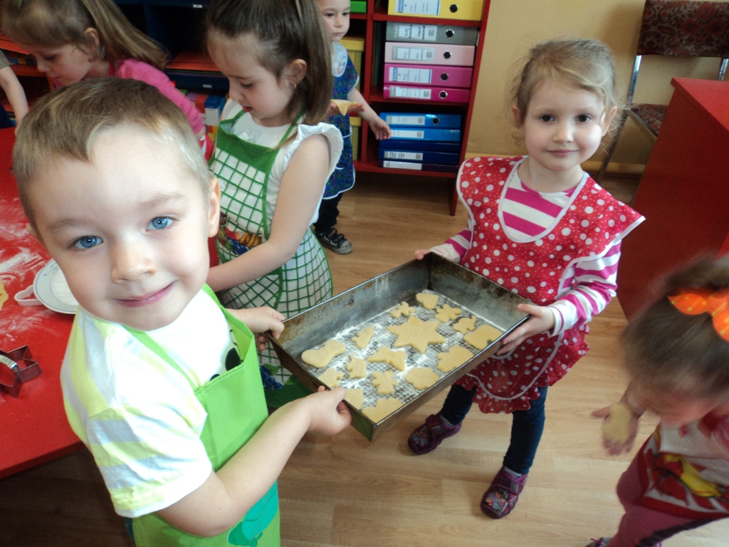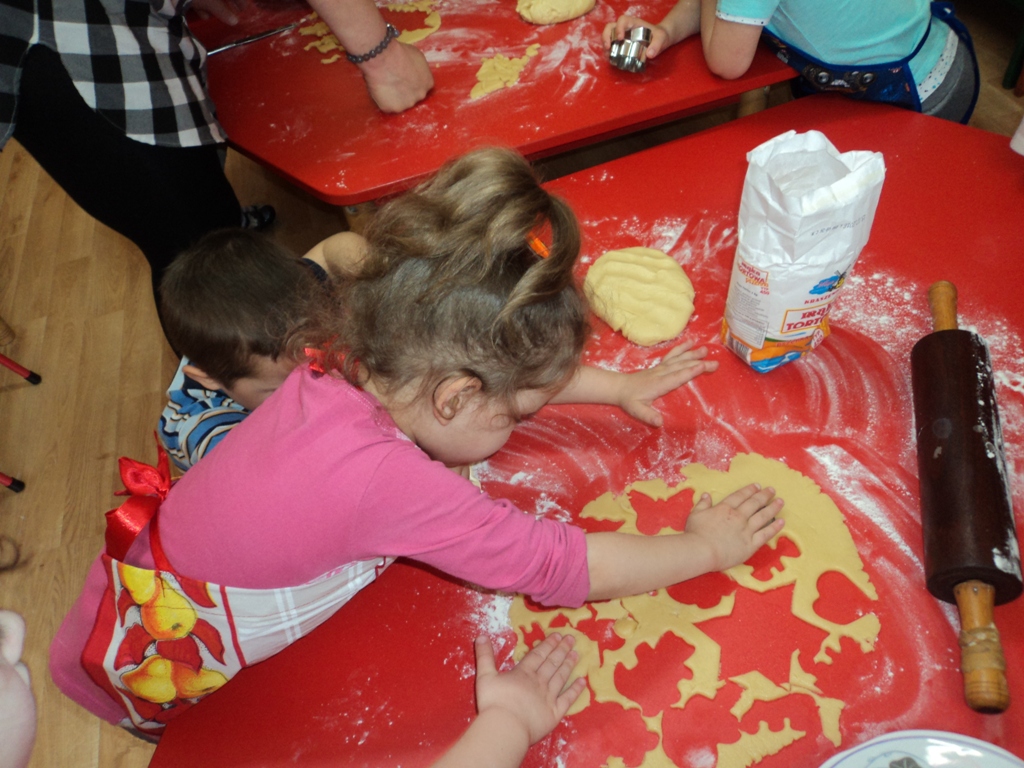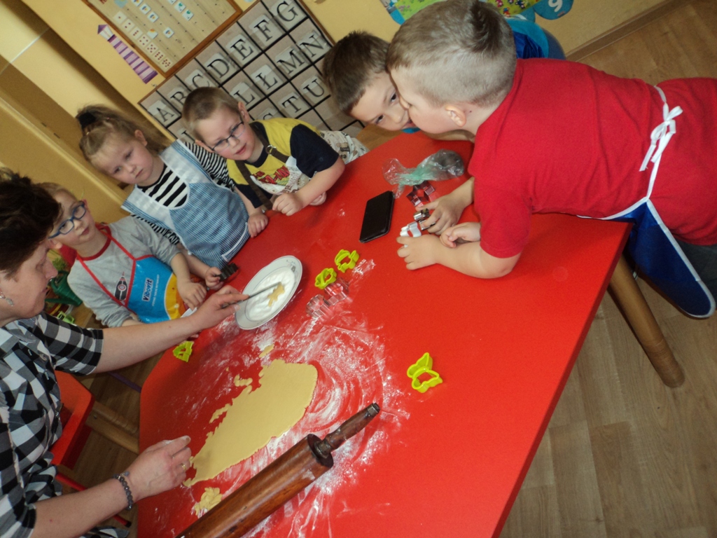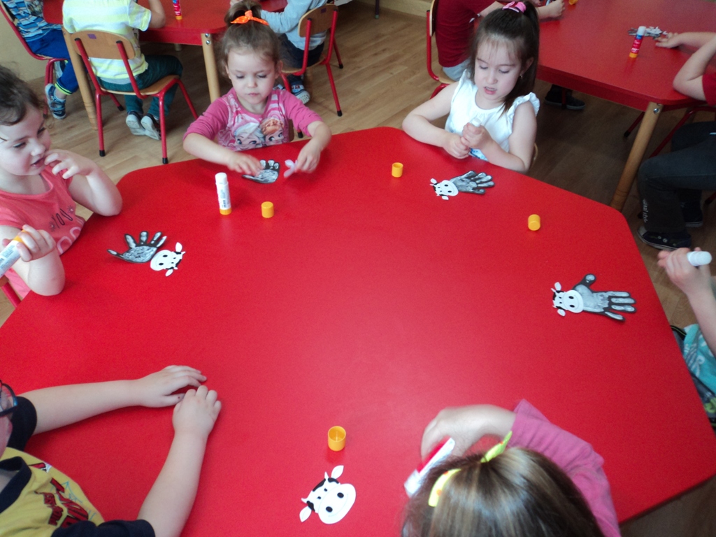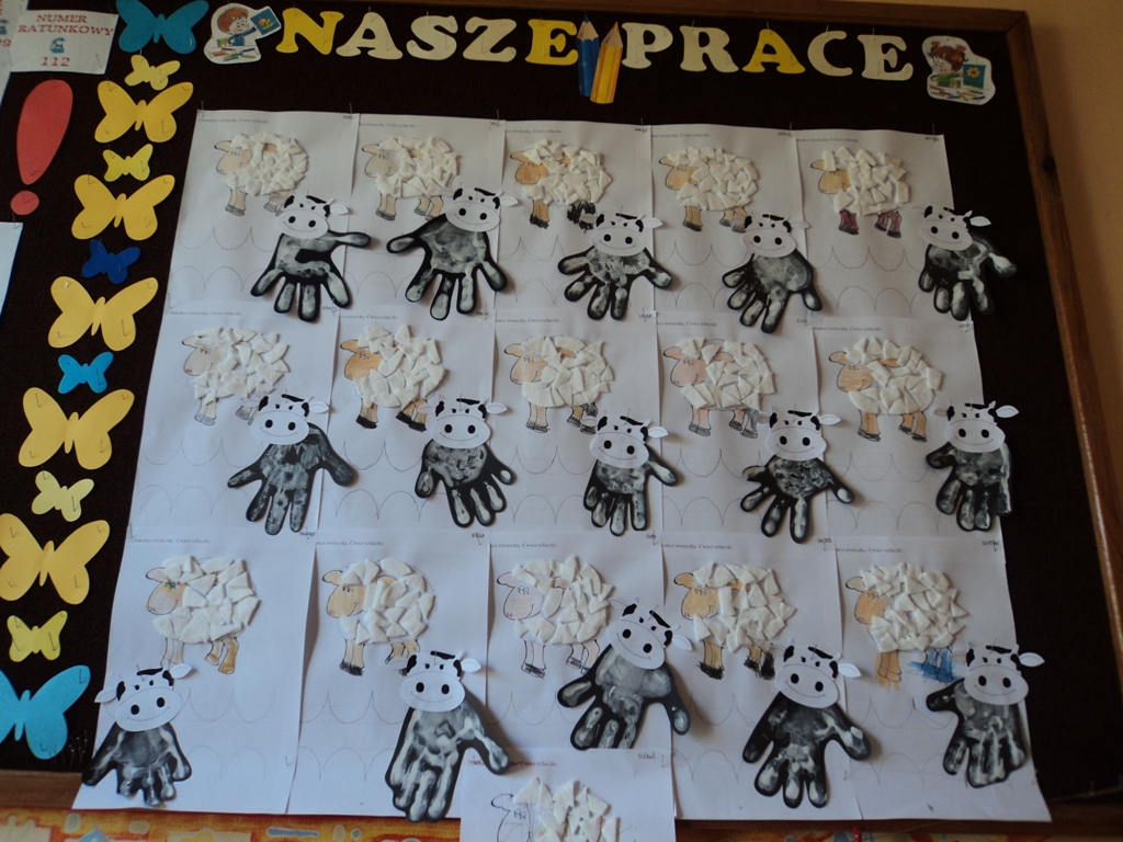 Podczas „wiejskiego” tygodnia wykonaliśmy kilka prac plastycznych związanych z daną tematyką, powstały łaciate krowy i puszyste owieczki. Jako podsumowanie tygodnia postanowiliśmy wspólnymi siłami upiec kruche ciasteczka. Pracy było co niemiara ale jej efektem był słodki zapach unoszący się w całym przedszkolu i pyszne ciasteczka, którymi na koniec dnia mogliśmy się delektować i którymi dzieci z miłą chęcią częstowały swoich rodziców. Dla dzieci był to bardzo aktywny tydzień, pełen wrażeń.