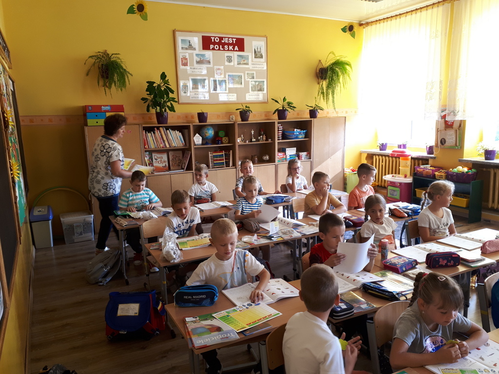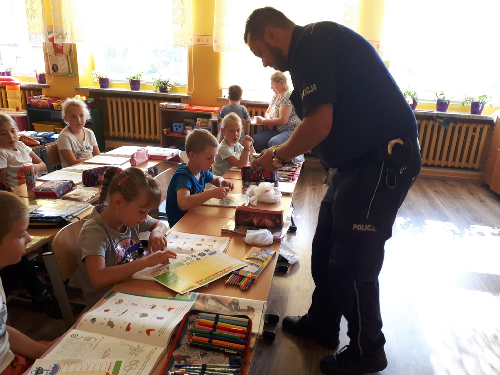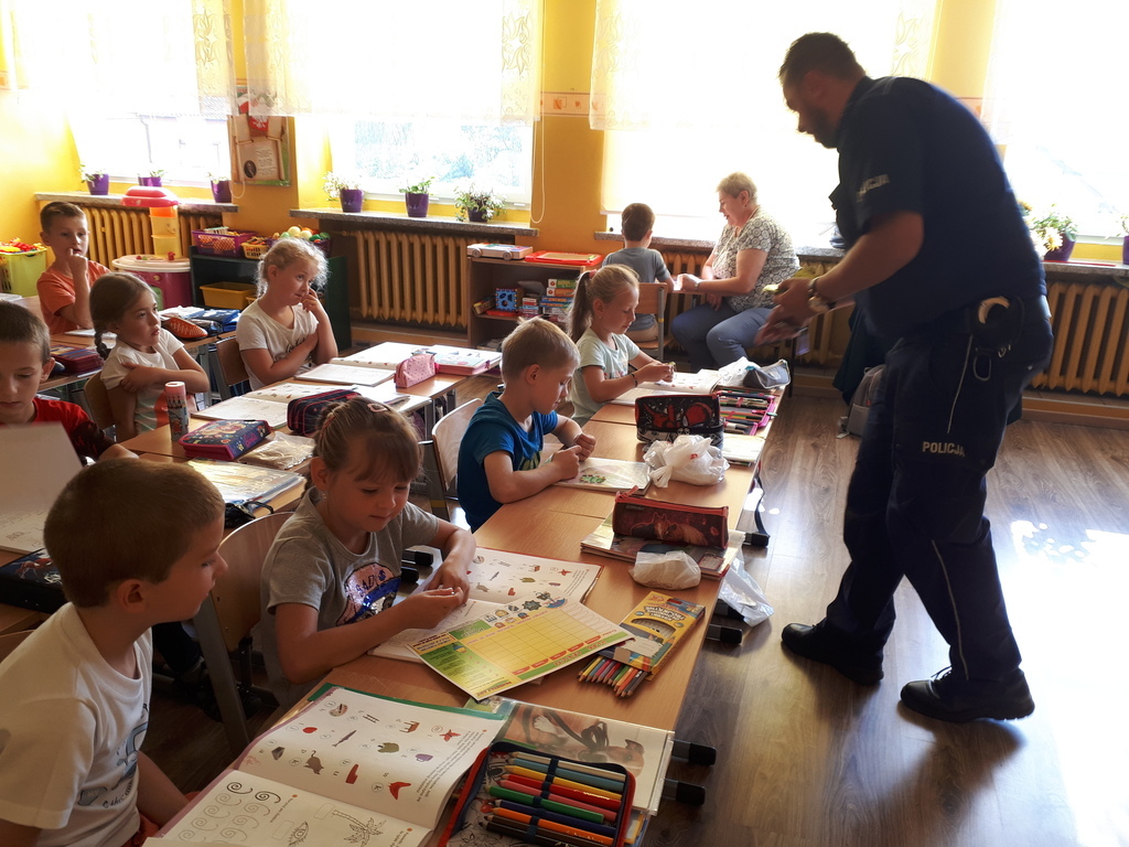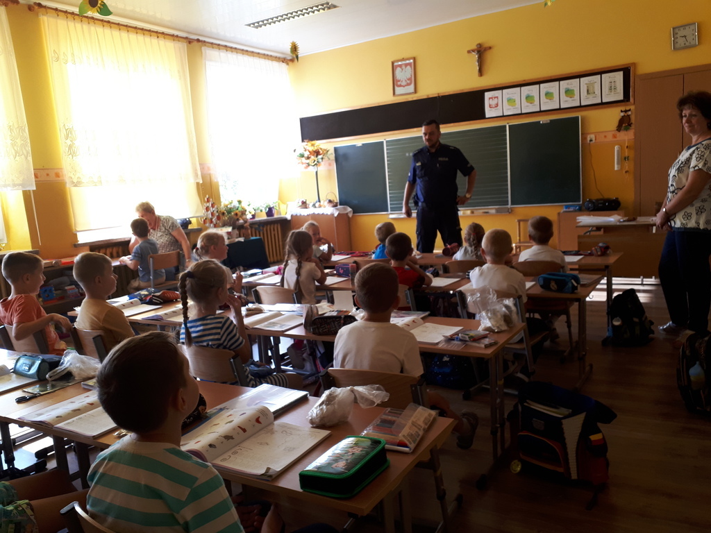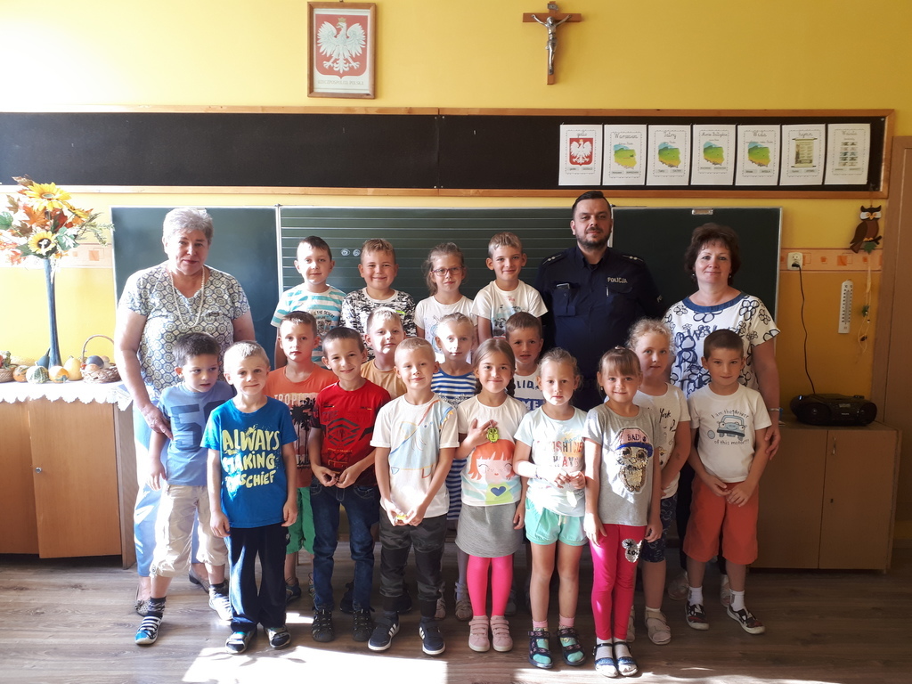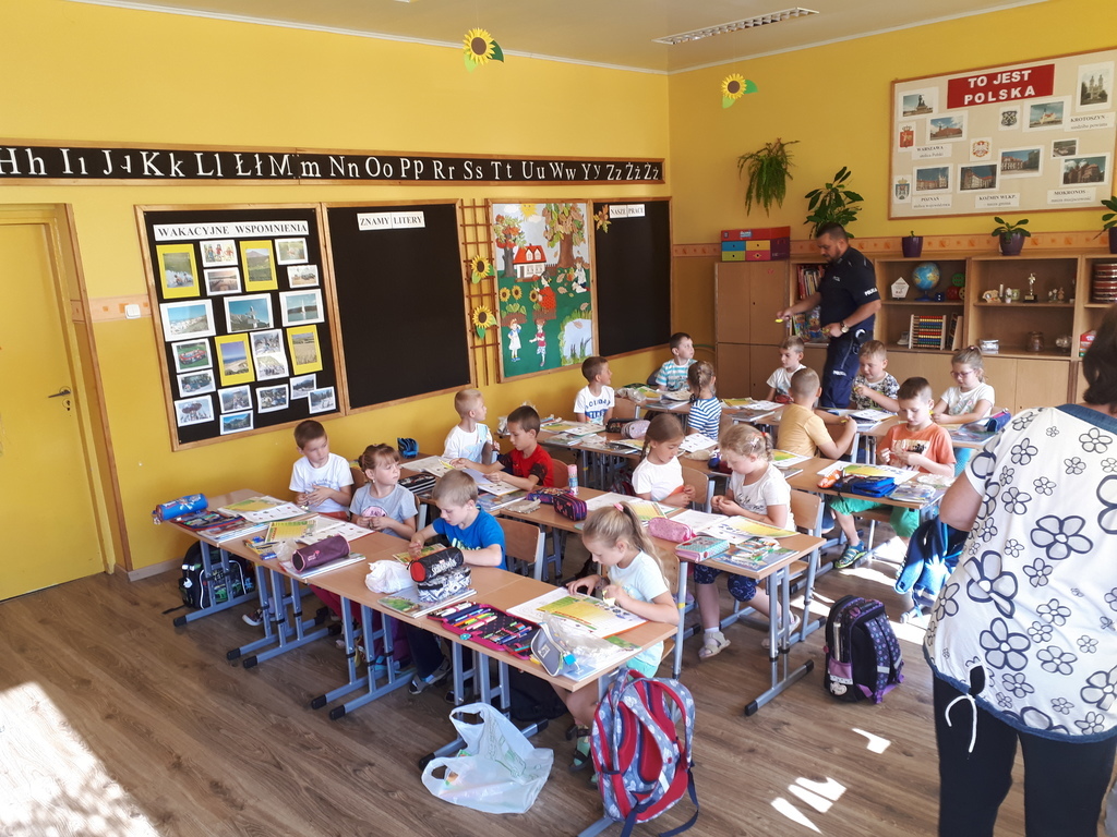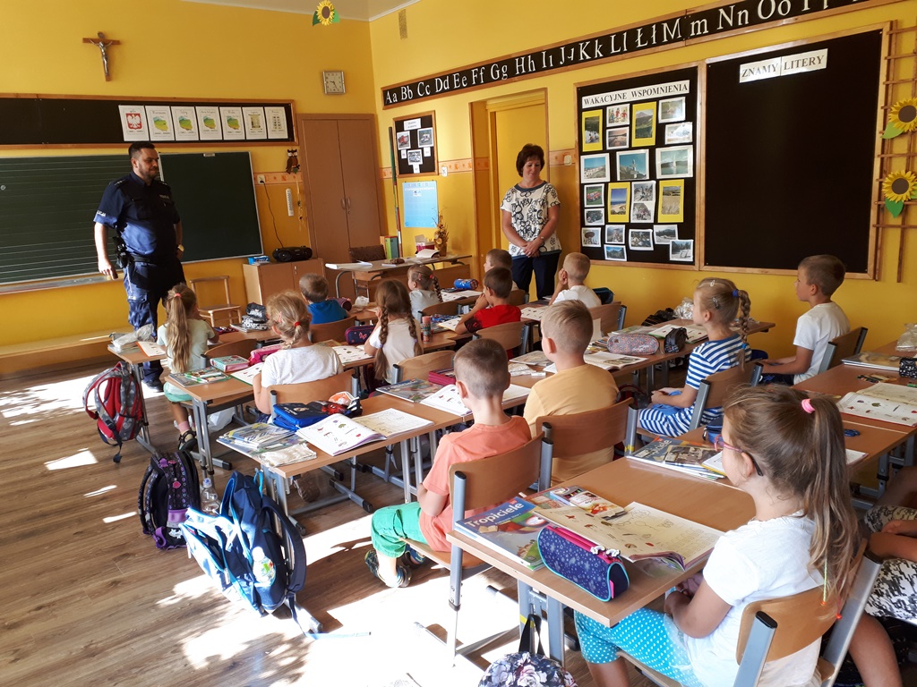 Dnia 07.09.br. odwiedził naszą szkołę pan policjant – mł. asp. Mariusz Przybył z posterunku policji w Koźminie Wlkp. Celem wizyty było spotkanie z pierwszoklasistami u progu nauki szkolnej. Gość opowiadał o bezpieczeństwie poruszania się po drodze pieszych, rowerzystów oraz samochodów. Uświadamiał dzieci, jak ważne dla naszego życia i zdrowia jest noszenie elementów odblaskowych. Przestrzegał również przed nawiązywaniem rozmów z osobami nieznajomymi. Zalecał czujność w każdej nowej i nieznanej sytuacji oraz uczył asertywności.