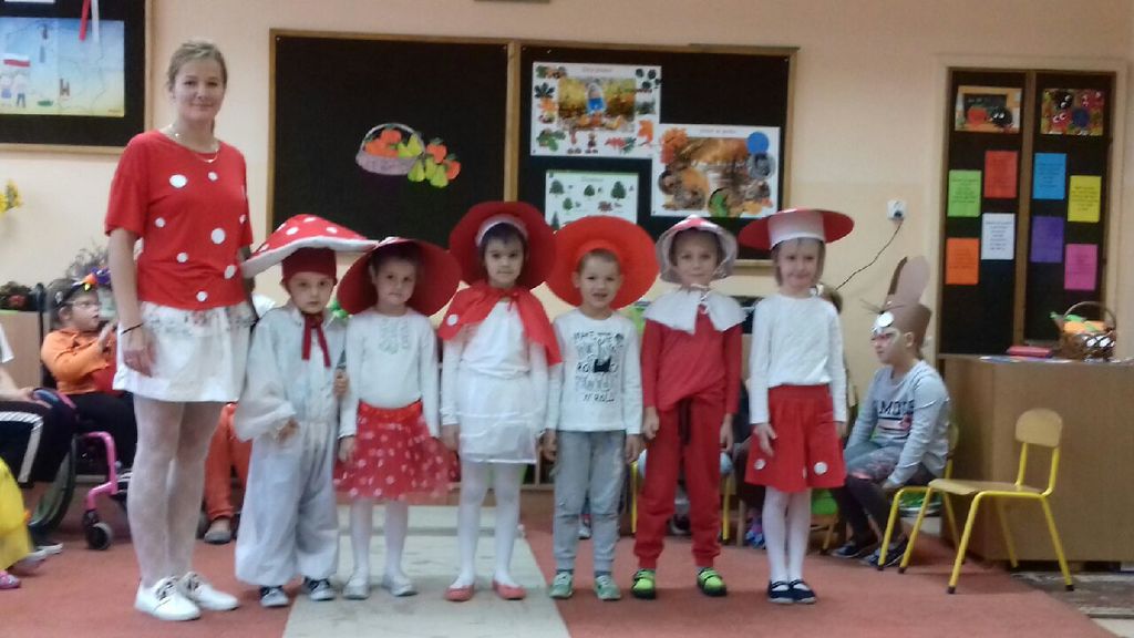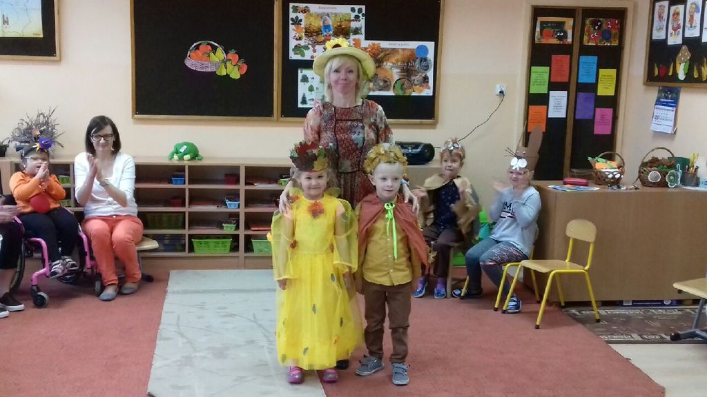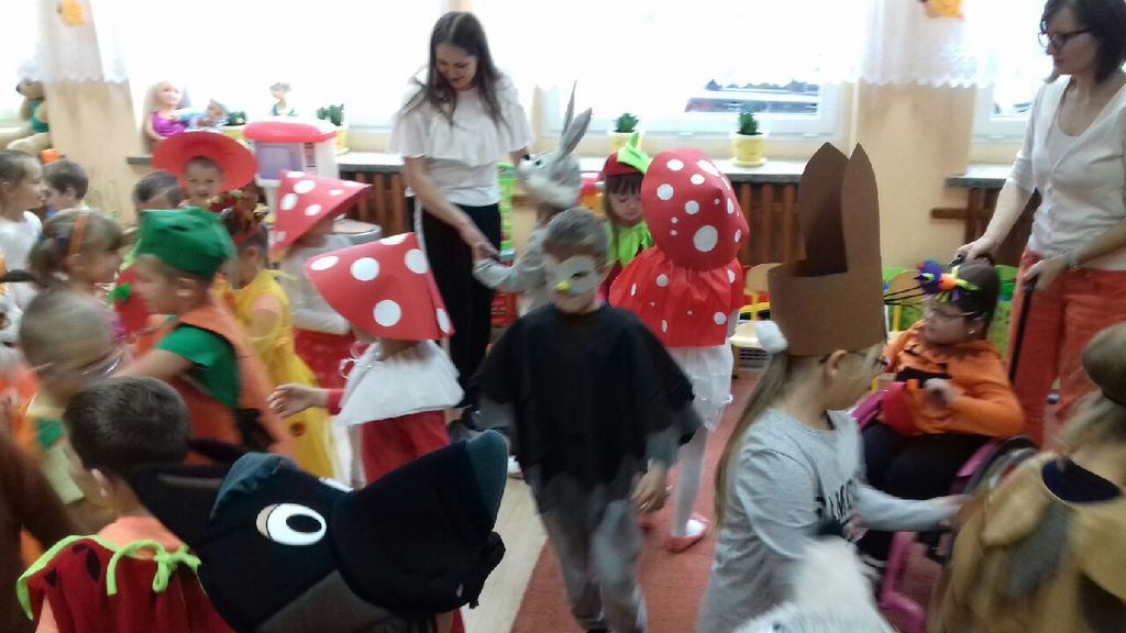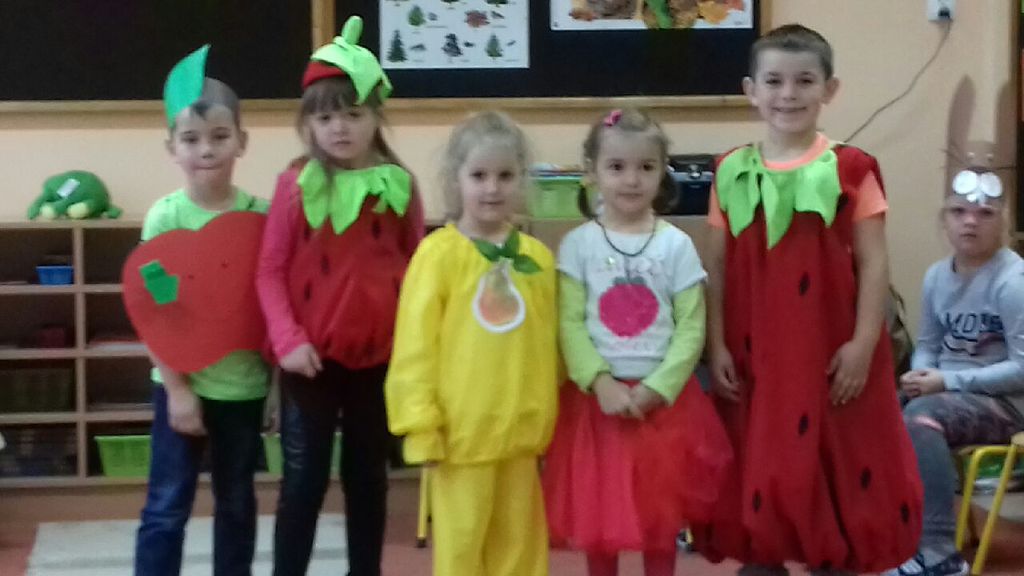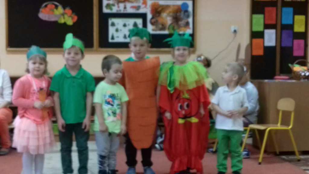 Oddziały przedszkolne obchodziły święto warzyw i owoców. Dnia 23.10.2018 r. dzieci przebrały się za dowolnie wybrany dar jesieni. Przedszkolaki zaprezentowały się na ekologicznym dywanie prezentując swoje stroje. W tym dniu przedstawiono teatrzyk kukiełkowy owoców i warzyw „ile mają w sobie witamin”. Do tańca przygrywała wesoła, skoczna i jesienna muzyka. Przedszkolaki bardzo dobrze się bawiły w ten deszczowy i ponury dzień. Przygotowano dla dzieci słodki poczęstunek i sok jabłkowy.