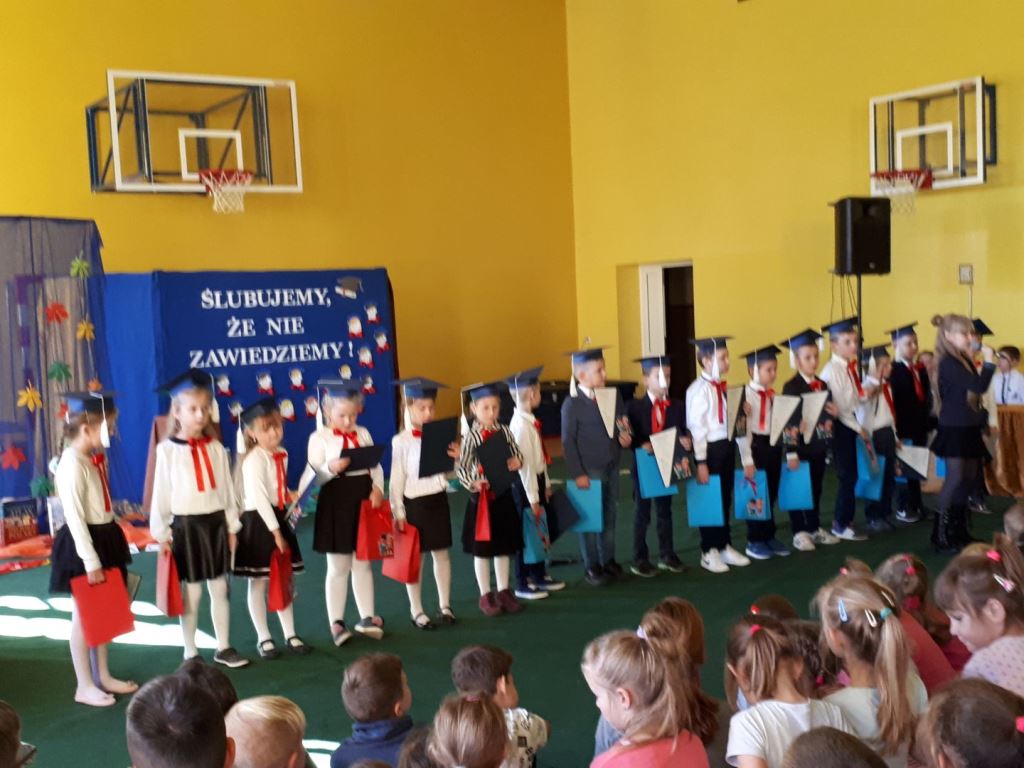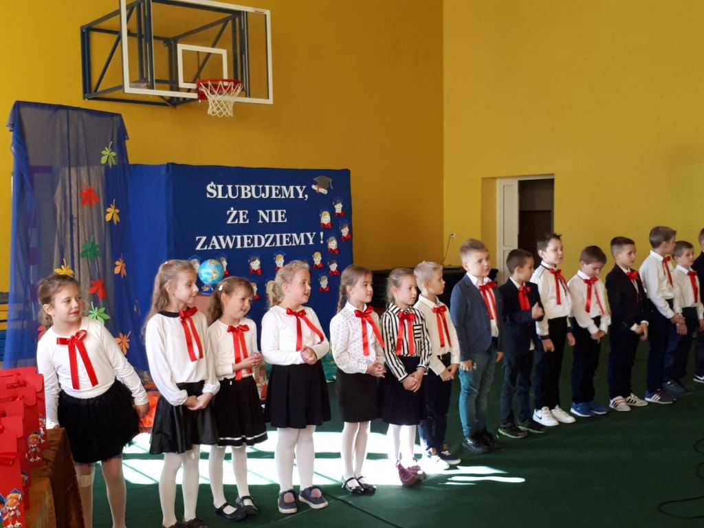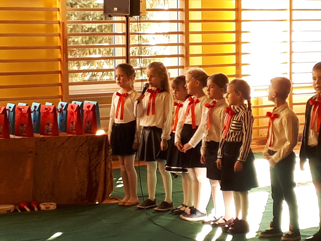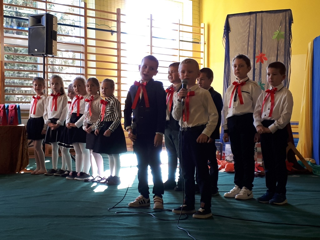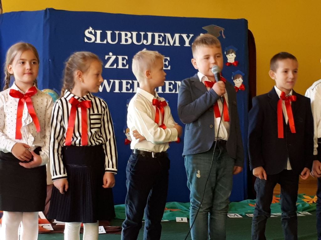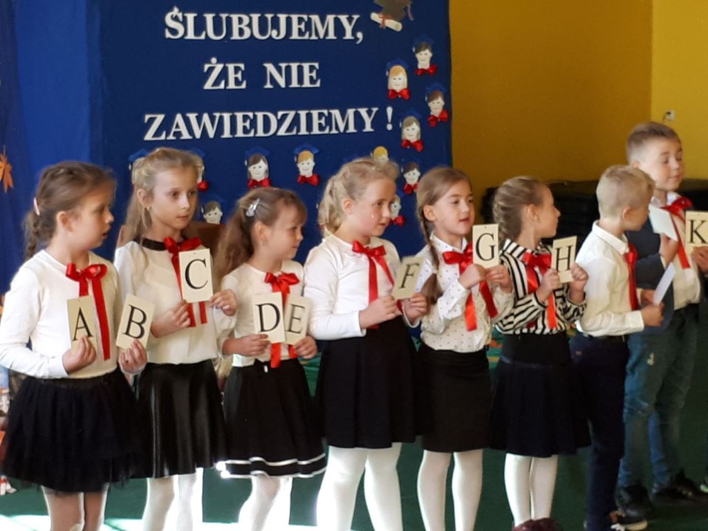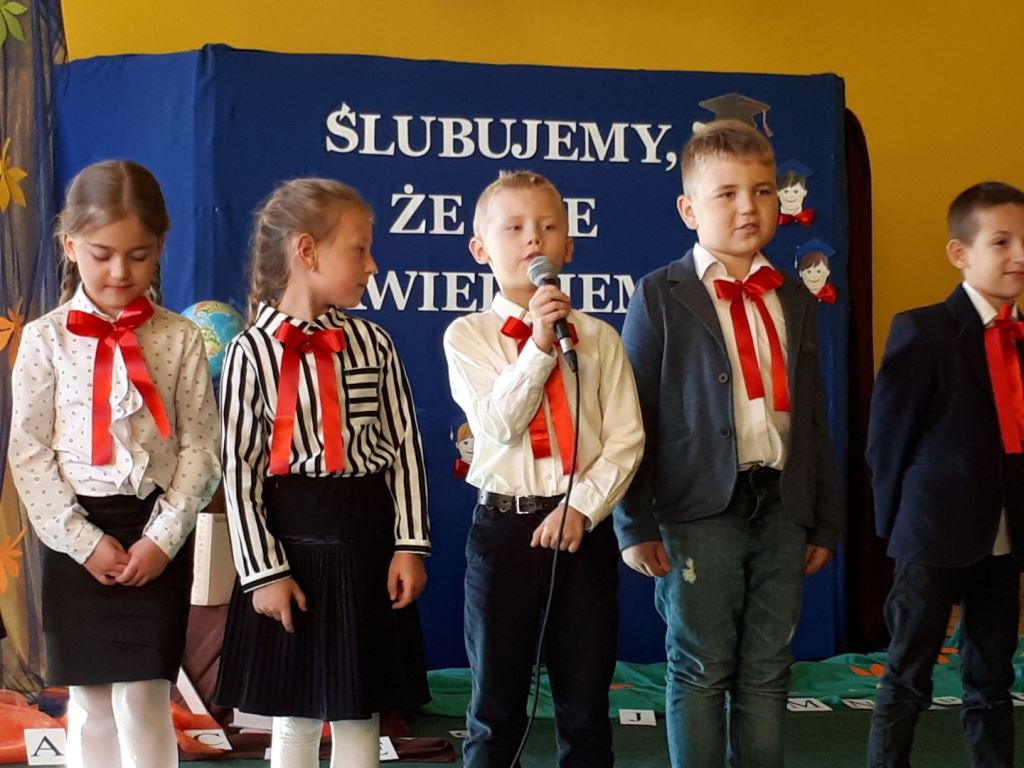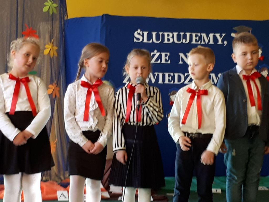 Głównymi bohaterami dnia byli oni – pierwszaki, które poznały już uroki szkolnego życia, a teraz odpowiedzialnie ślubowali, że nie zawiodą. Choć upłynęło dopiero kilka tygodni, jak zasiedli w szkolnych ławach, już dowiedli, że są gotowi sprostać najtrudniejszym zadaniom. Pięknie recytowali wiersze, śpiewali piosenki, tańczyli; po mistrzowsku prezentowali posiadaną wiedzę ze wszystkich edukacji. Dokonali też autoprezentacji mówiąc otwarcie o sobie, swych atutach i minusach. Wspierani obecnością bliskich pokazali wachlarz swych możliwości, aż w oczach niejednego rodzica zakręciła się łza wzruszenia.