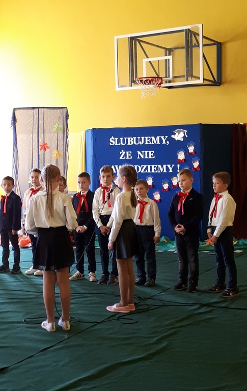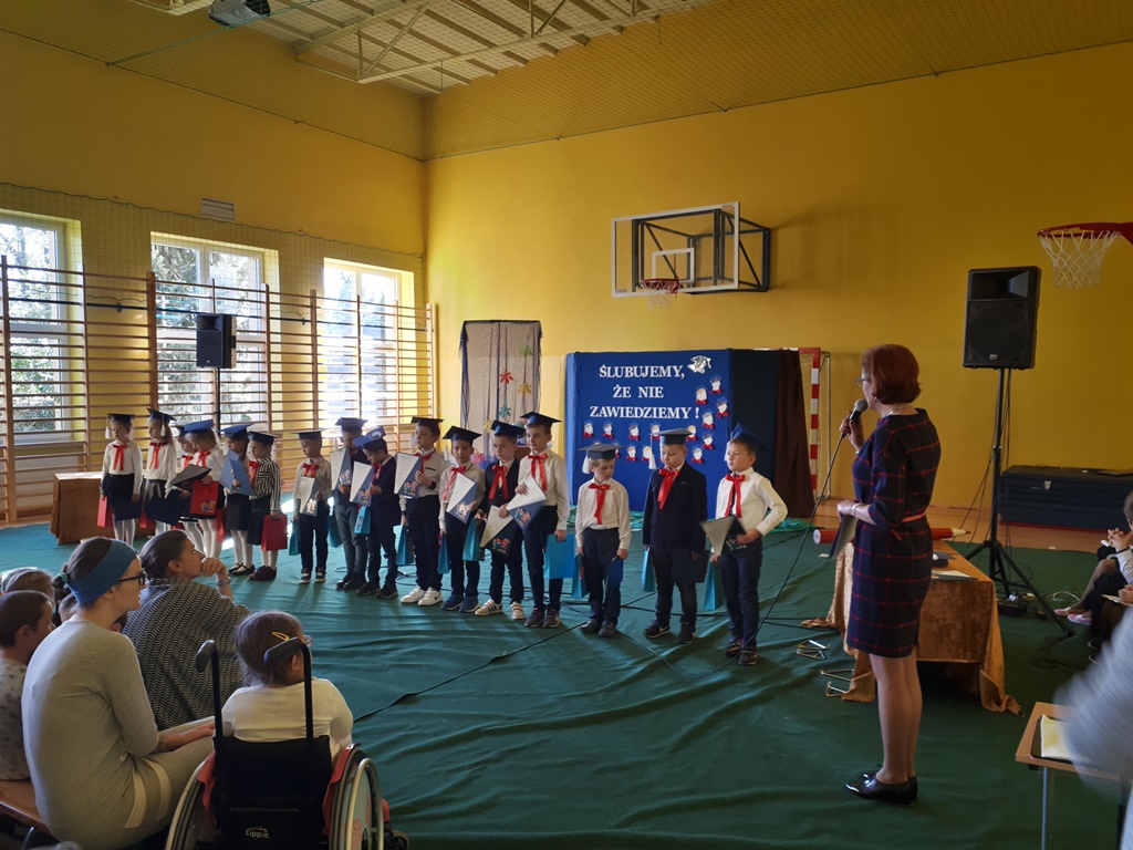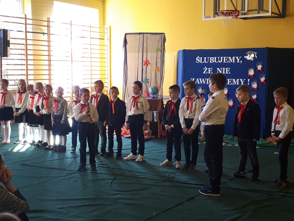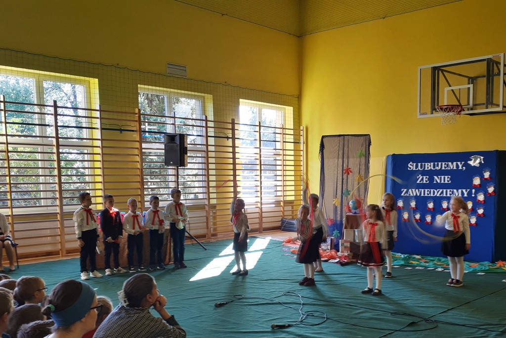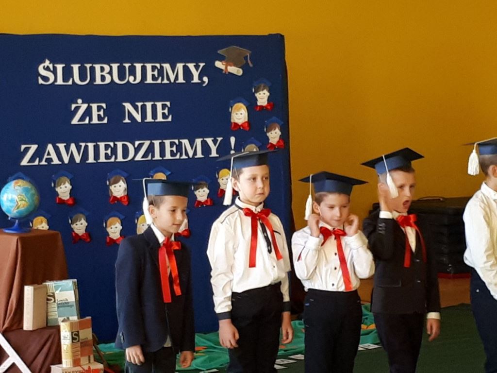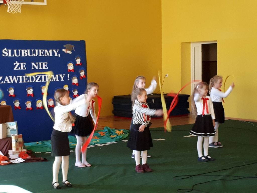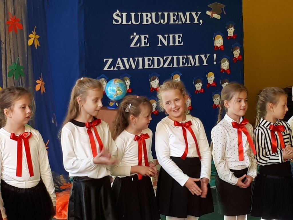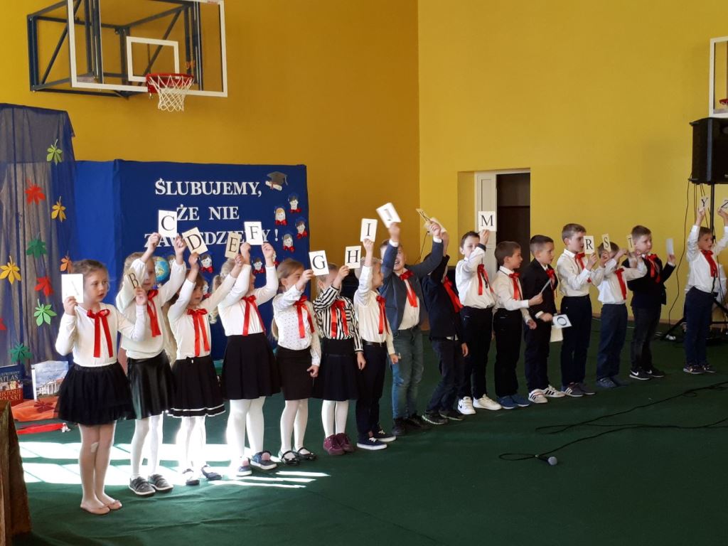 Głównymi bohaterami dnia byli oni – pierwszaki, które poznały już uroki szkolnego życia, a teraz odpowiedzialnie ślubowali, że nie zawiodą. Choć upłynęło dopiero kilka tygodni, jak zasiedli w szkolnych ławach, już dowiedli, że są gotowi sprostać najtrudniejszym zadaniom. Pięknie recytowali wiersze, śpiewali piosenki, tańczyli; po mistrzowsku prezentowali posiadaną wiedzę ze wszystkich edukacji. Dokonali też autoprezentacji mówiąc otwarcie o sobie, swych atutach i minusach. Wspierani obecnością bliskich pokazali wachlarz swych możliwości, aż w oczach niejednego rodzica zakręciła się łza wzruszenia.