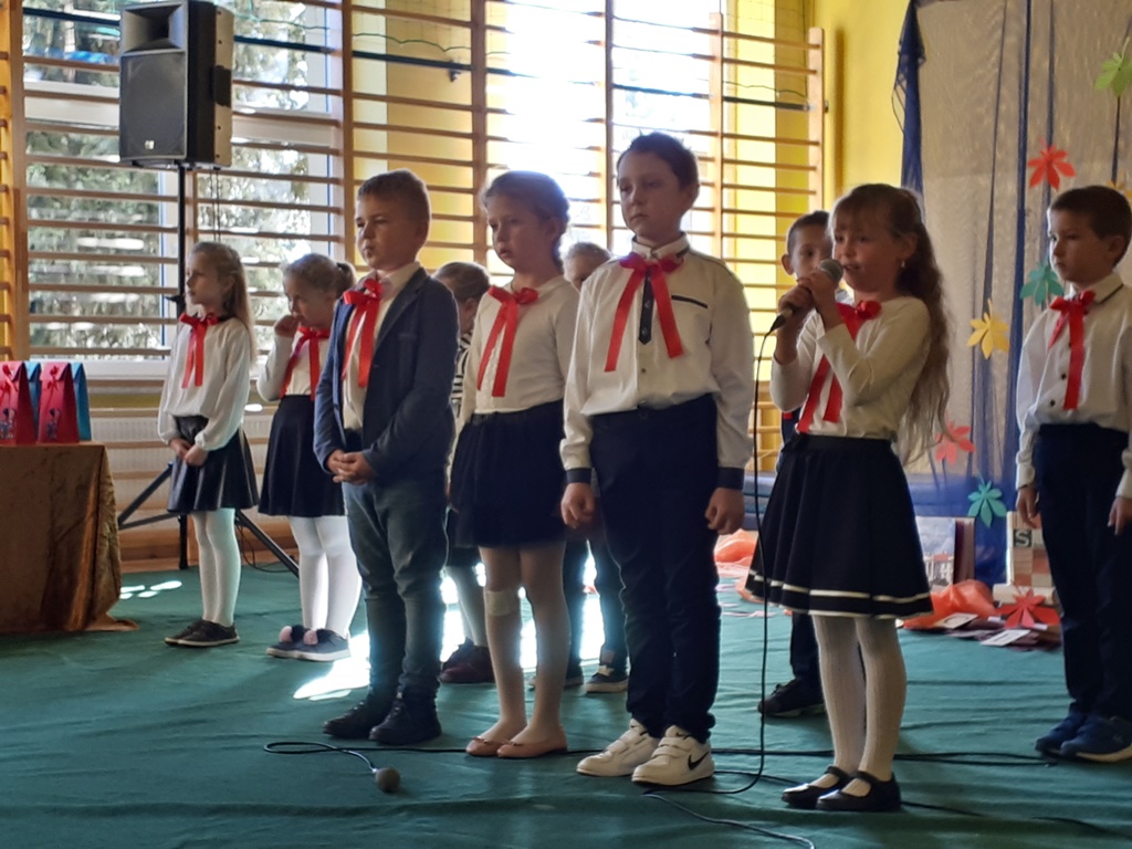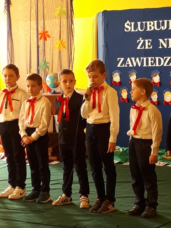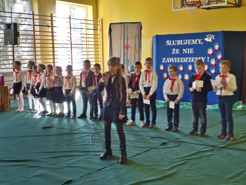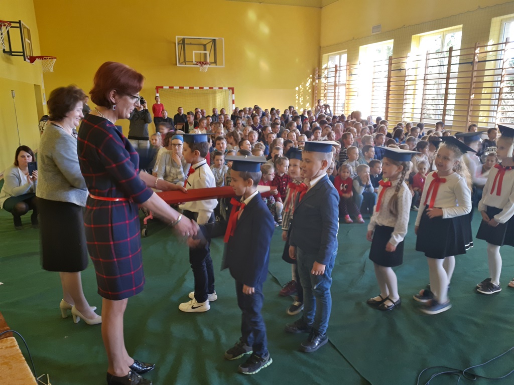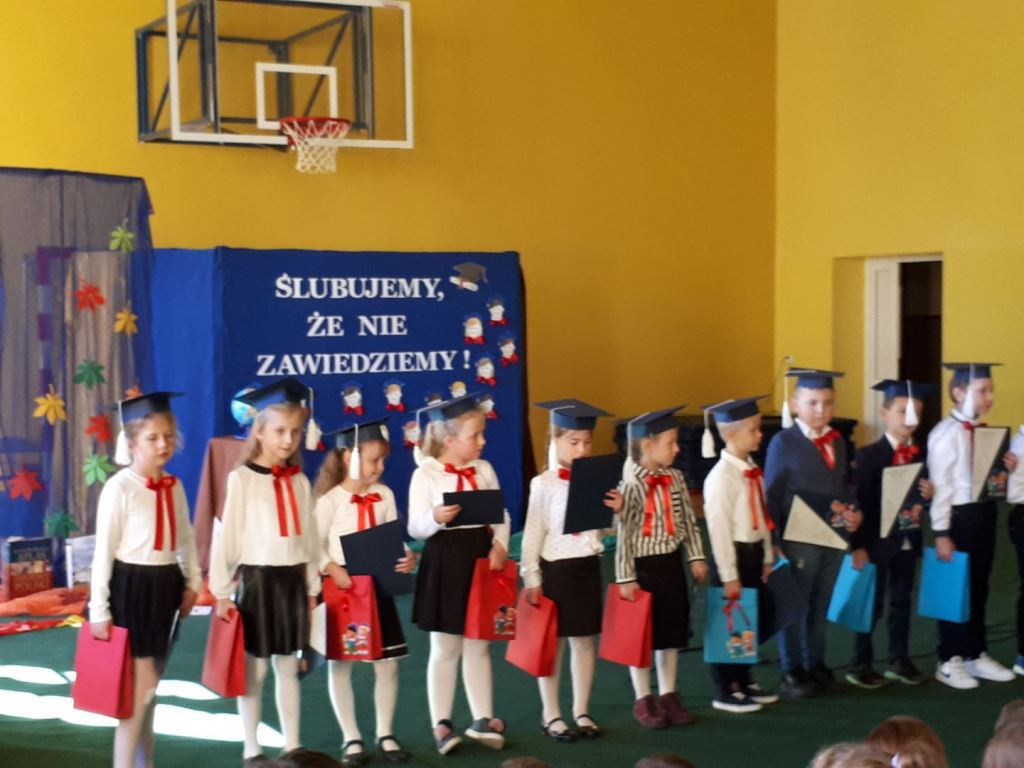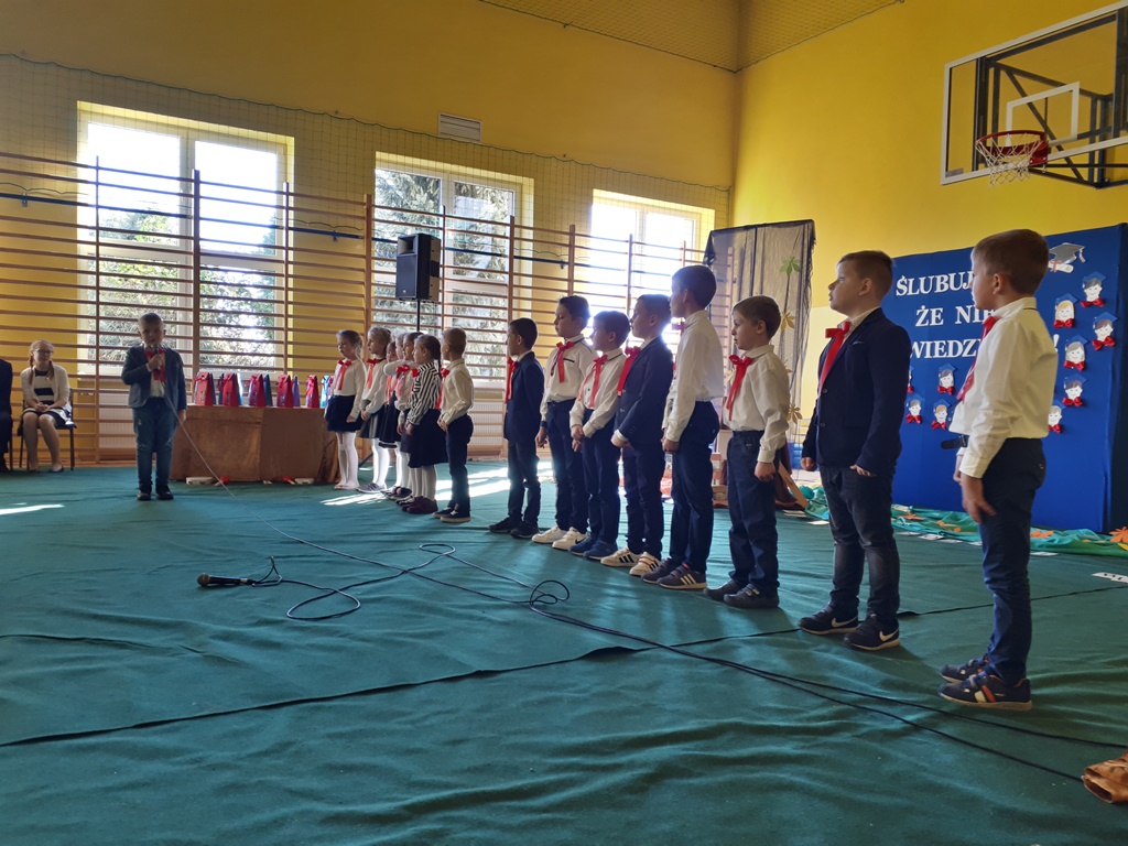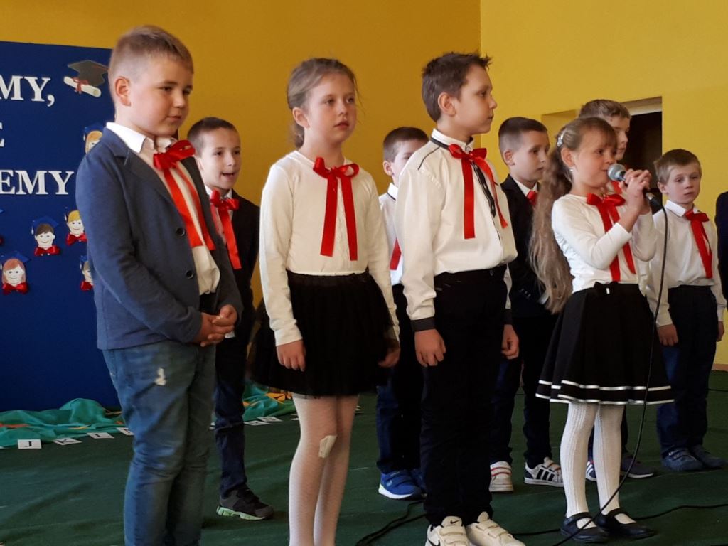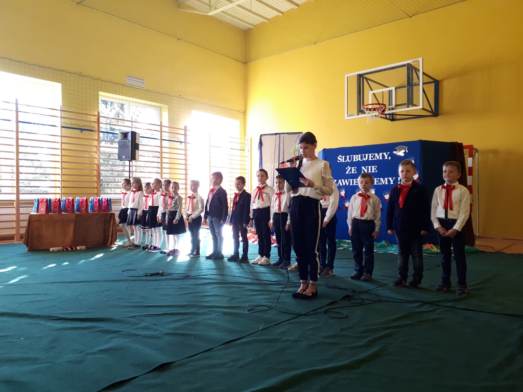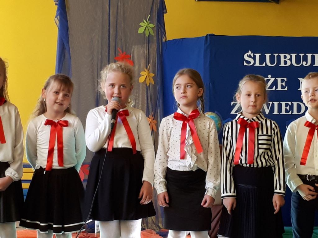Głównymi bohaterami dnia byli oni – pierwszaki, które poznały już uroki szkolnego życia, a teraz odpowiedzialnie ślubowali, że nie zawiodą. Choć upłynęło dopiero kilka tygodni, jak zasiedli w szkolnych ławach, już dowiedli, że są gotowi sprostać najtrudniejszym zadaniom. Pięknie recytowali wiersze, śpiewali piosenki, tańczyli; po mistrzowsku prezentowali posiadaną wiedzę ze wszystkich edukacji. Dokonali też autoprezentacji mówiąc otwarcie o sobie, swych atutach i minusach. Wspierani obecnością bliskich pokazali wachlarz swych możliwości, aż w oczach niejednego rodzica zakręciła się łza wzruszenia.
