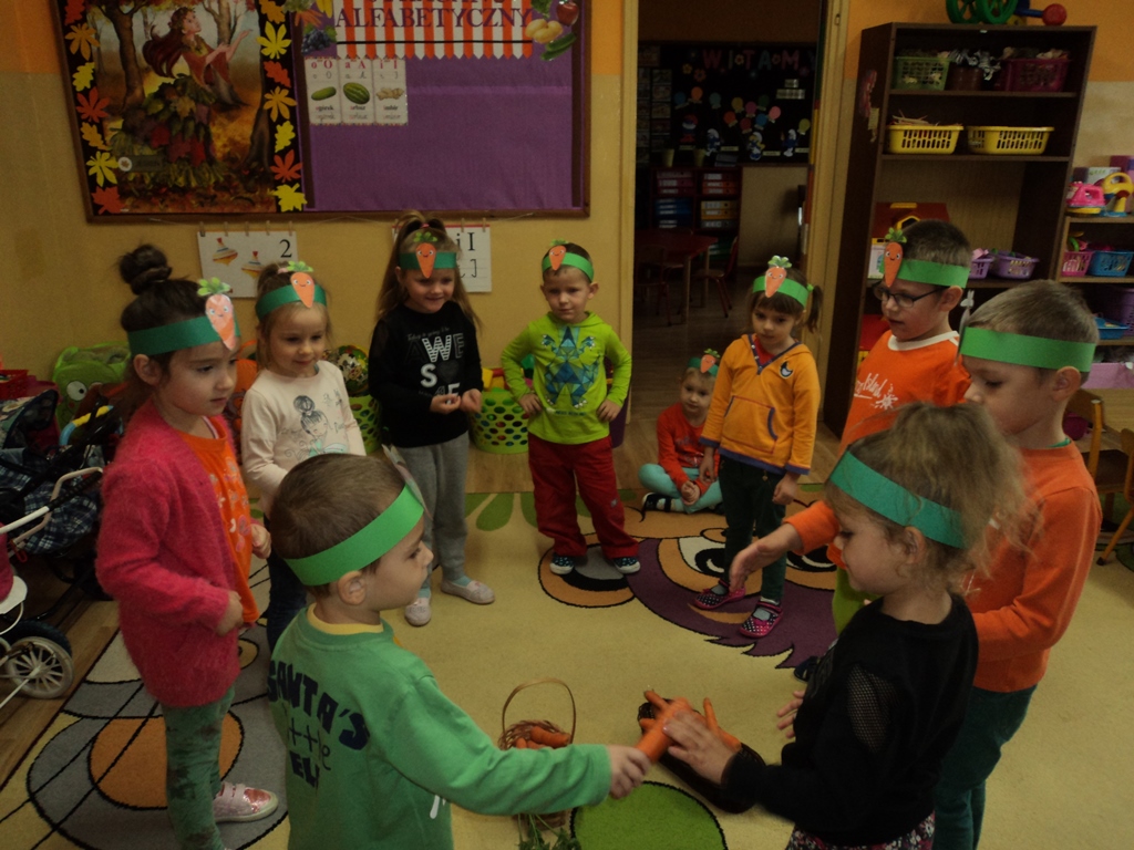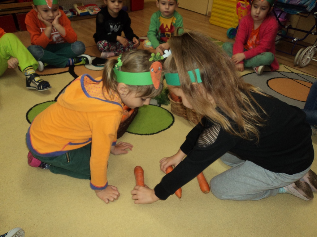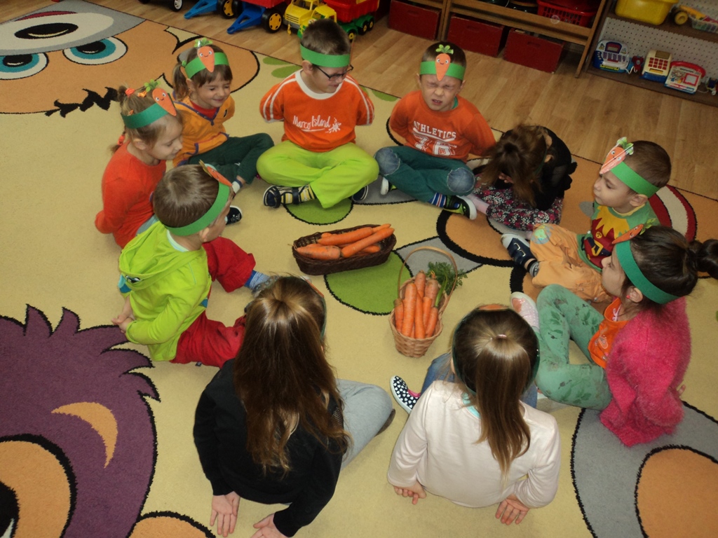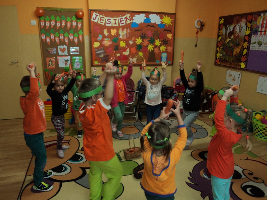 „Na marchewki urodziny, wszystkie zeszły się jarzyny…” - tak oto podśpiewywały sobie przedszkolaki z Wrotkowa w pewien październikowy dzień. W tym to bowiem czasie obchodziliśmy MARCHEWKOWE URODZINY, podczas których dzieci poznawały niektóre właściwości tego warzywa. Tego dnia dzieci ubrane na pomarańczowo i zielono z marchewkowymi opaskami na głowach uczestniczyły w bloku integracyjnym związanym z tym warzywem. Porównywały marchewki ze sobą i pląsały w rytm wesołej muzyki. Maluchy określiły też kolor, kształt, fakturę oraz smak warzywa. Dzieciaki wykonały papierowe marchewki. Jednak punktem kulminacyjnym dnia było wykonanie surówki z marchewki.
