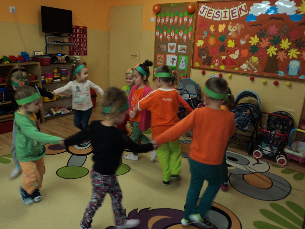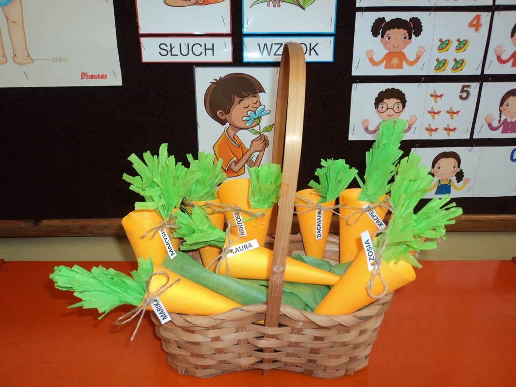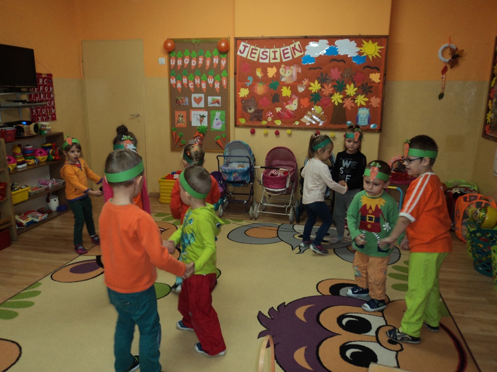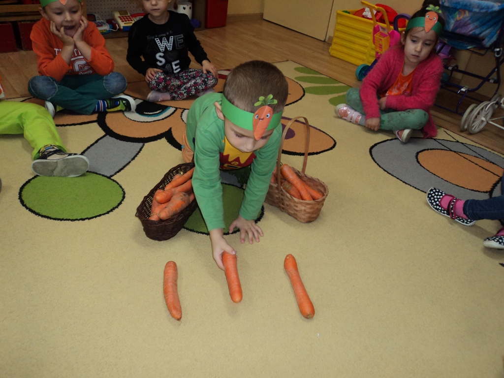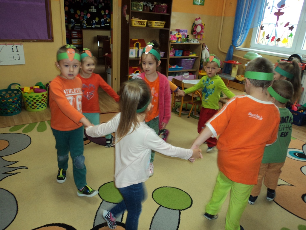 „Na marchewki urodziny, wszystkie zeszły się jarzyny…” - tak oto podśpiewywały sobie przedszkolaki z Wrotkowa w pewien październikowy dzień. W tym to bowiem czasie obchodziliśmy MARCHEWKOWE URODZINY, podczas których dzieci poznawały niektóre właściwości tego warzywa. Tego dnia dzieci ubrane na pomarańczowo i zielono z marchewkowymi opaskami na głowach uczestniczyły w bloku integracyjnym związanym z tym warzywem. Porównywały marchewki ze sobą i pląsały w rytm wesołej muzyki. Maluchy określiły też kolor, kształt, fakturę oraz smak warzywa. Dzieciaki wykonały papierowe marchewki. Jednak punktem kulminacyjnym dnia było wykonanie surówki z marchewki.