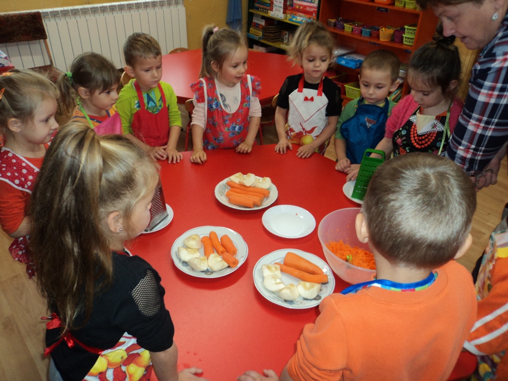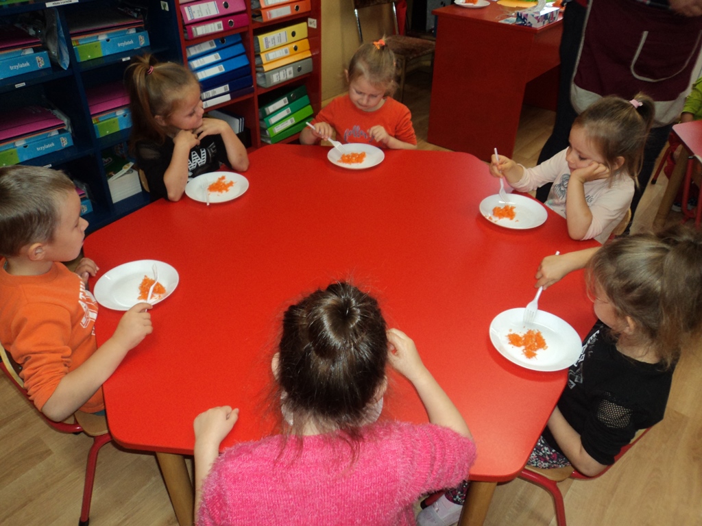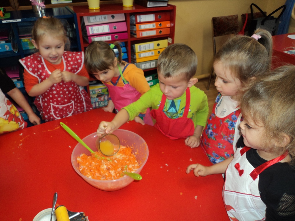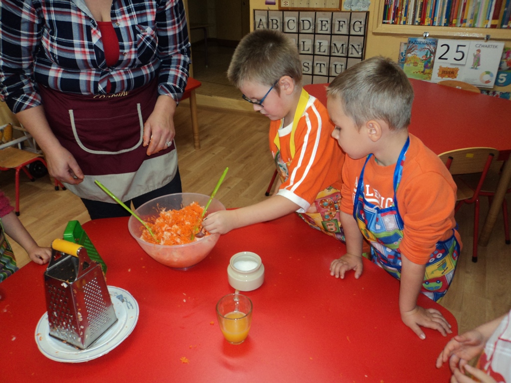 Każde dziecko samodzielnie tarło marchewkę oraz kawałek jabłka na tarce i wrzucało je do miski. Miny i doznania smakowe dzieci były różne, jedne zjadały surówkę z „apetytem”, inne wolały tylko spróbować swojego dzieła i na tym poprzestały. Ale najważniejsze, że wszystkie maluchy wyszły z przedszkola pełne sił witalnych i wszystkie przedszkolaki obiecały, że będą zajadać się marchewkami pod każdą postacią, ponieważ nasze dzieciaki już wiedzą, że „…aby być zdrowym, jak ryba trzeba owoce jeść i warzywa!”.