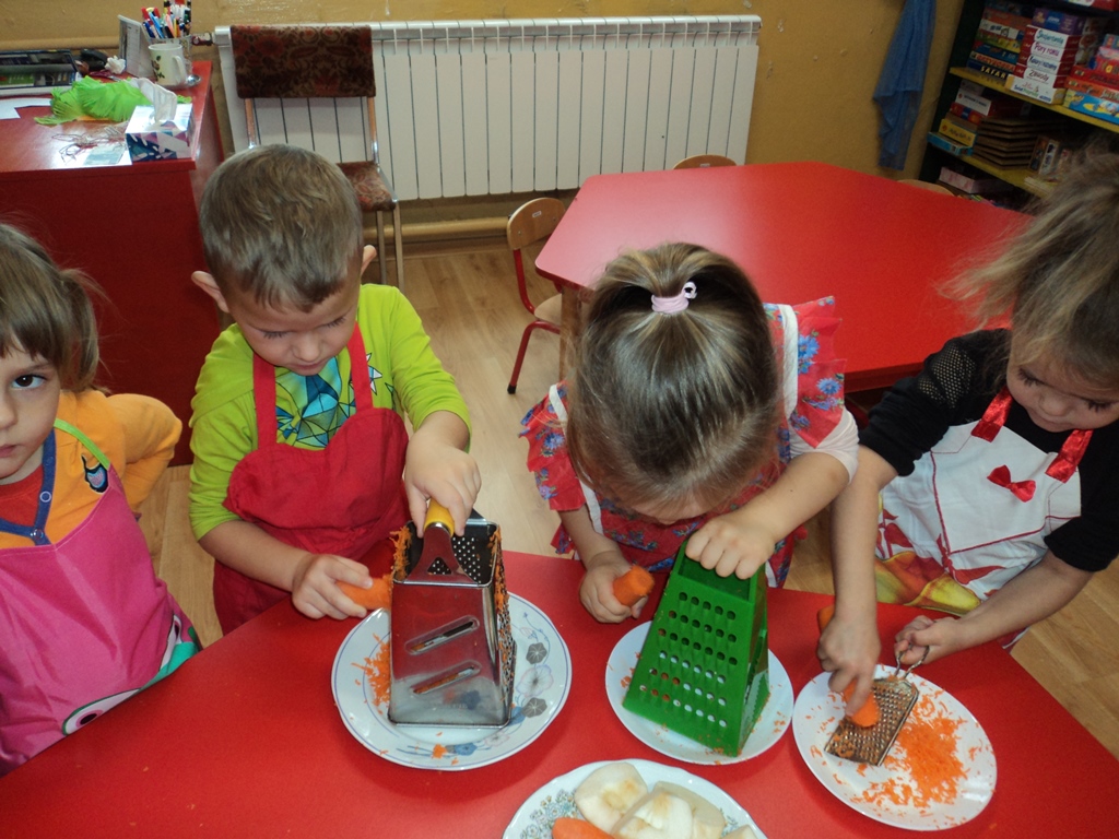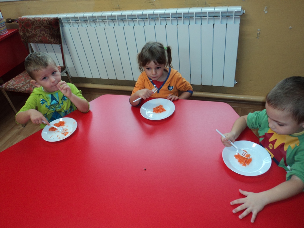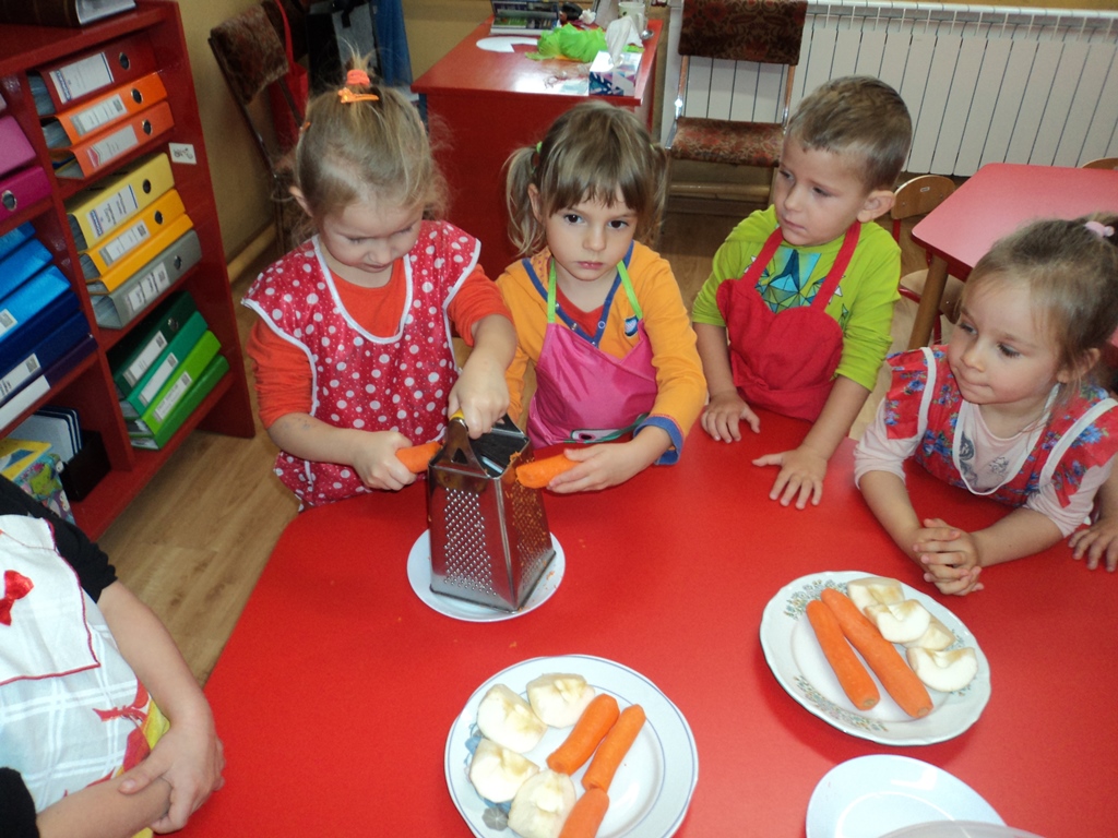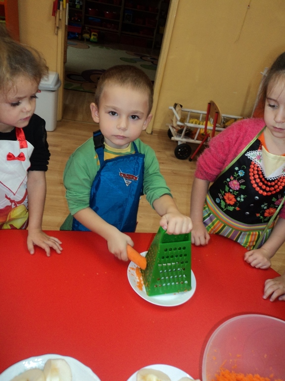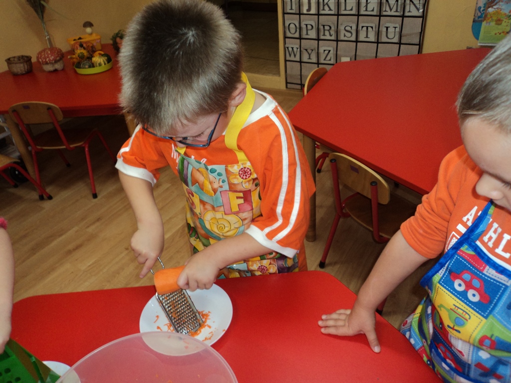 Każde dziecko samodzielnie tarło marchewkę oraz kawałek jabłka na tarce i wrzucało je do miski. Miny i doznania smakowe dzieci były różne, jedne zjadały surówkę z „apetytem”, inne wolały tylko spróbować swojego dzieła i na tym poprzestały. Ale najważniejsze, że wszystkie maluchy wyszły z przedszkola pełne sił witalnych i wszystkie przedszkolaki obiecały, że będą zajadać się marchewkami pod każdą postacią, ponieważ nasze dzieciaki już wiedzą, że „…aby być zdrowym, jak ryba trzeba owoce jeść i warzywa!”.