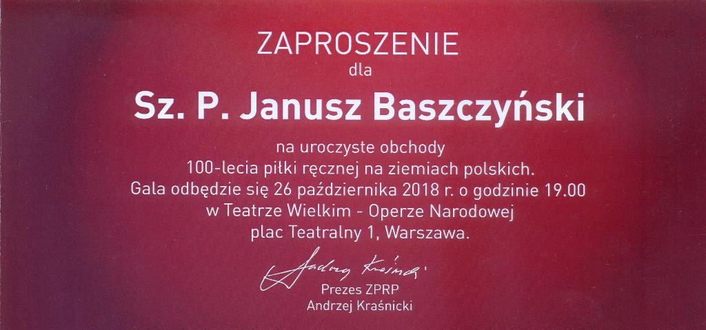 26 października 2018 w piątkowy wieczór w Teatrze Wielkim – Operze Narodowej w Warszawie odbyła się Gala 100-lecia Piłki Ręcznej w Polsce. Pan Janusz Baszczyński miał przyjemność uczestniczyć w tej uroczystości.