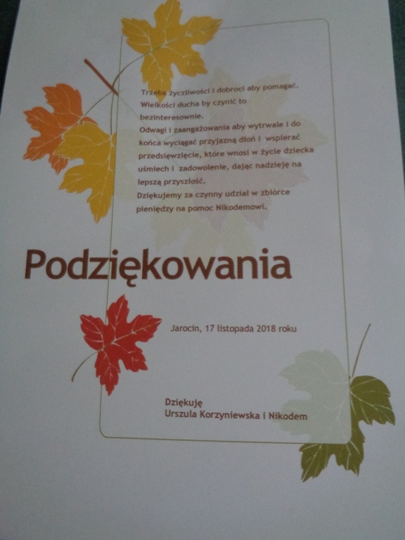 19 listopada nauczyciele wraz z dziećmi połączyli siły, aby dotrzeć do jarocińskiego kina na charytatywny spektakl teatralny w wykonaniu kabaretu Bzik pt: "Nasze podwórko". Wszystko po to, by zebrać jak najwięcej pieniędzy i pomóc choremu chłopcu, który zbiera fundusze na poważną operację w Niemczech. Nikodem, którego mieliśmy okazję poznać to bardzo pogodny chłopiec, który na codziennie dzielnie zmaga się ze swoją chorobą. Nasze wspaniałe dzieciaki wsparły działania, które mają pomóc chłopcu wyjechać na operację poza granice naszego kraju i chętnie wrzucały pieniążki do puszki. To była dla nich wspaniała lekcja, która uczy, że