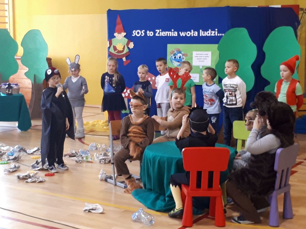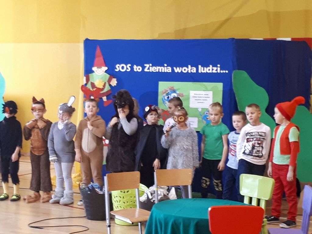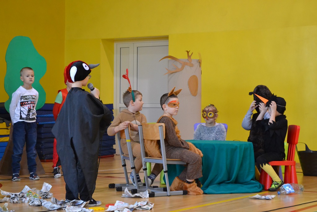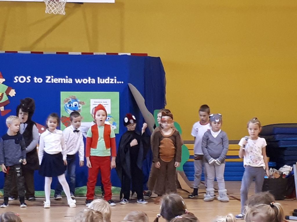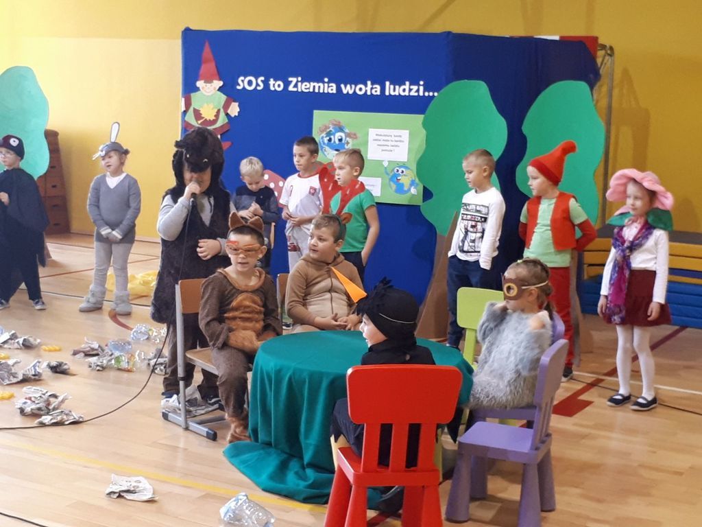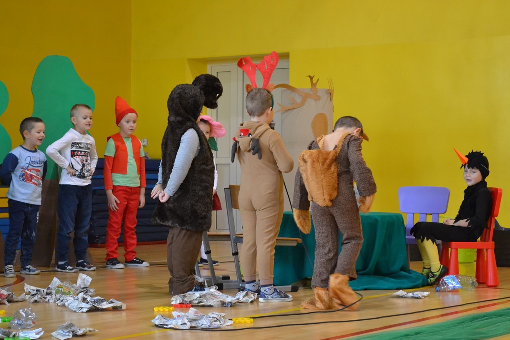 20 listopada w murach naszej szkoły odbyło się przedstawienie ekologiczne pt. "Leśna opowieść" w wykonaniu dzieci sześcioletnich mające na celu uwrażliwienie najmłodszych na przestrzeganie zasad proekologicznych. Sześciolatki wraz z wychowawczynią przygotowały ciekawe przedstawienie. Przedszkolaki były przebrane w różnorodne stroje, wczuły się w swoje role co spowodowało, że występ był bardzo udany. Uwagę zwracała dekoracja, która pomogła wprowadzić widza w cały zamysł widowiska. Jednak najważniejszy w przedstawieniu był jego przekaz. Miał on uwrażliwić dzieci i dorosłych na szkody spowodowane zanieczyszczeniem naszej planety. Jest to bardzo ważny temat, który powinien być rozpowszechniany i każdemu bardzo dobrze znany. Podczas przedstawienia przedszkolaki pokazały jakie negatywne skutki powoduje niewłaściwe zachowanie związane z zaśmiecaniem naszego środowiska oraz jak powinno być i co powinniśmy robić aby im zapobiec. Między innymi pojawiła się lekcja segregacji śmieci, ukazanie jaki wpływ ma na nasze zdrowie zanieczyszczone środowisko oraz jakie negatywne skutki ma dla naszej planety.