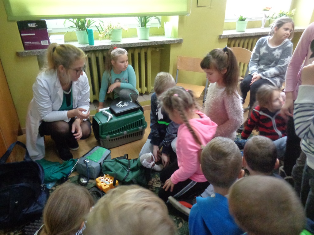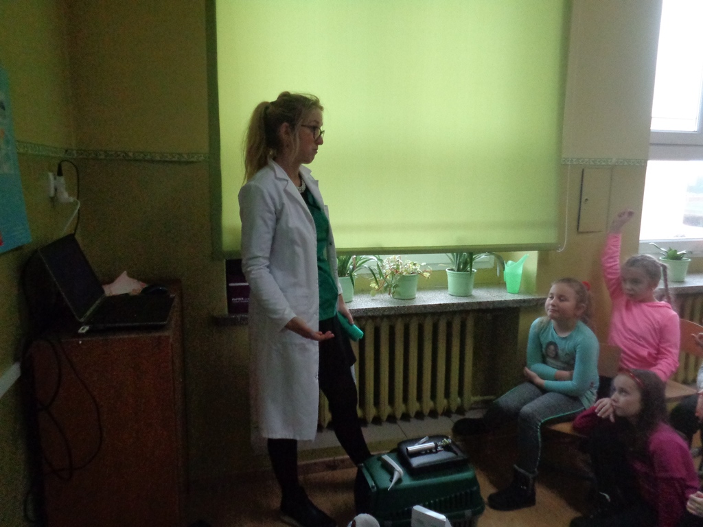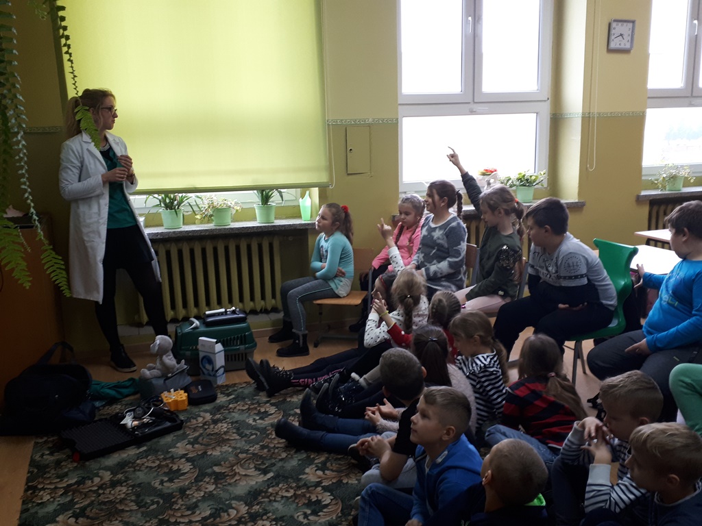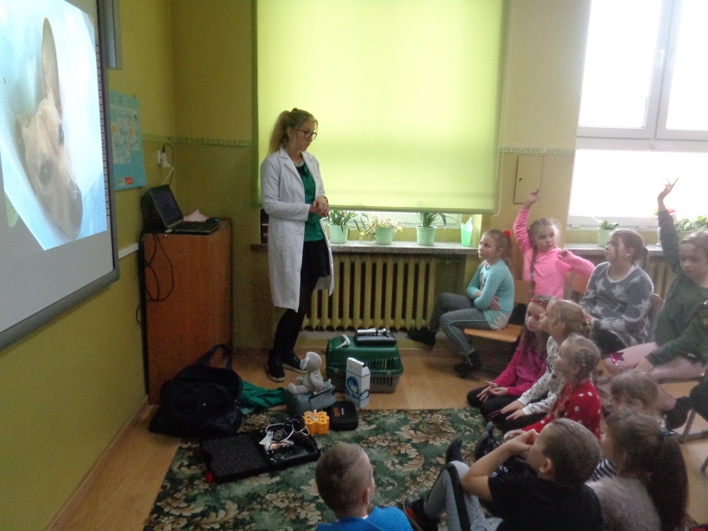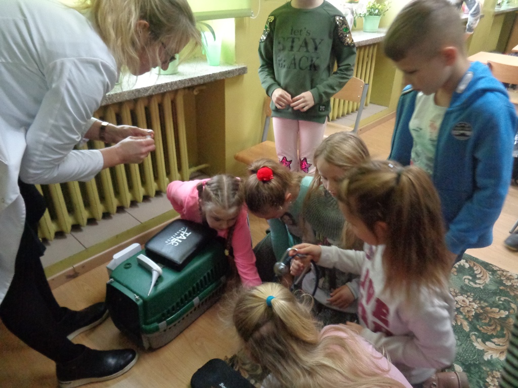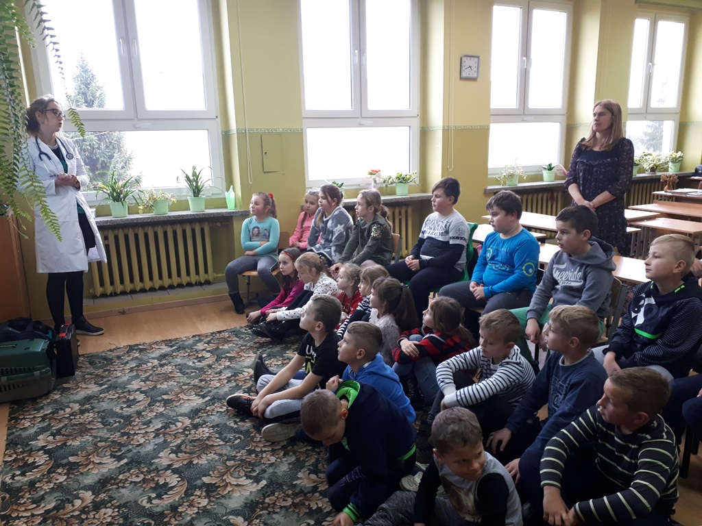 28 listopada 2018r. klasę II i III odwiedziła pani weterynarz Olga Pietrasina. Celem spotkania było poznanie pracy weterynarza i zdobycie wiedzy na temat dbania i pielęgnowania zwierząt domowych, a także kształtowanie postaw humanitarnych w stosunku do zwierząt. Dzieci brały aktywny udział w spotkaniu, szukały odpowiedzi na nurtujące ich wątpliwości dotyczące pielęgnacji zwierząt i chorób, które je dotykają. Dowiedziały się rówznież co zawiera torba lekarska. Mogły obejrzeć wiele narzędzi lekarskich, którymi na co dzień posługuje się weterynarz.