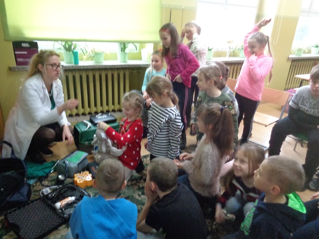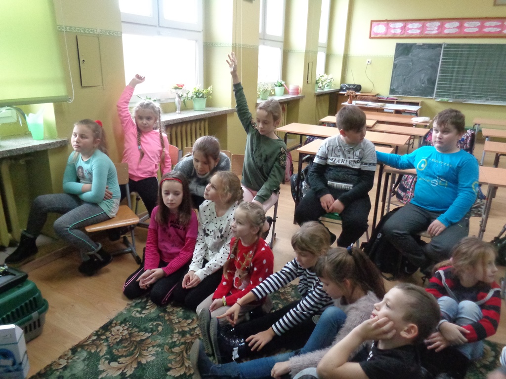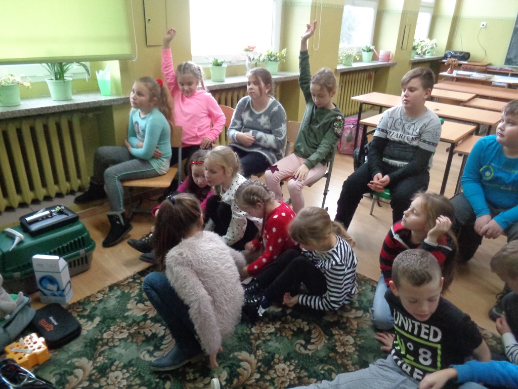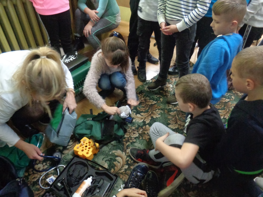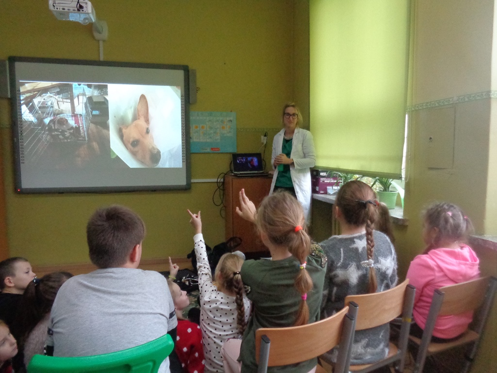 28 listopada 2018r. klasę II i III odwiedziła pani weterynarz Olga Pietrasina. Celem spotkania było poznanie pracy weterynarza i zdobycie wiedzy na temat dbania i pielęgnowania zwierząt domowych, a także kształtowanie postaw humanitarnych w stosunku do zwierząt. Dzieci brały aktywny udział w spotkaniu, szukały odpowiedzi na nurtujące ich wątpliwości dotyczące pielęgnacji zwierząt i chorób, które je dotykają. Dowiedziały się rówznież co zawiera torba lekarska. Mogły obejrzeć wiele narzędzi lekarskich, którymi na co dzień posługuje się weterynarz.