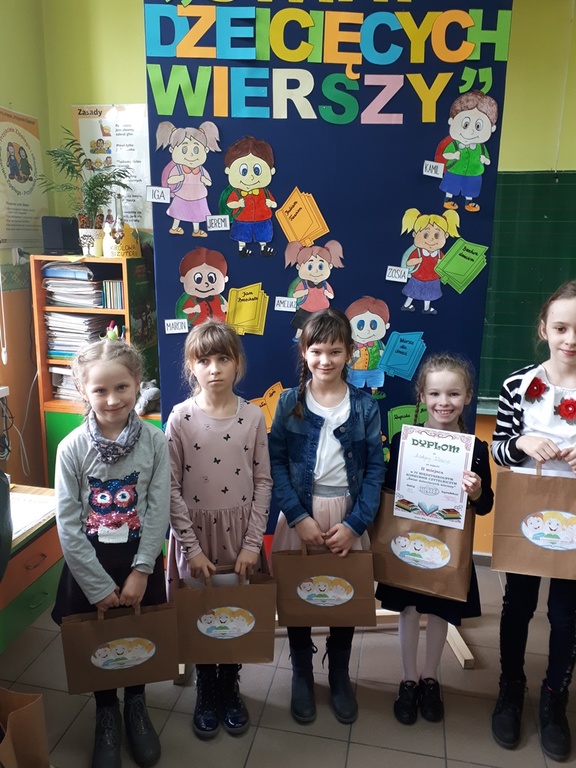 Dnia 01 marca 2019r. w Szkole Podstawowej Nr 1 w Koźminie Wlkp. odbył się konkurs czytelniczy "Świat dziecięcych wierszy" dla klasy II - III. Naszą szkołę reprezentowały uczennice klasy III - Marta Marcinek i Jagoda Kostka oraz uczennice klasy II - Martyna Klause, Martyna Wasik i Aleksandra Trawińska. Test, z którym zmagali się uczestnicy, zawierał zadania zamknięte i otwarte. Wszyscy biorący udział konkursie wykazali się bardzo dużą znajomością wierszy Jana Brzechwy, Juliana Tuwina i Danuty Wawiłow. Największą wiedzą znajomości wierszy wyjkazała się Matyna Klause, zajmując zaszczytne II miejsce. Jesteśmy z tego bardzo dumni. Wszystkim uczestnikom dziękujemy za ogromny trud i pracę w przygotowaniu sie do konkursu. Gratulujemy osiągniętych wyników! Liczymy na Was w przyszłym roku :)