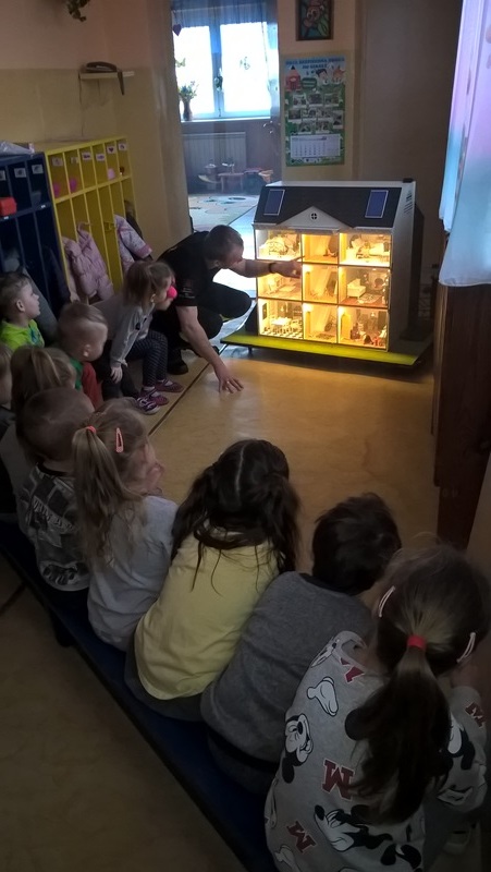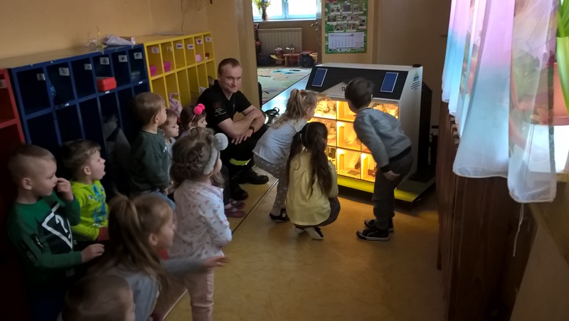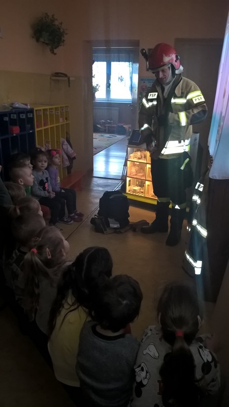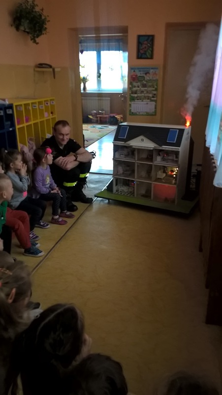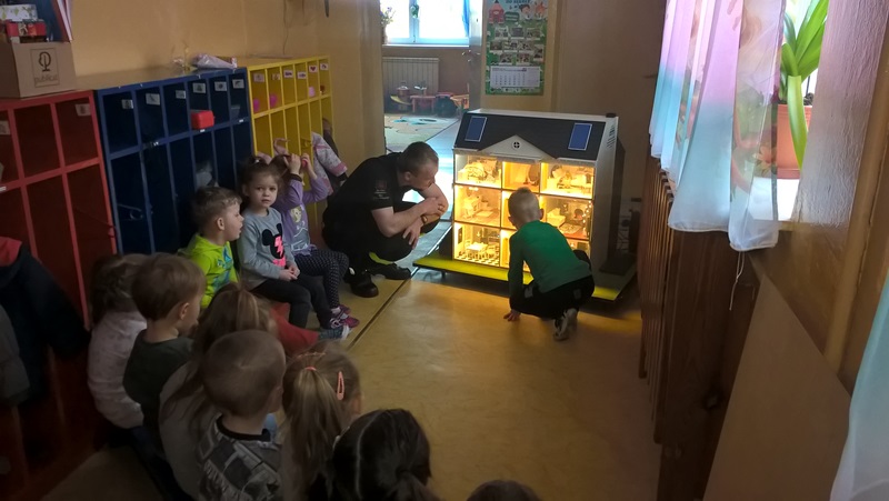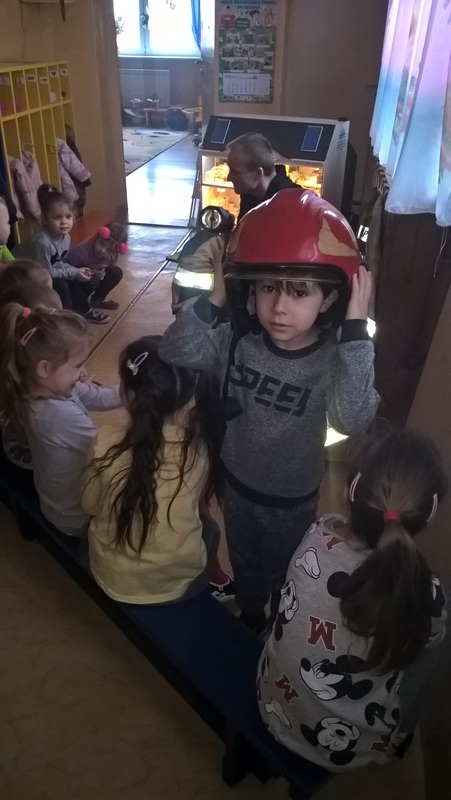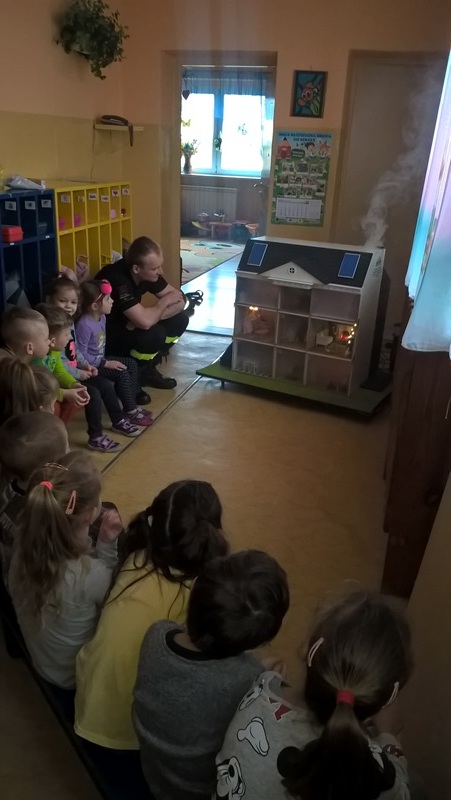 W trakcie spotkania strażacy zaznajomili dzieci z ciekawostkami związanymi z ich pracą zawodową, przestrzeganiem zakazów oraz zachowaniem bezpieczeństwa. Dzieci miały okazję zapoznać się z mobilnym symulatorem zagrożeń pożarowych domu jednorodzinnego, w którym, w poszczególnych pomieszczeniach takich jak kuchnia, sypialnia czy łazienka zaaranżowano potencjalne zagrożenia pożarowe. Dzieci bardzo aktywnie uczestniczyły w spotkaniu i chętnie wypowiadały się na zadawane pytania. Przedszkolaki z wielką radością przymierzali ubiór strażaka, aby poczuć się choć przez chwilę strażakiem. Na zakończenie spotkania wszystkie dzieci utrwaliły sobie numery alarmowe do służb ratunkowych i sytuacje, kiedy powinno się ich używać.