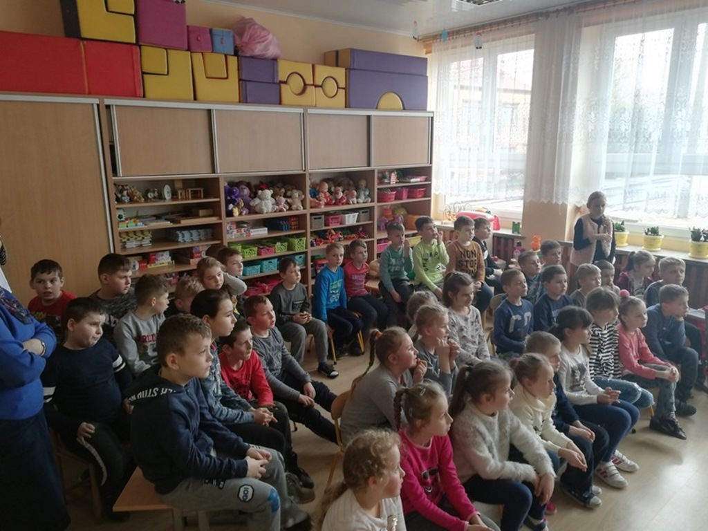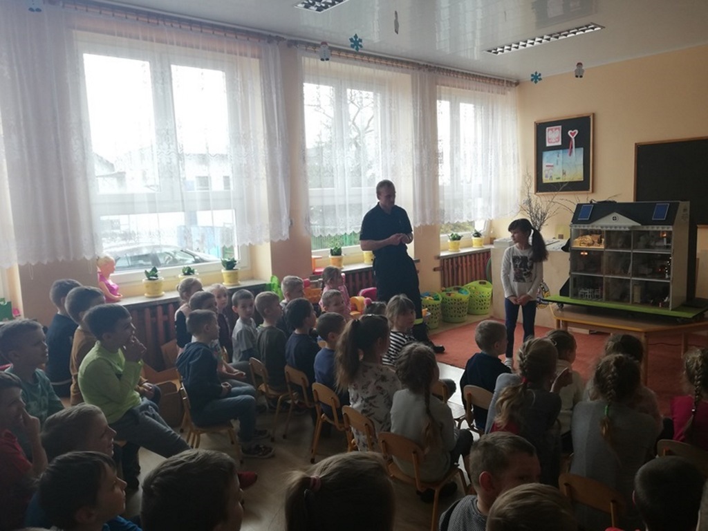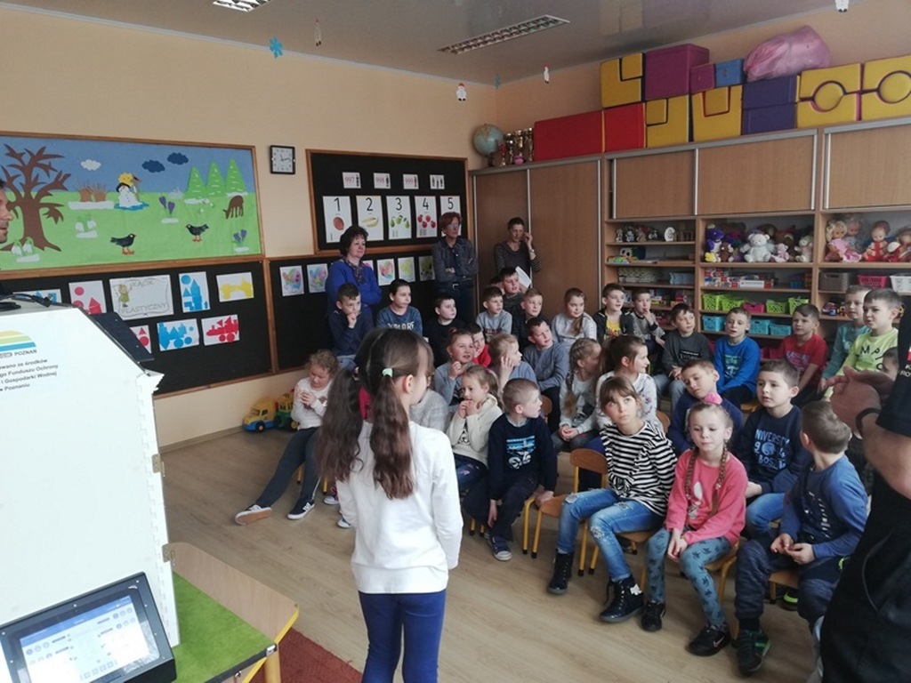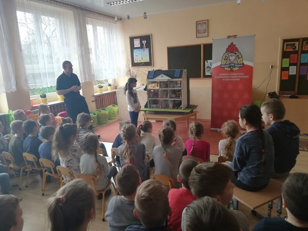 Dnia 11 marca 2019r. naszą szkołę odwiedzili strażacy z Komendy Powiatowej Straży Pożarnej w Krotoszynie. Pojawili się z niezwykłym wynalazkiem – MOBILNY SYMULATOR ZAGROŻEŃ. Gdy tylko dzieci zobaczyły ten niezwykły przedmiot zadawały mnóstwo pytań. Mogły się przekonać jak wiele potencjalnych zagrożeń czeka w naszych domach. Wystarczy bowiem chwila nieuwagi i braku skupienia przy korzystaniu z różnych urządzeń domowych by wywołać pożar. Symulator wyposażony był w czujnik dymu czadu, które natychmiast alarmowały domowników o tym, gdy pojawiło się niebezpieczeństwo. Zagrożenia zaprezentowane za pomocą symulatora w przystępny i rzeczowy sposób uświadomiły dzieciom jak niewiele trzeba by wywołać pożar.