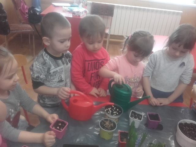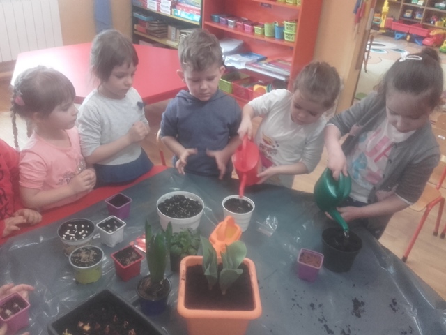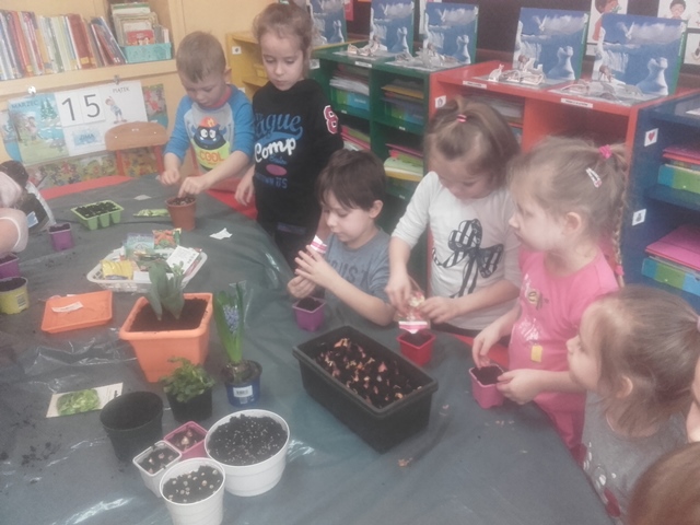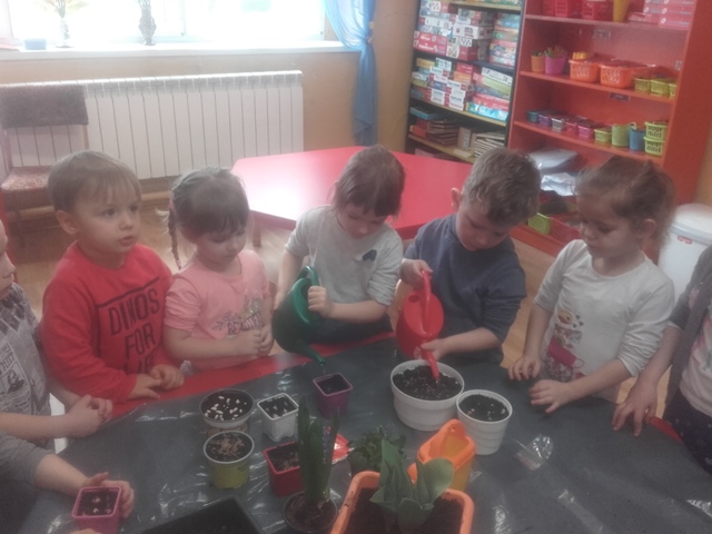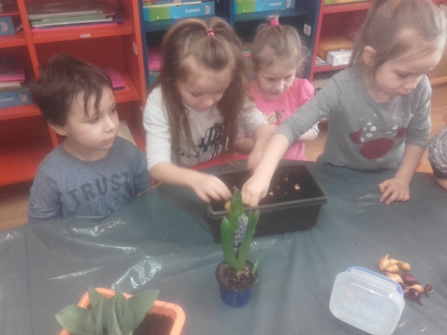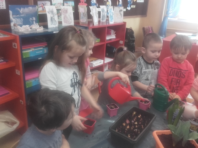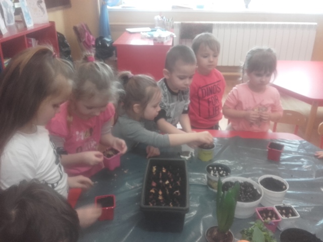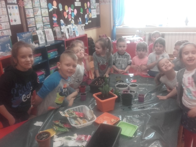 Wraz z początkiem wiosny przedszkolaki rozpoczęły pierwsze „prace ogrodnicze.” Dzieci uczyły się jak sadzić nasiona, cebulki kwiatowe oraz dowiedziały się od czego zależy wzrost roślin. Podczas „wiosennych zajęć” sadziliśmy m.in. szczypiorek, sałatę, rzeżuchę i fasolę, a także wiosenne kwiatki: hiacynty i tulipany.Wszystkie maluchy na pewno będą pielęgnować nasz ogródek i obserwować wzrost roślin.