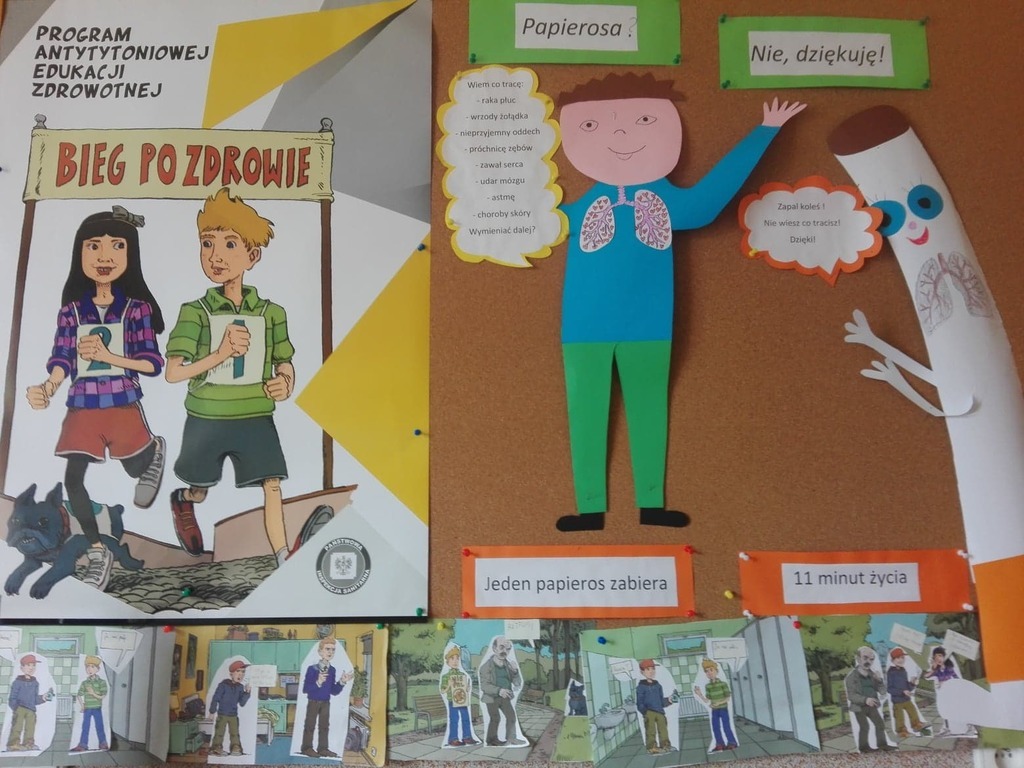 Uczniowie klasy IV uczestniczyli w cyklu spotkań edukacyjnych realizując program antytytoniowej edukacji zdrowotnej ,,Bieg po zdrowie”, mającego na celu zwiększyć ich wiedzę i umiejętności na temat zdrowia w kontekście szkodliwości palenia papierosów. Otrzymali w tym celu specjalnie przygotowane zeszyty ćwiczeń: atrakcyjne, bogato ilustrowane. Zajęcia w programie realizowane były za pomocą różnorodnych metod aktywizujących. Podstawą zajęć było stymulowanie kreatywności i aktywności uczniów. Zdobytą wiedzę i umiejętności będą mogli stosować w życiu codziennym. Na zakończenie programu "pobiegli" na basen, bo... "Pływanie to zdrowie".